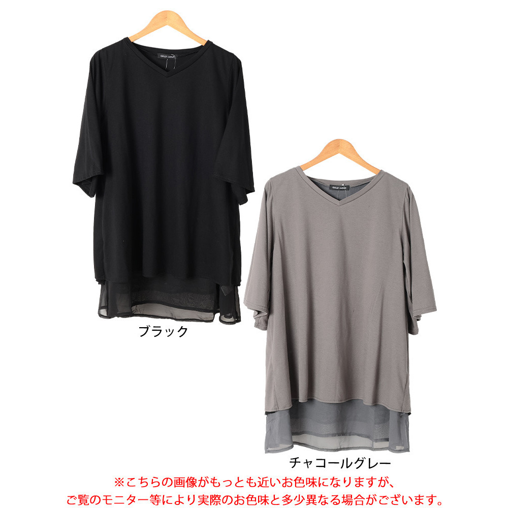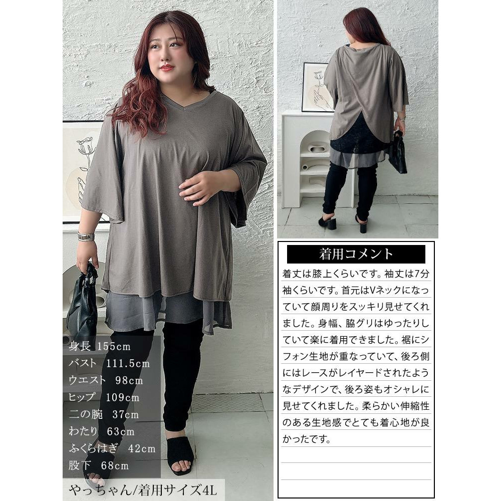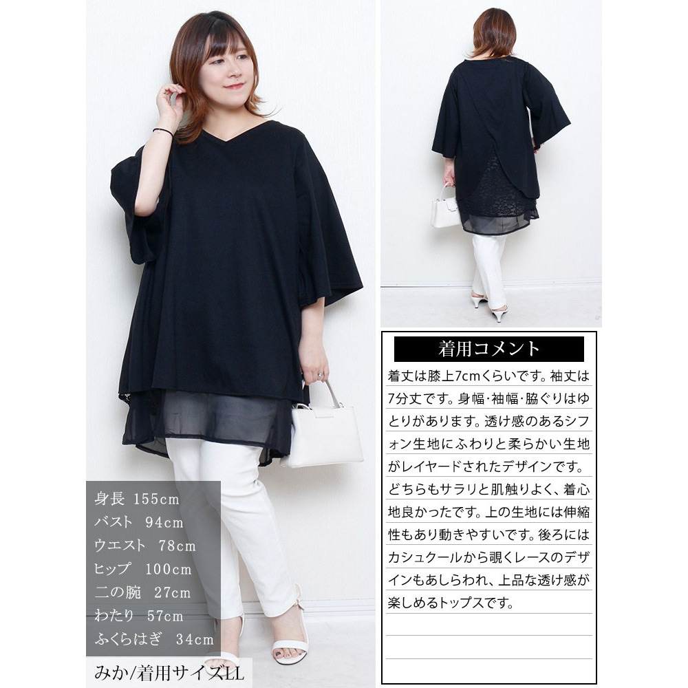 サイズ表記 LL 3L 4L 5L 着丈(前/後) 75/85cm 76/86cm 77/87cm 78/88cm 身幅 56cm 59cm 62cm 65cm 首幅 27cm 27cm 28cm 28cm 肩幅 40cm 42cm 44cm 46cm 袖丈 40cm 40cm 41cm 41cm 袖口幅 37cm 38cm 39cm 40cm 裾幅 84cm 87cm 90cm 93cm