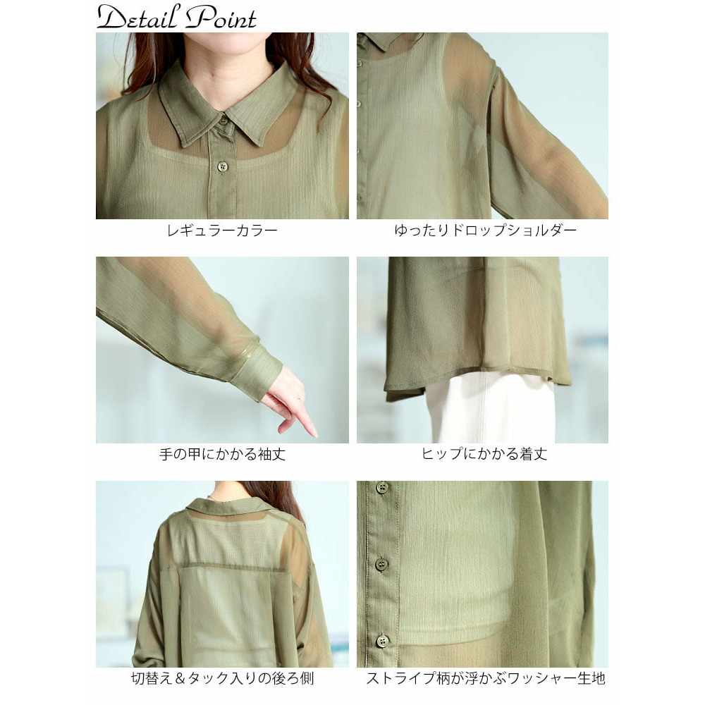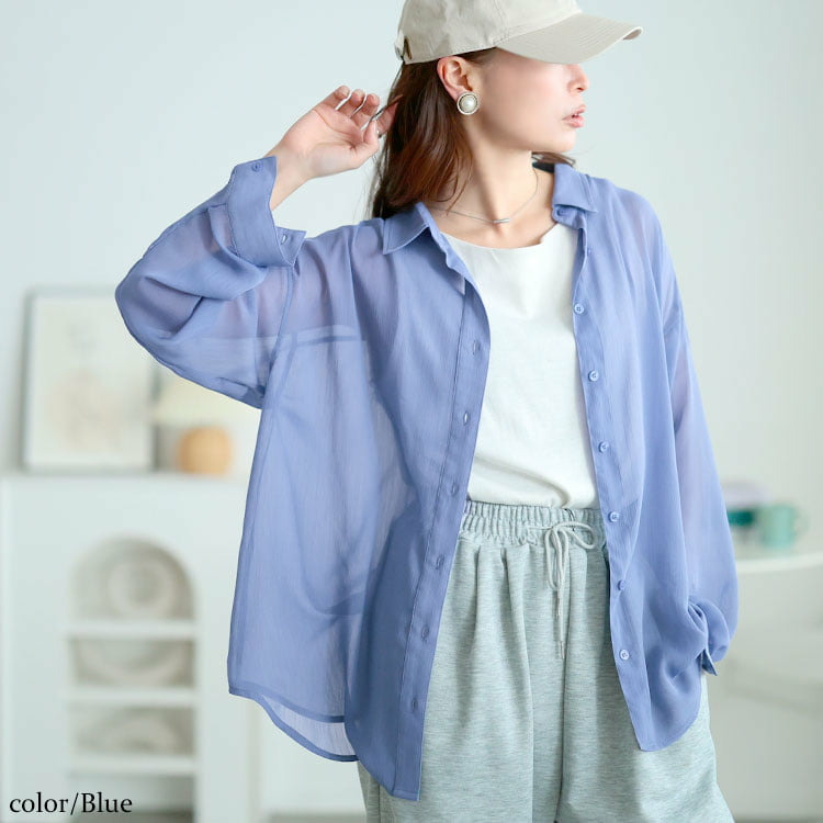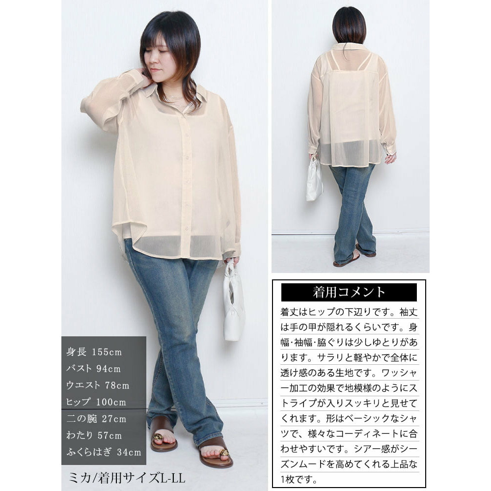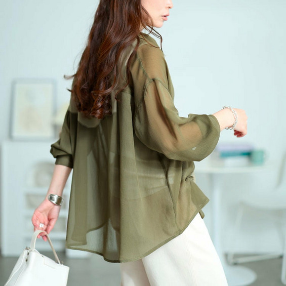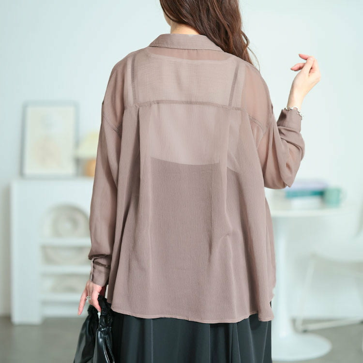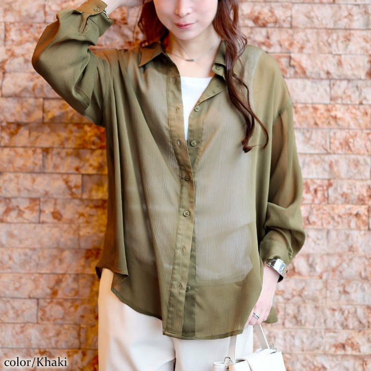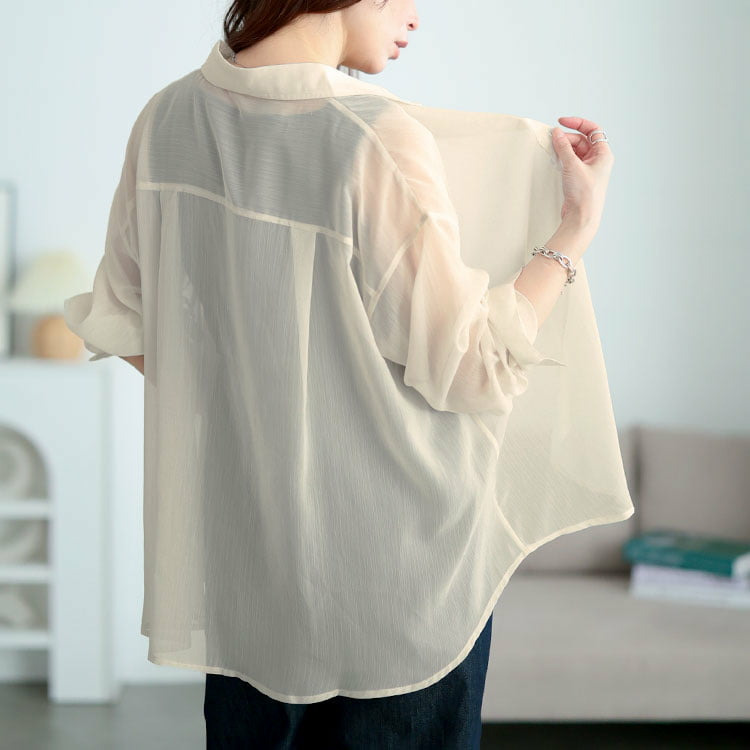 軽やかな透け感が魅力のワッシャーシアールーズシャツです。