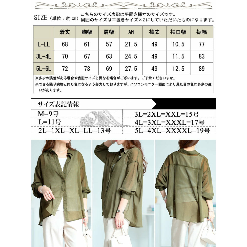 サイズ表記 L-LL 3L-4L 5L-6L 着丈 72cm 68cm 70cm 胸幅 73cm 61cm 67cm 肩幅 69cm 57cm 63cm アームホール 27.5cm 21.5cm 24.5cm 袖丈 49cm 49cm 49cm 袖口幅 12.5cm 10.5cm 11.5cm 裾幅 89cm 77cm 83cm