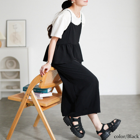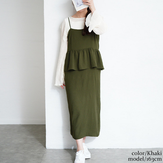 ウエスト部分のペプラムフリルが女性らしい印象を放つ、キャミソールワンピース。まるでセットアップのようなシルエットで、インナーに重ねるだけでスタイリングが完成。ひんやりタッチの生地だから、汗ばむ季節も心地よく、これからの季節にぴったりな一着。