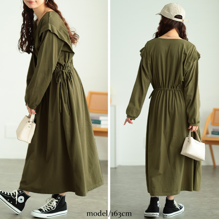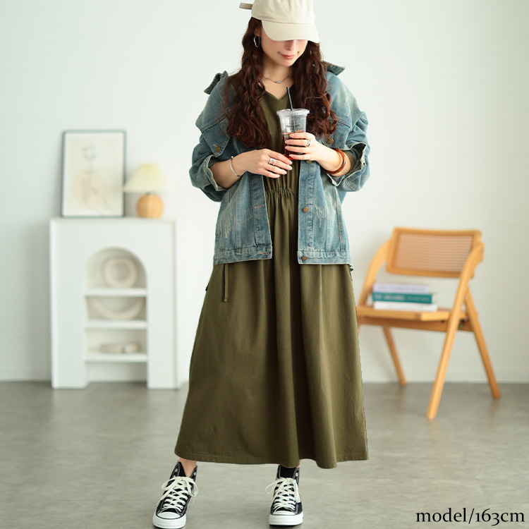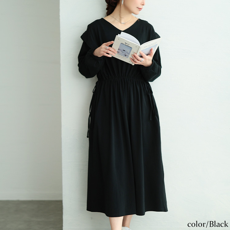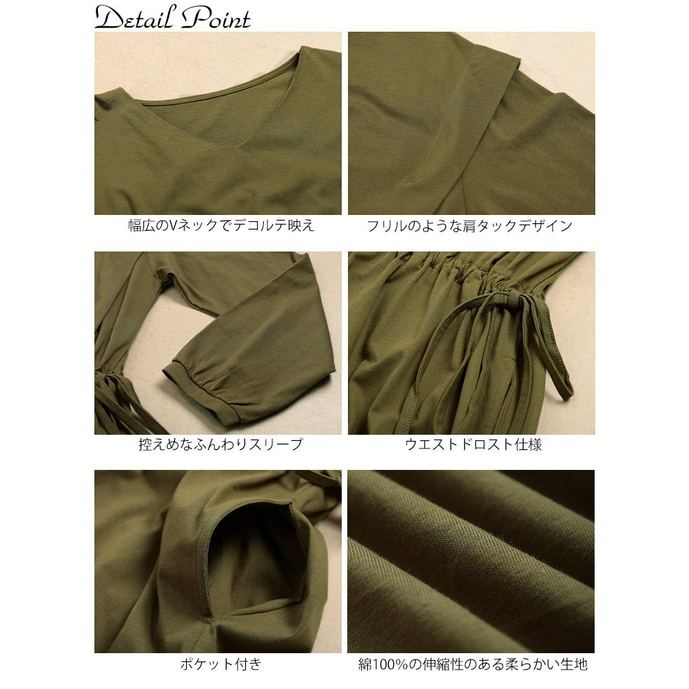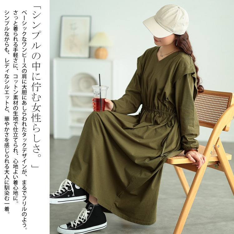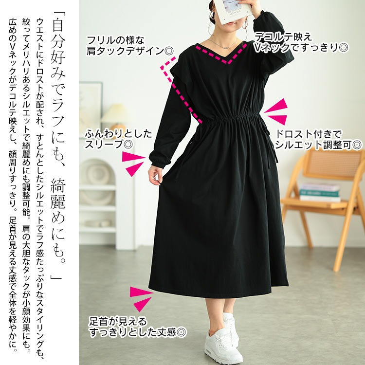 ウエストにドロストが配され、すとんとしたシルエットでラフ感たっぷりなスタイリングも、絞ってメリハリあるシルエットで綺麗めにも調整可能。肩の大胆なタックが小顔効果にも。広めのVネックでデコルテ映えし、顔周りすっきり。足首が見える丈感で全体を軽やかに。