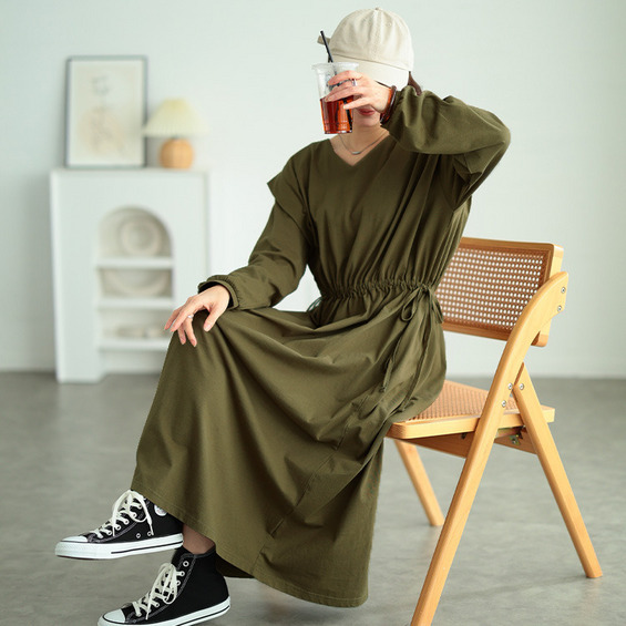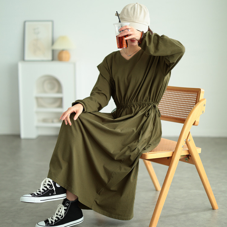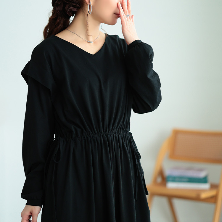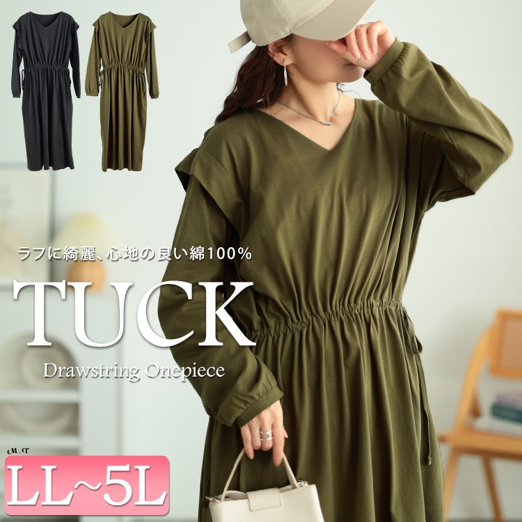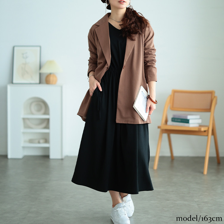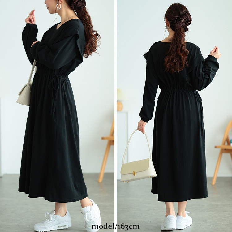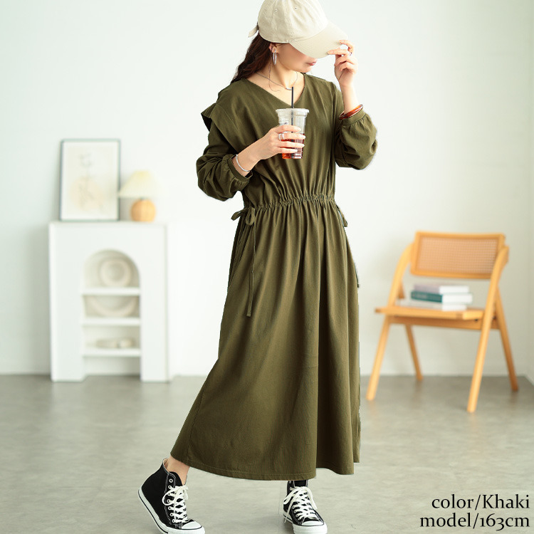 ウエストにドロストが配され、すとんとしたシルエットでラフ感たっぷりなスタイリングも、絞ってメリハリあるシルエットで綺麗めにも調整可能。肩の大胆なタックが小顔効果にも。広めのVネックでデコルテ映えし、顔周りすっきり。足首が見える丈感で全体を軽やかに。