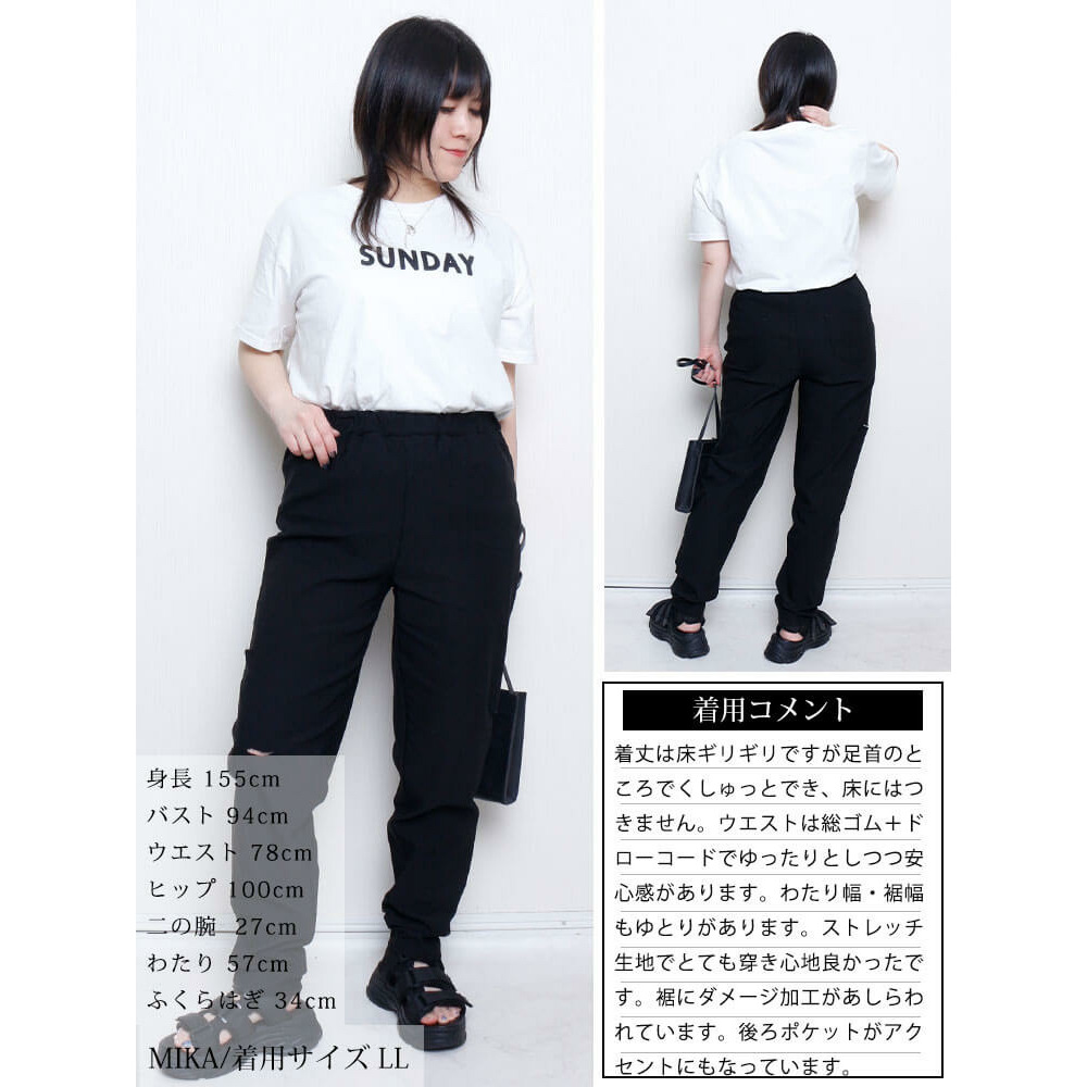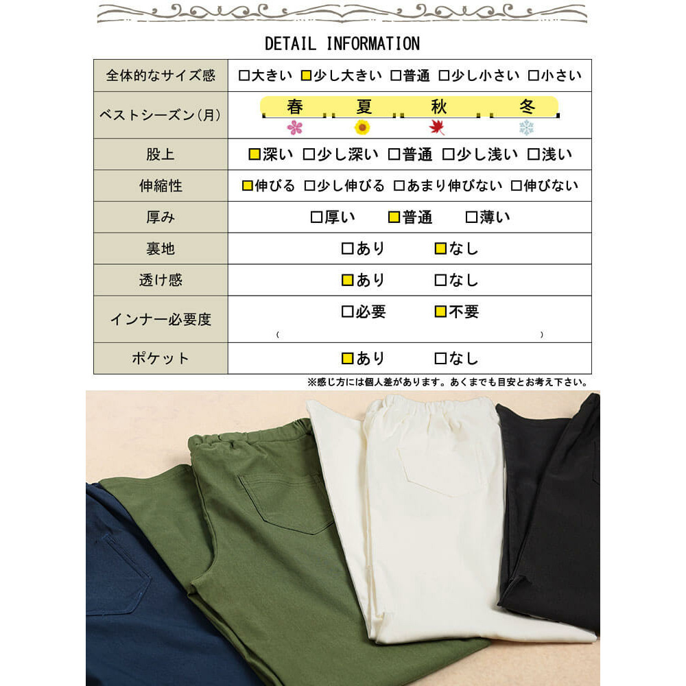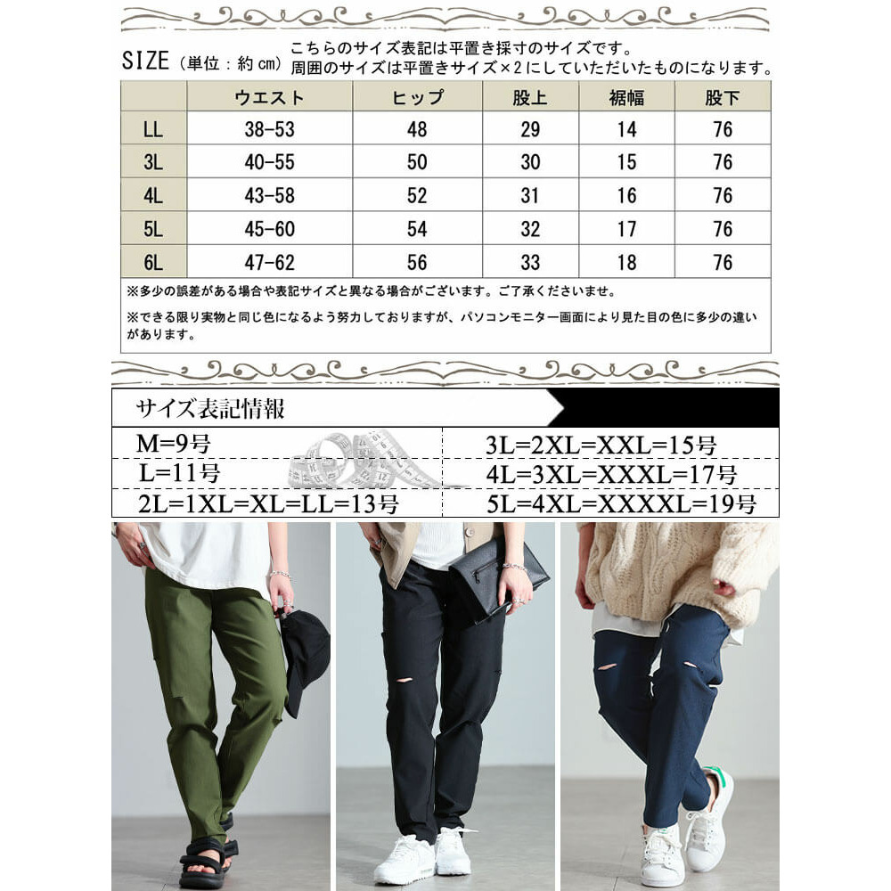 サイズ表記 LL 3L 4L 5L 6L ウエスト 38-53cm 40-55cm 43-58cm 45-60cm 47-62cm ヒップ 48cm 50cm 52cm 54cm 56cm 股上 29cm 30cm 31cm 32cm 33cm 裾幅 14cm 15cm 16cm 17cm 18cm 股下 76cm 76cm 76cm 76cm 76cm