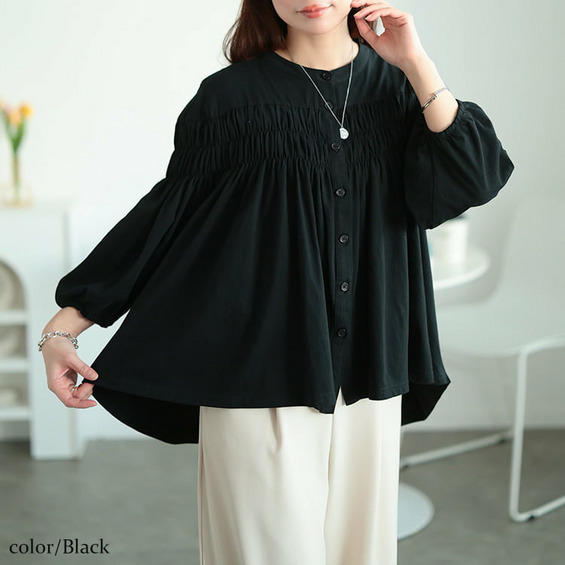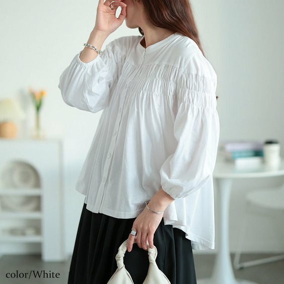 大きいサイズ レディース ピンタックギャザーコットンブラウス
