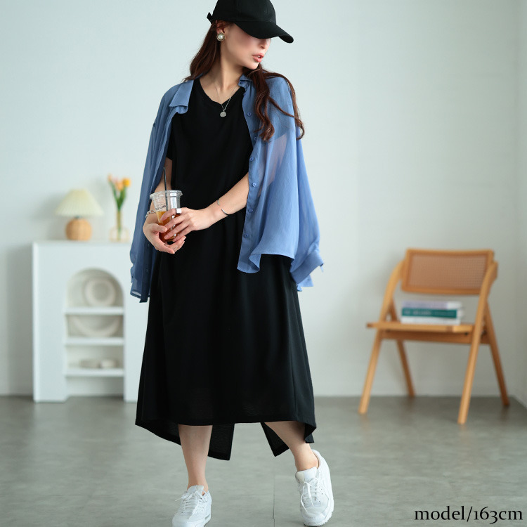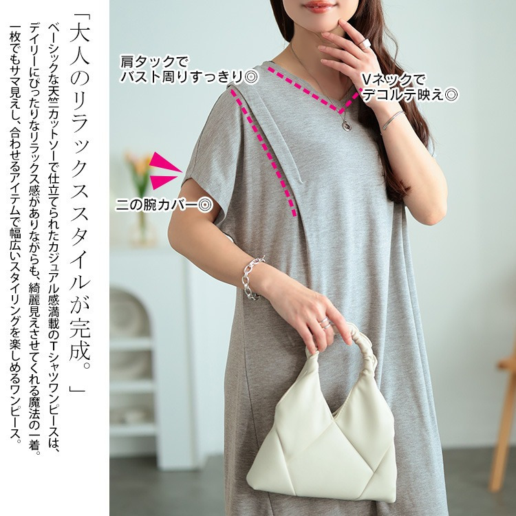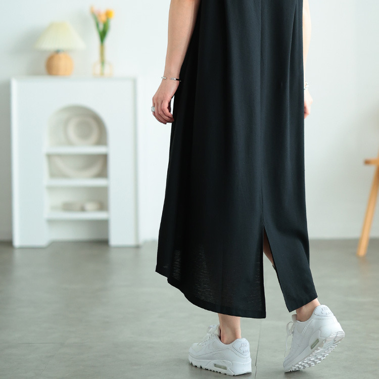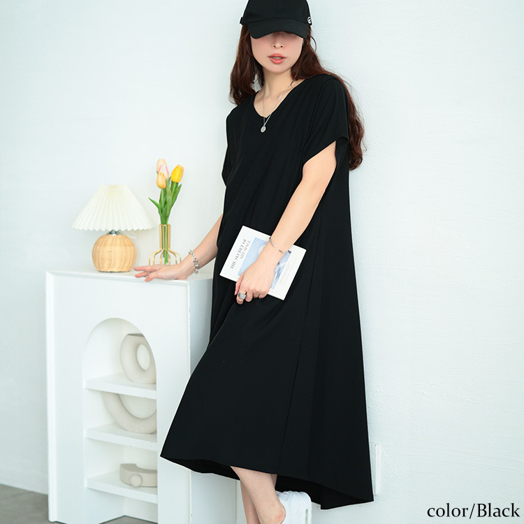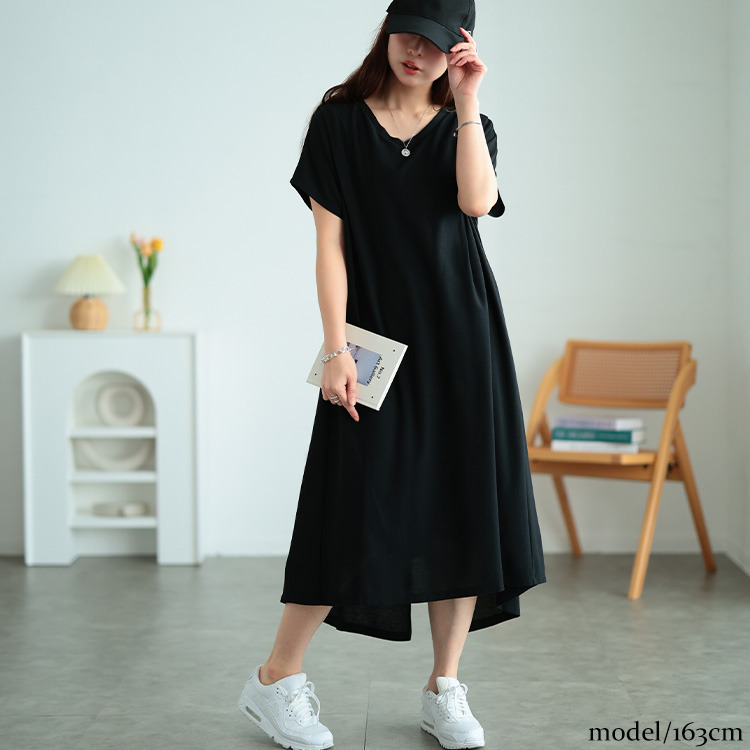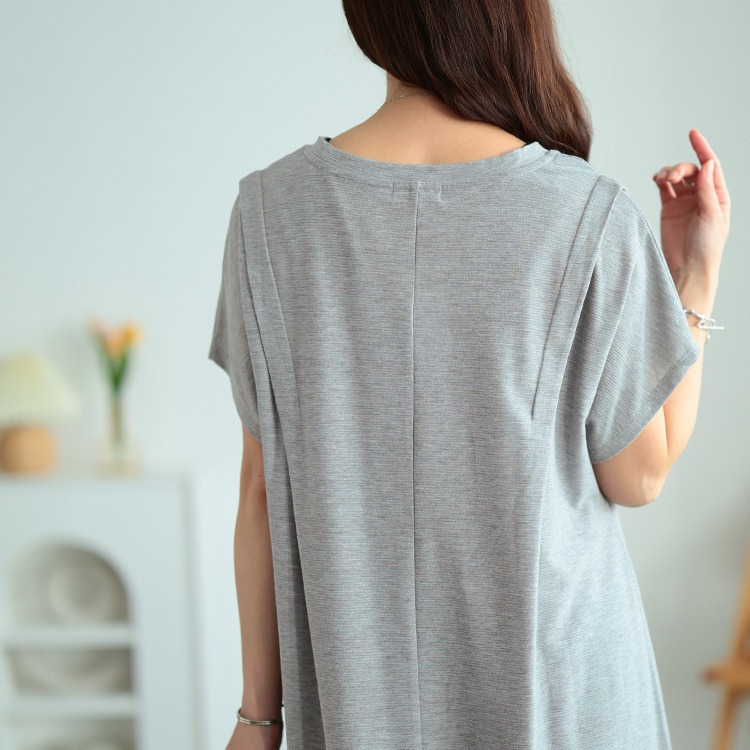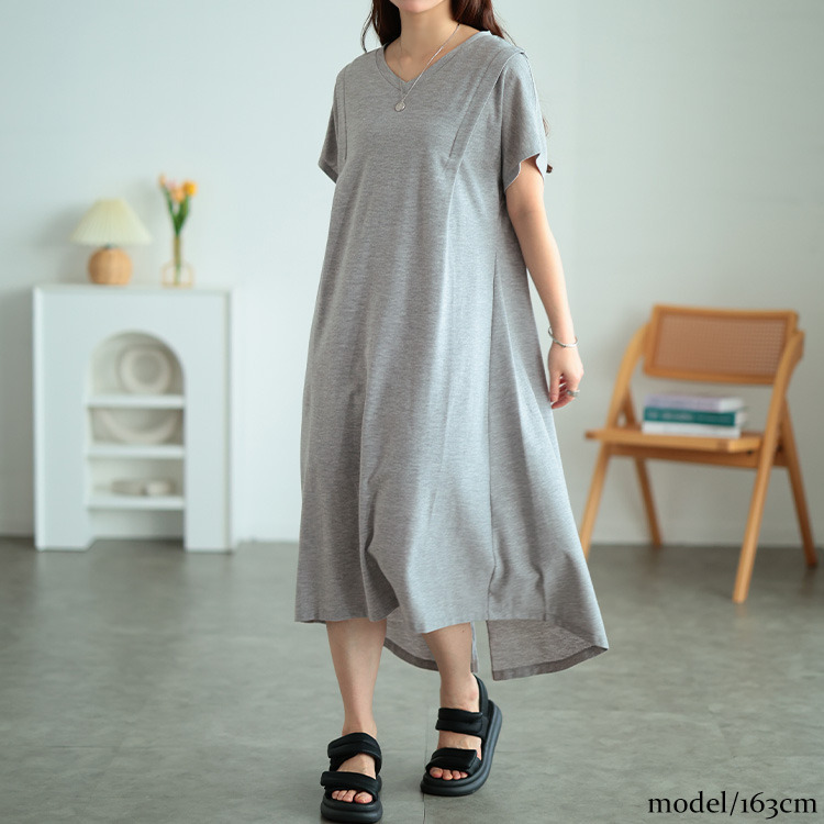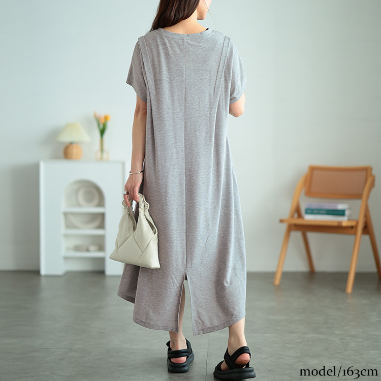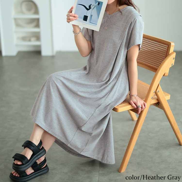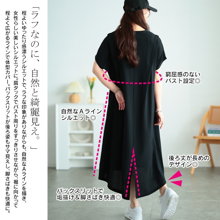 程よいゆったり感漂うシルエットに、ラフな印象がありながらも、自然なAラインを描き、女性らしい美しいシルエットに。肩タックでバスト周りをすっきりさせながら、裾に向かって程よく広がるラインで体型カバー。バックスリットが後ろ姿もサマ見えし、脚さばきも快適に。