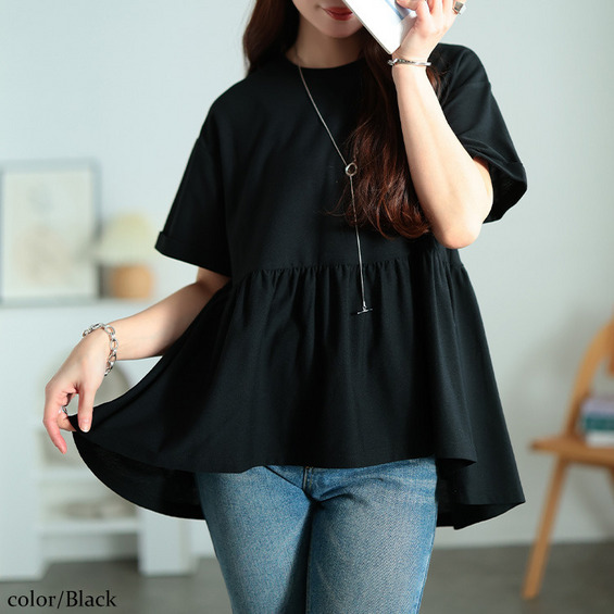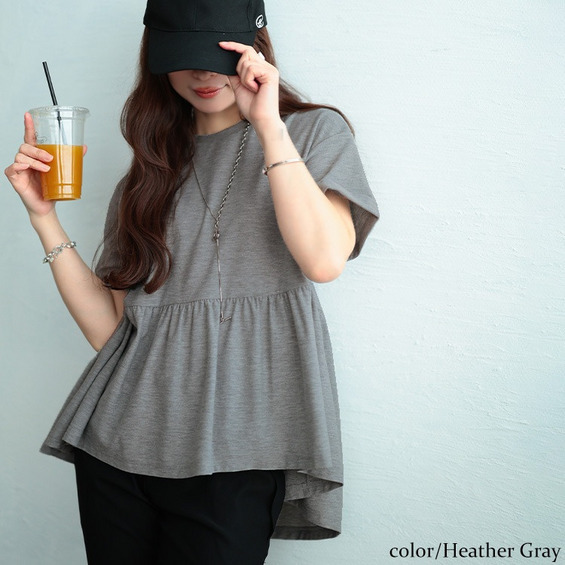 女性らしいペプラムシルエットが、全体にメリハリをプラスし、高めの切り替え位置で脚長効果を発揮します。ふんわりとウエスト・腰・ヒップを包み込み、後ろ丈が長く設定されたデザインだから、気になるヒップもカバー。ゆったりなのに、すっきり見える、頼れる一着。
