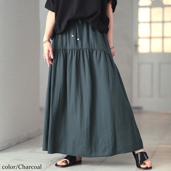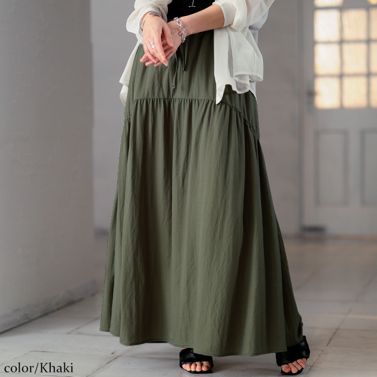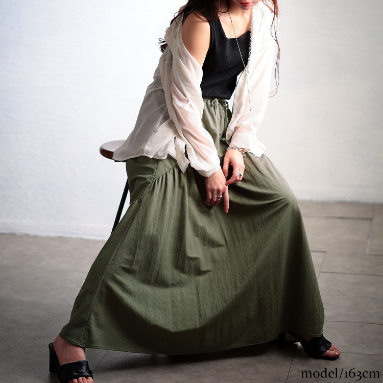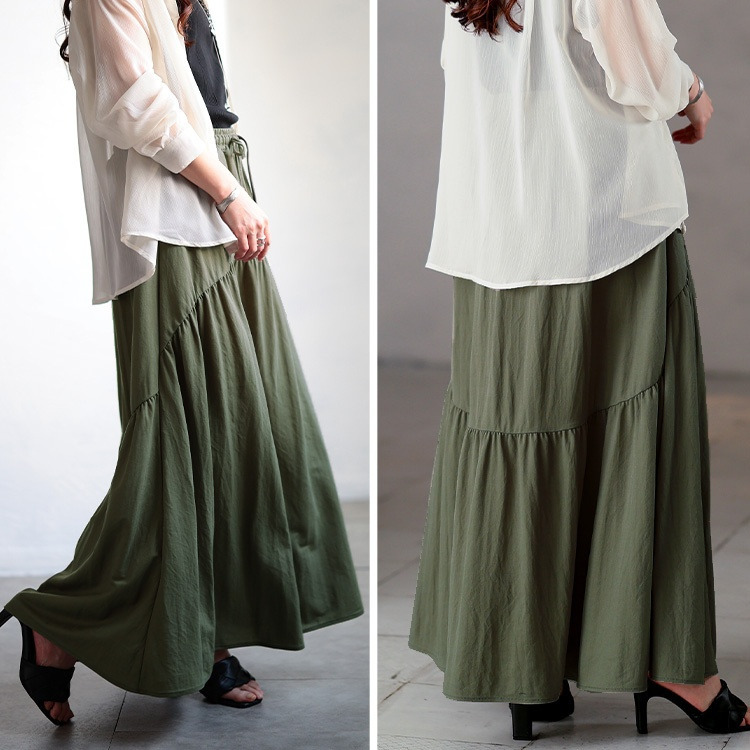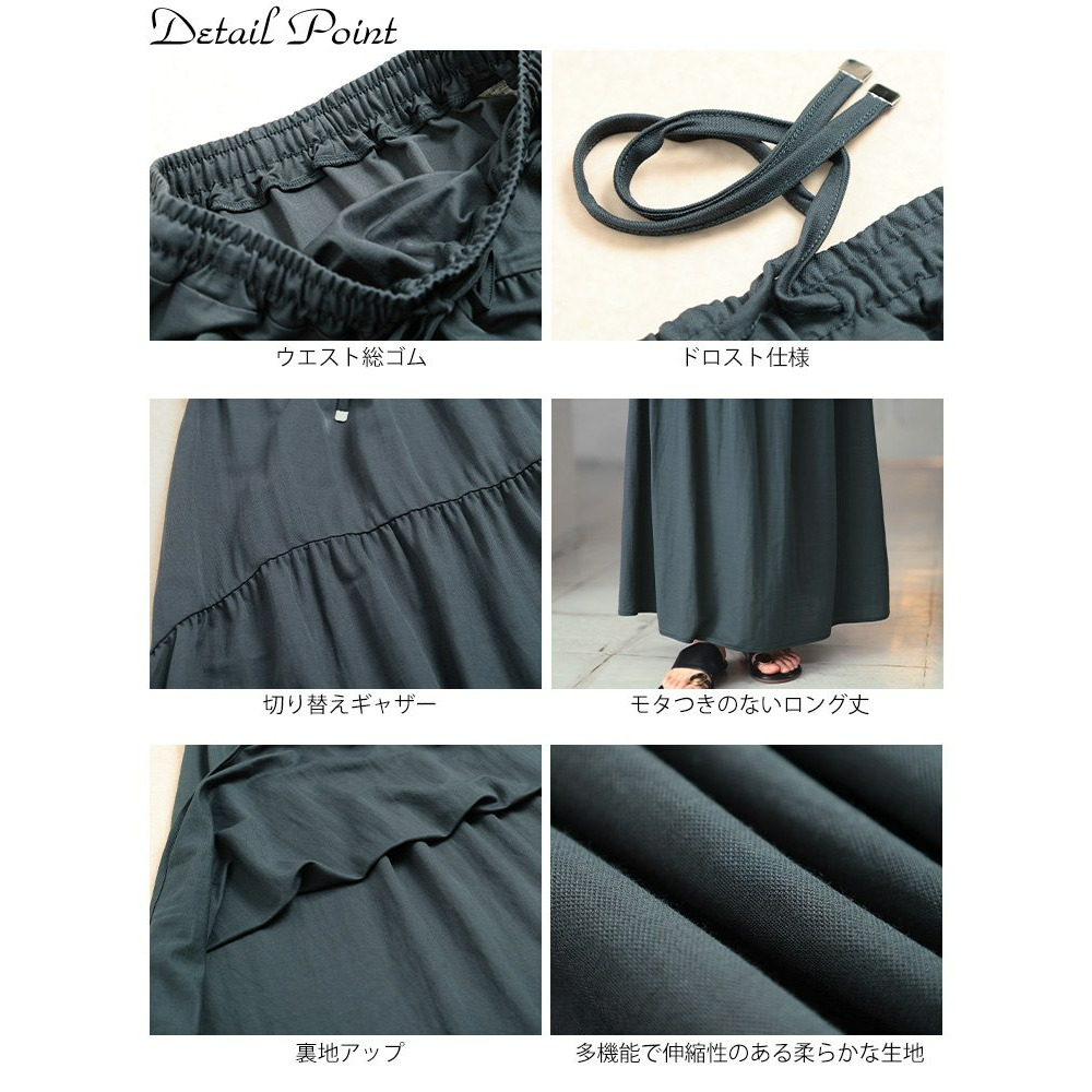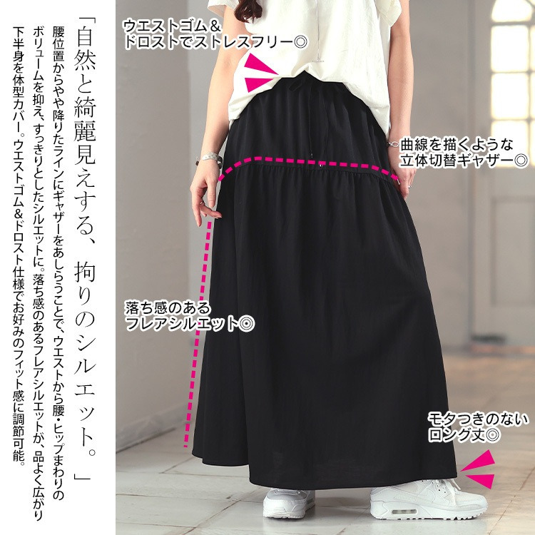 腰位置からやや降りたラインにギャザーをあしらうことで、ウエストから腰・ヒップまわりのボリュームを抑え、すっきりとしたシルエットに。落ち感のあるフレアシルエットが、品よく広がり下半身を体型カバー。ウエストゴム&ドロスト仕様でお好みのフィット感に調節可能。