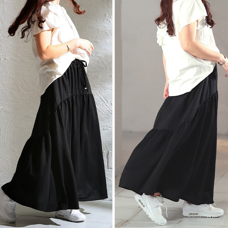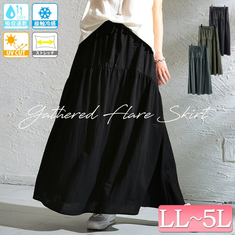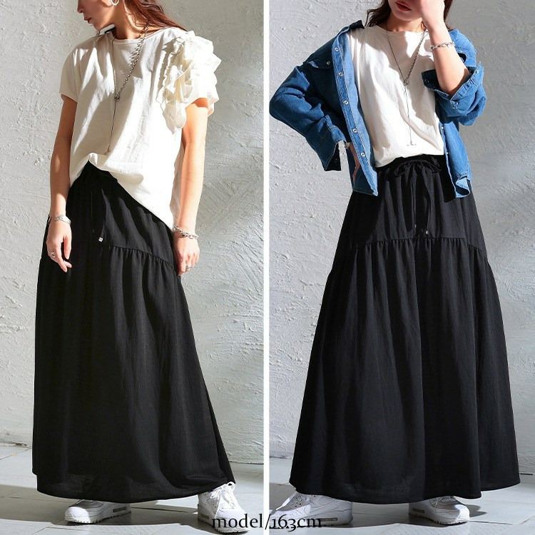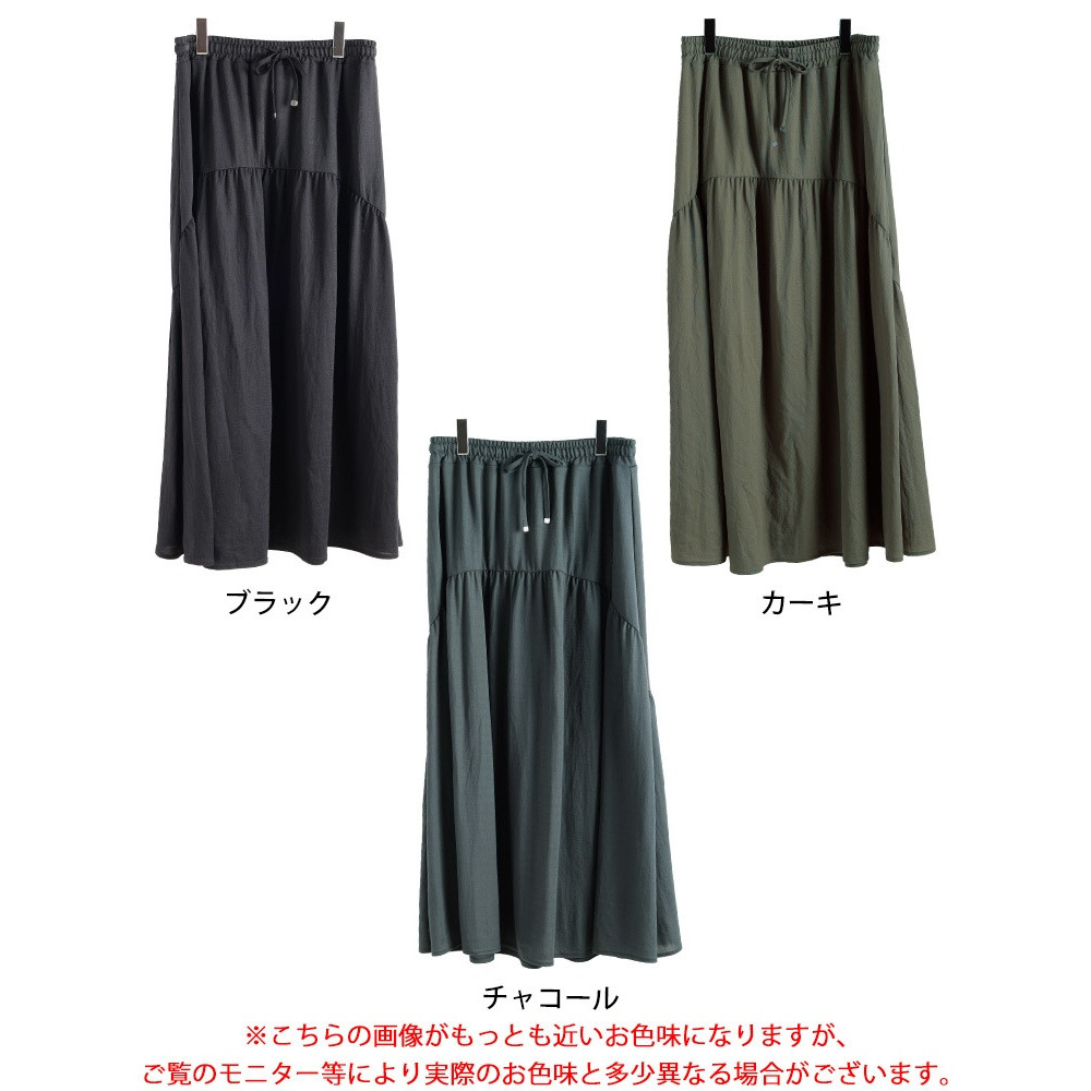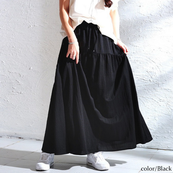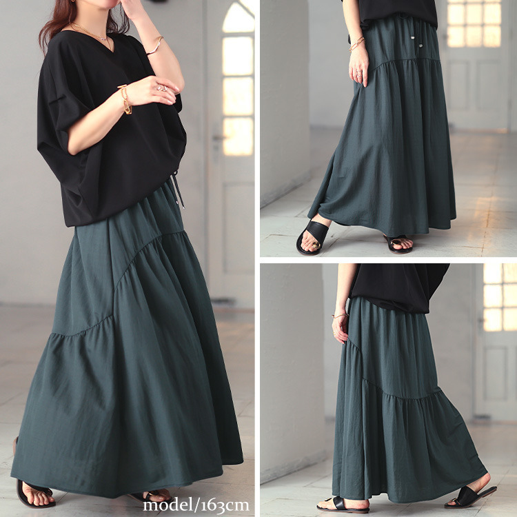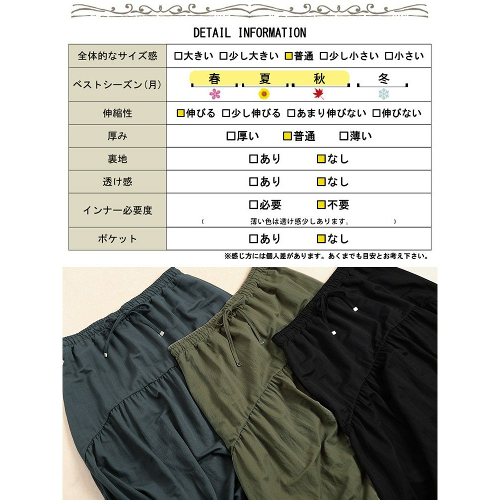 腰位置からやや降りたラインにギャザーをあしらうことで、ウエストから腰・ヒップまわりのボリュームを抑え、すっきりとしたシルエットに。落ち感のあるフレアシルエットが、品よく広がり下半身を体型カバー。ウエストゴム&ドロスト仕様でお好みのフィット感に調節可能。