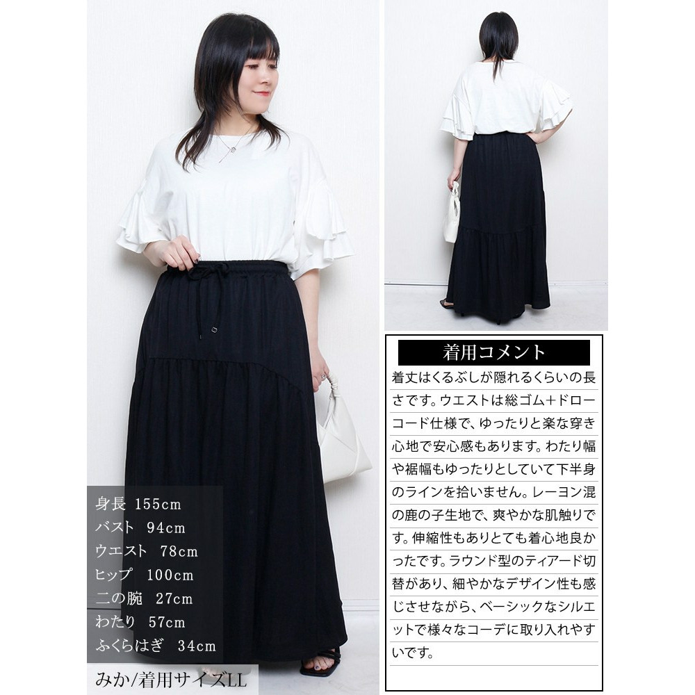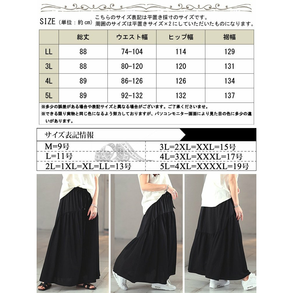 サイズ表記 LL 3L 4L 5L 総丈 88cm 88cm 89cm 89cm ウエスト幅 74-104cm 80-120cm 86-126cm 92-132cm ヒップ幅 114cm 120cm 126cm 132cm 裾幅 129cm 131cm 134cm 137cm