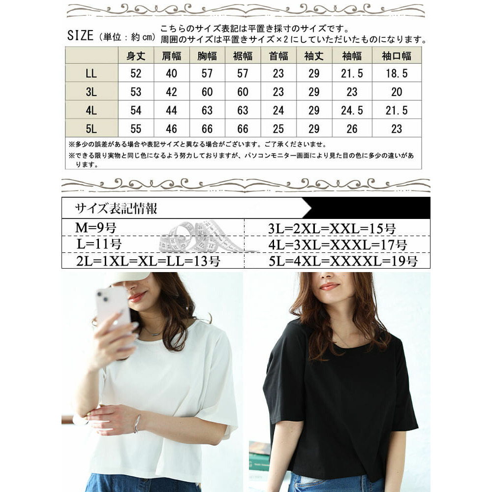 サイズ表記 LL 3L 4L 5L 身丈 52cm 53cm 54cm 55cm 肩幅 40cm 42cm 44cm 46cm 胸幅 57cm 60cm 63cm 66cm 裾幅 57cm 60cm 63cm 66cm 首幅 23cm 23cm 24cm 25cm 袖丈 29cm 29cm 29cm 29cm 袖幅 21.5cm 23cm 24.5cm 26cm 袖口幅 18.5cm 20cm 21.5cm 23cm