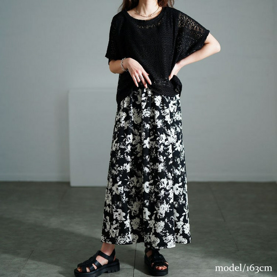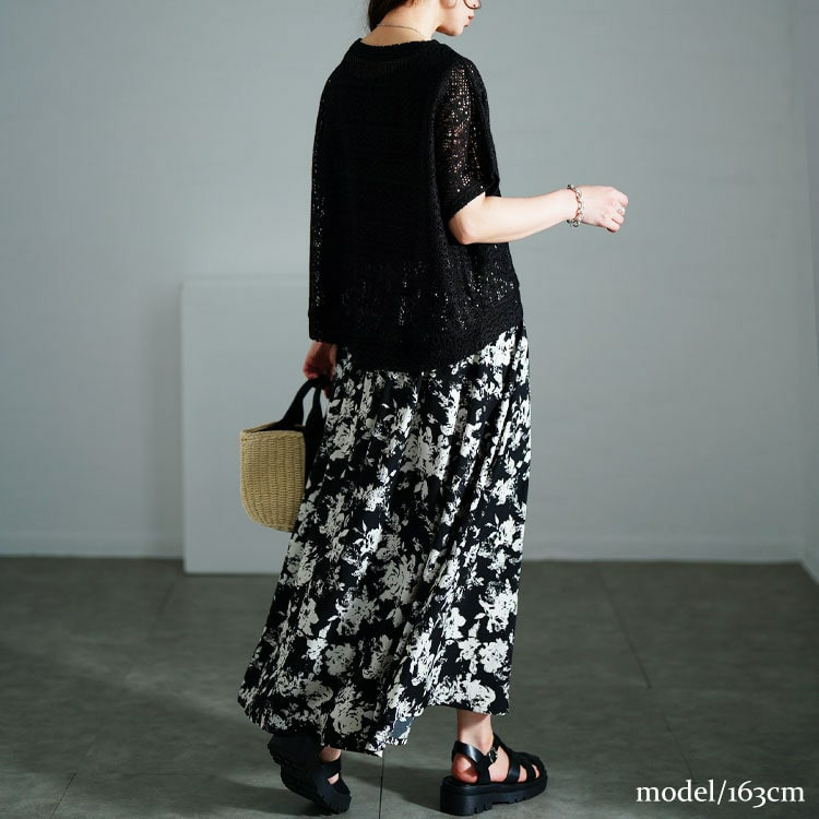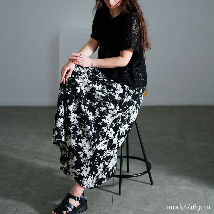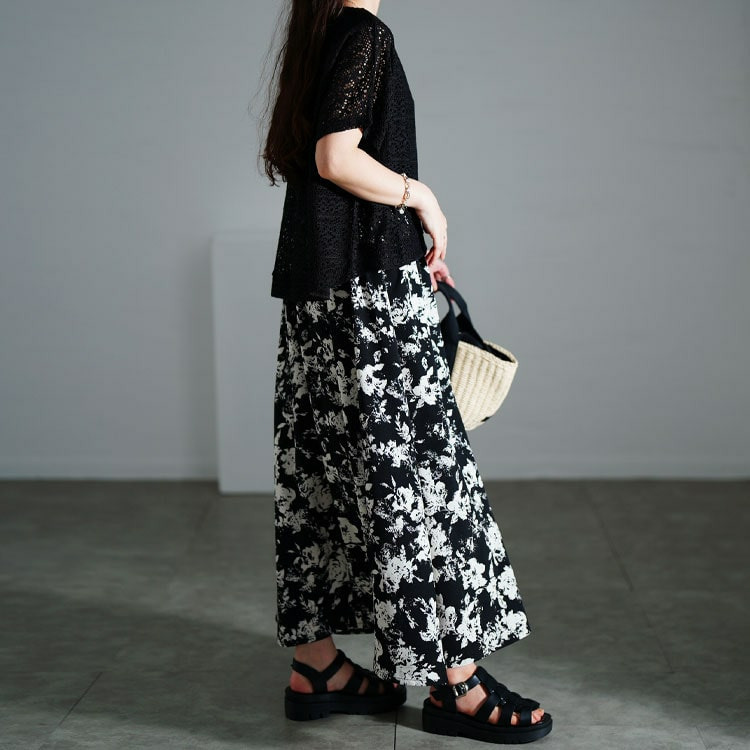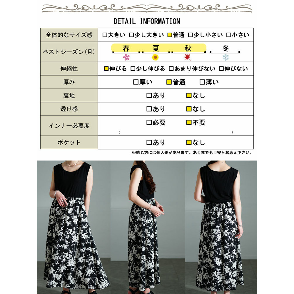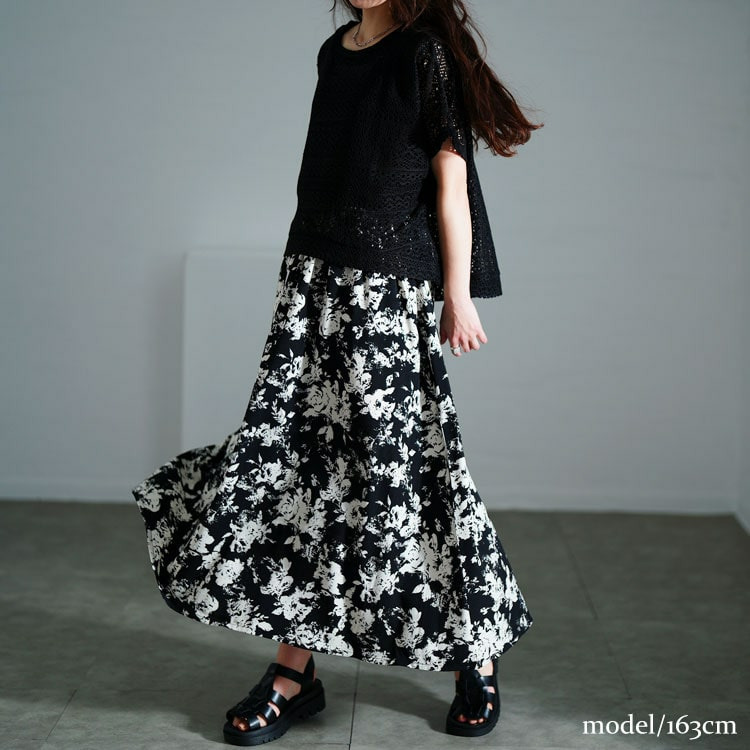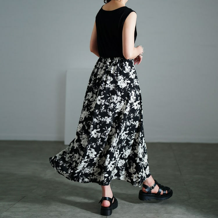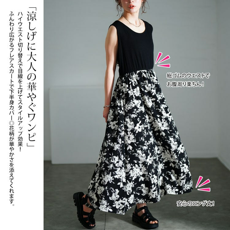ワンピースのウエストはゴムで楽ちん、ふんわり広がる花柄フレアスカートが華やかさを演出します。
