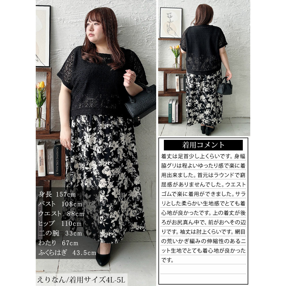• 大きいサイズ レディース かぎ編みニットトップス&花柄ドッキングワンピース2点セット4