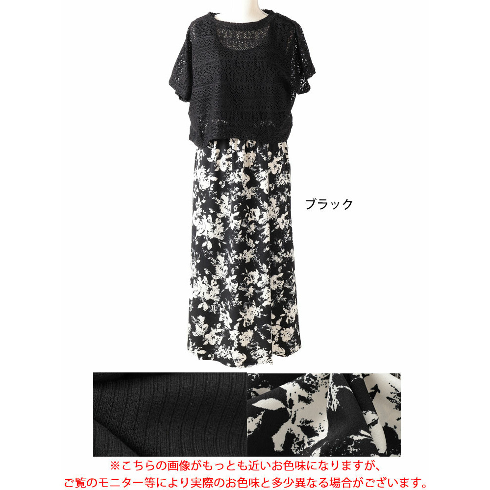 • 大きいサイズ レディース かぎ編みニットトップス&花柄ドッキングワンピース2点セット10
