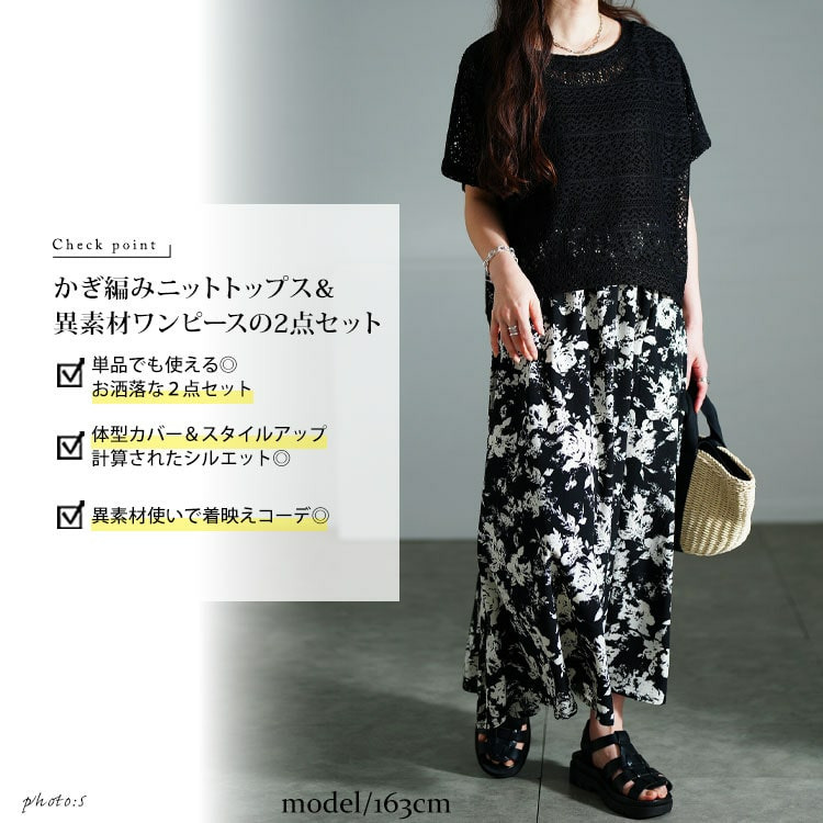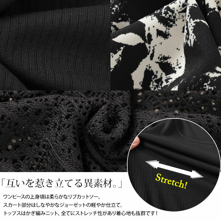 単品でも使える2点セット、かぎ編みニットトップス&異素材ロングワンピース。