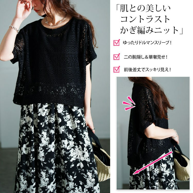 • 大きいサイズ レディース かぎ編みニットトップス&花柄ドッキングワンピース2点セット11