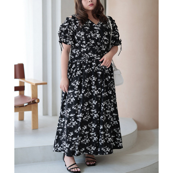 • 大きいサイズ レディース レトロフラワーウエストタックワンピース1