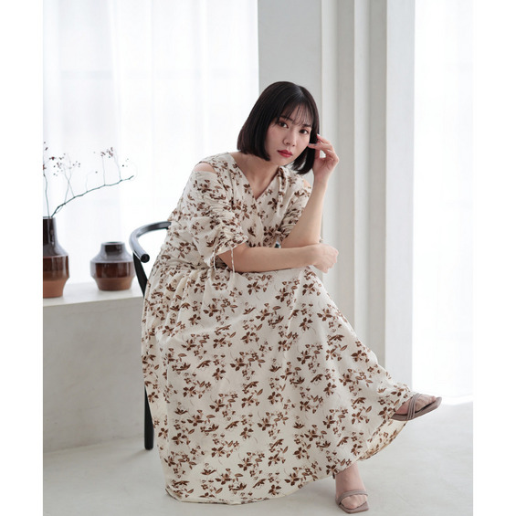 落ち着きのある花柄プリントがエレガントなフレアシルエットのワンピース。