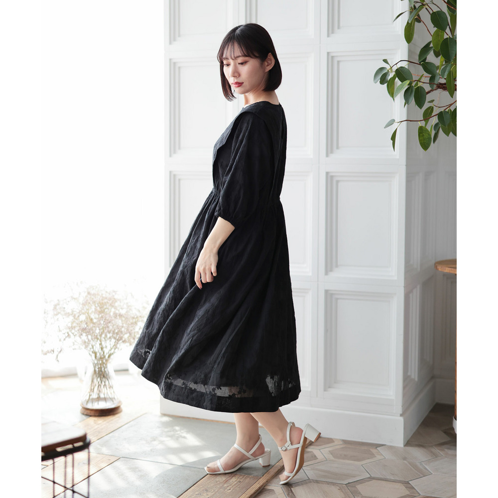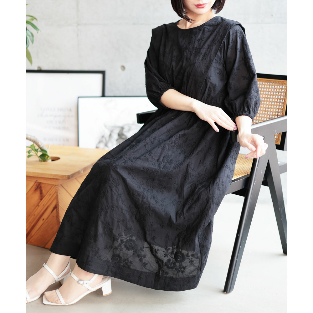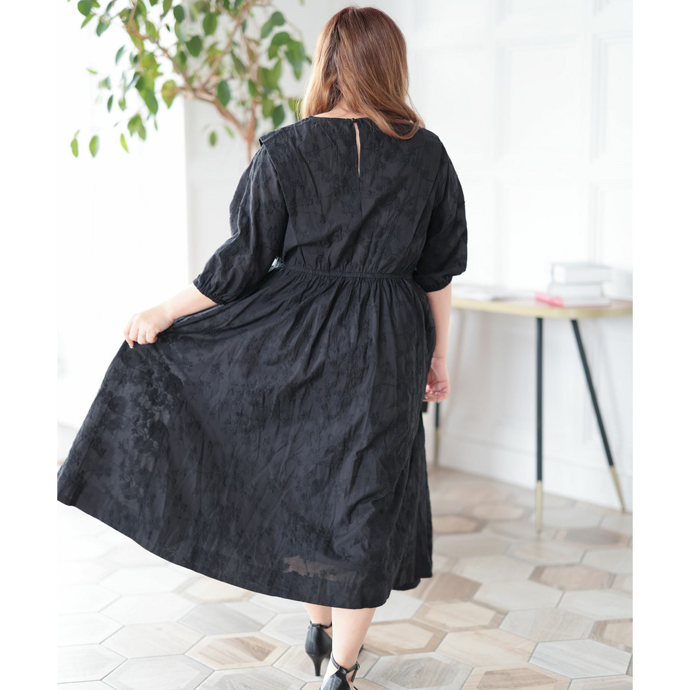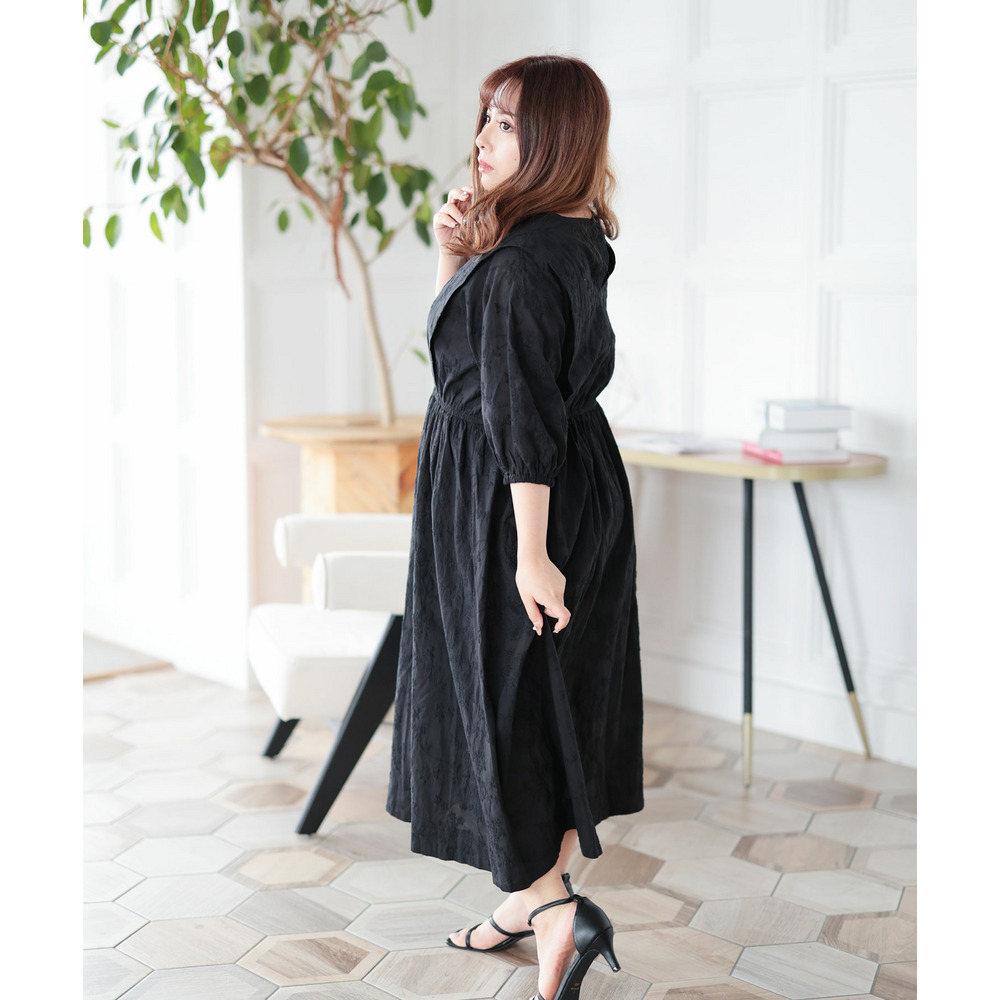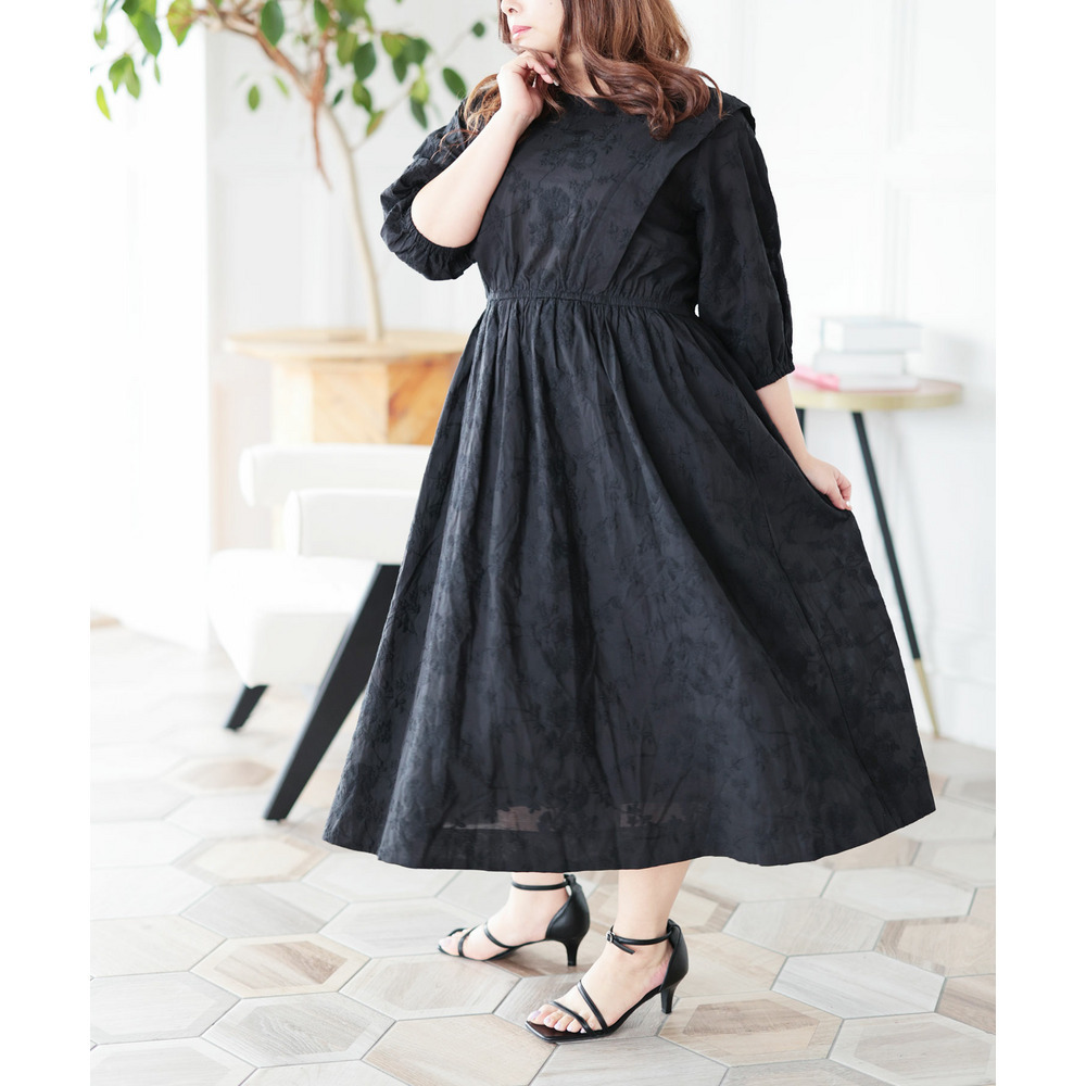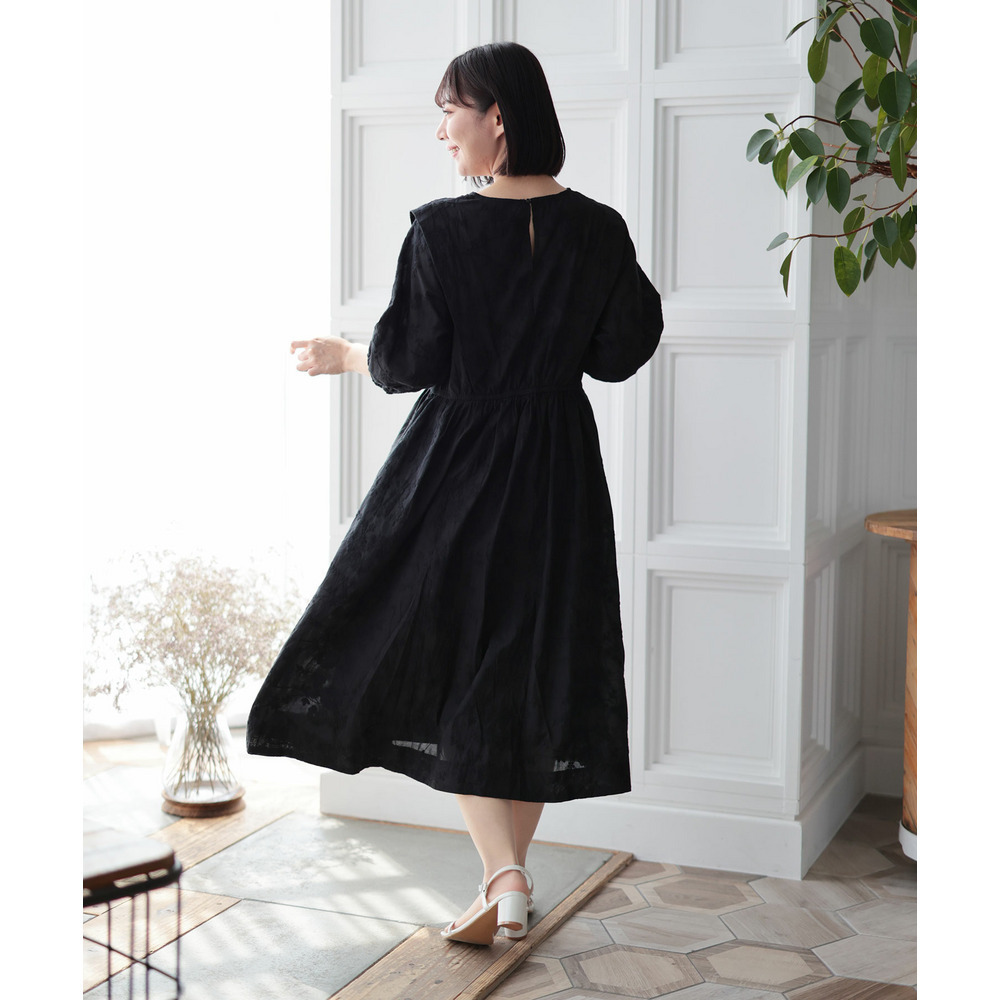 肩にかけて施されたタックが上半身をほっそりと見せてくれて着痩せ効果を演出。