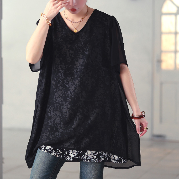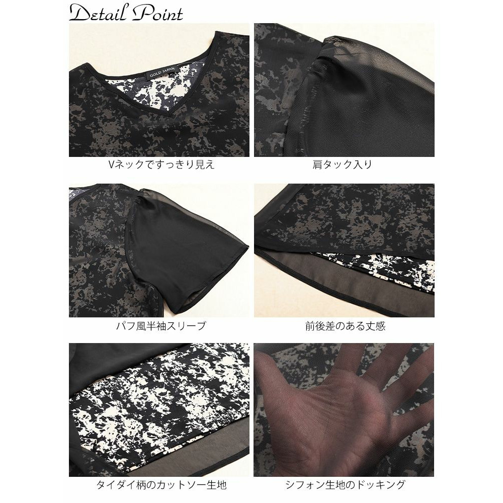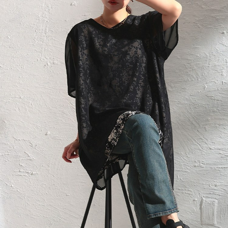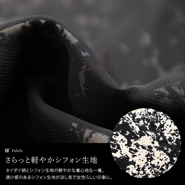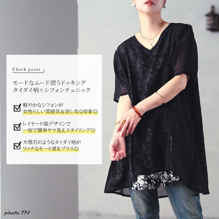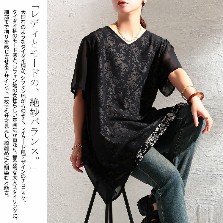 大理石のようなタイダイ柄が、シフォン地からのぞく、レイヤード風デザインのチュニック。タイダイ柄のモード感と、シフォン地の女性らしい雰囲気が重なり、都会的な大人スタイリングに。細部まで拘りを感じさせるデザインで、一枚でサマ見えし、綺麗めにも馴染む万能さ。