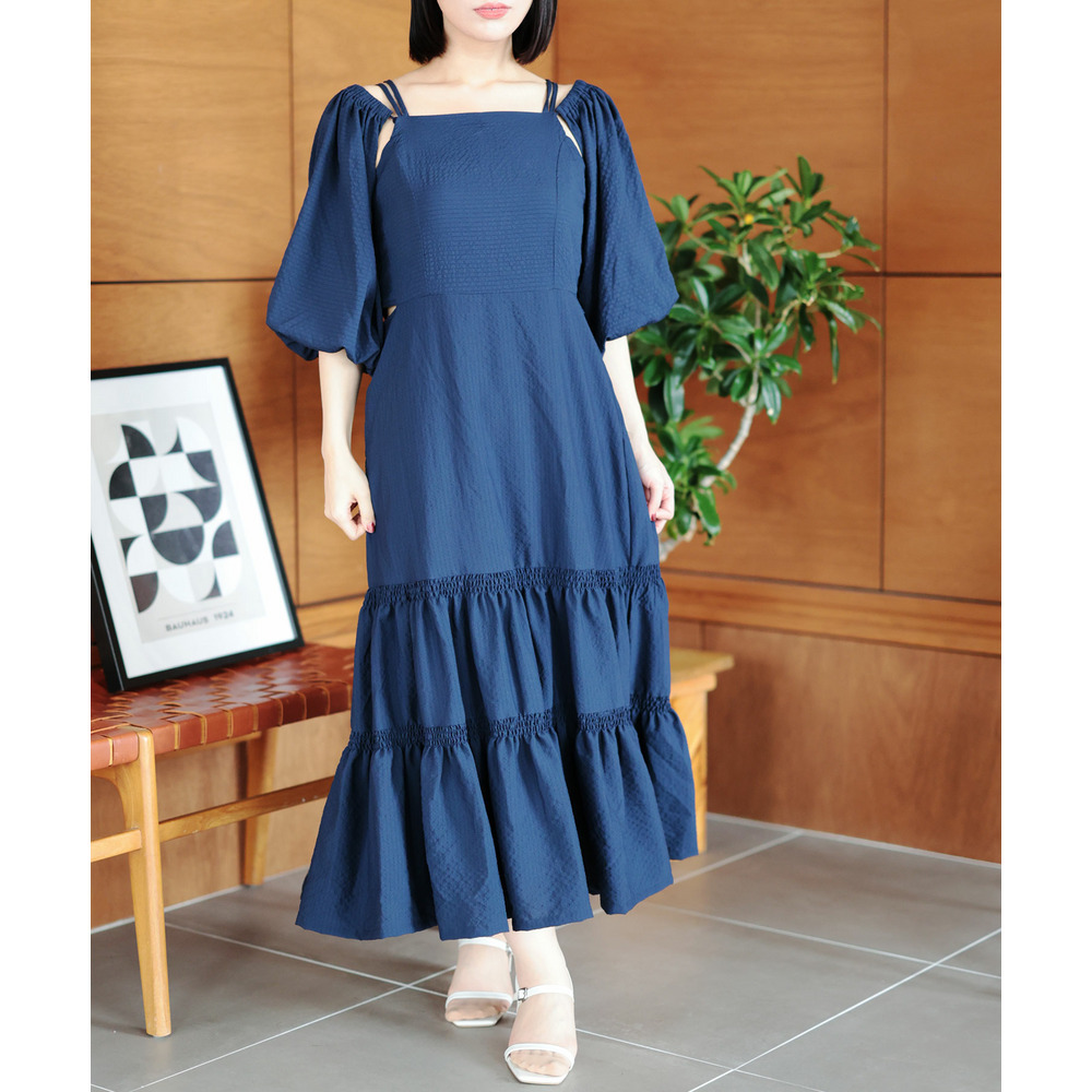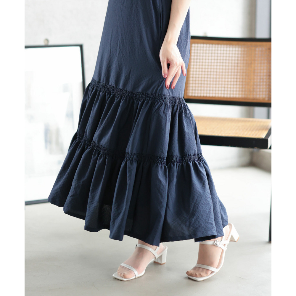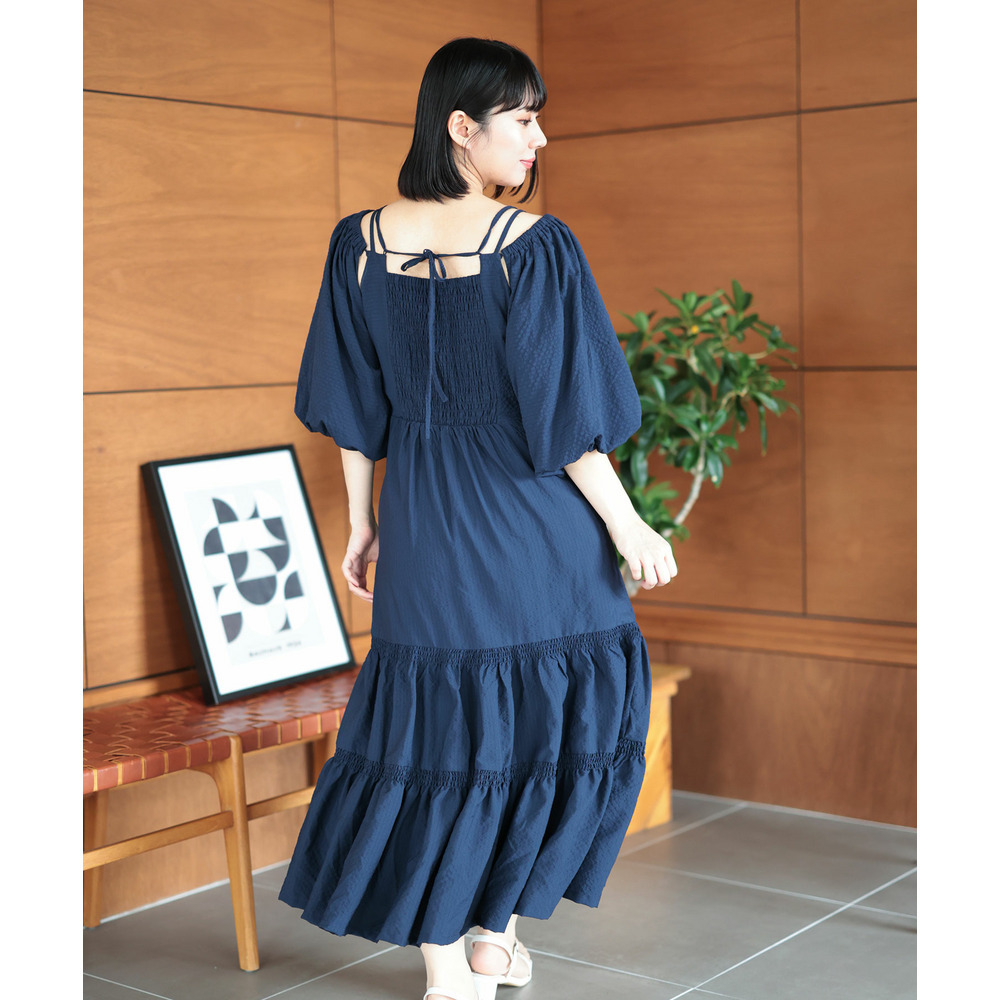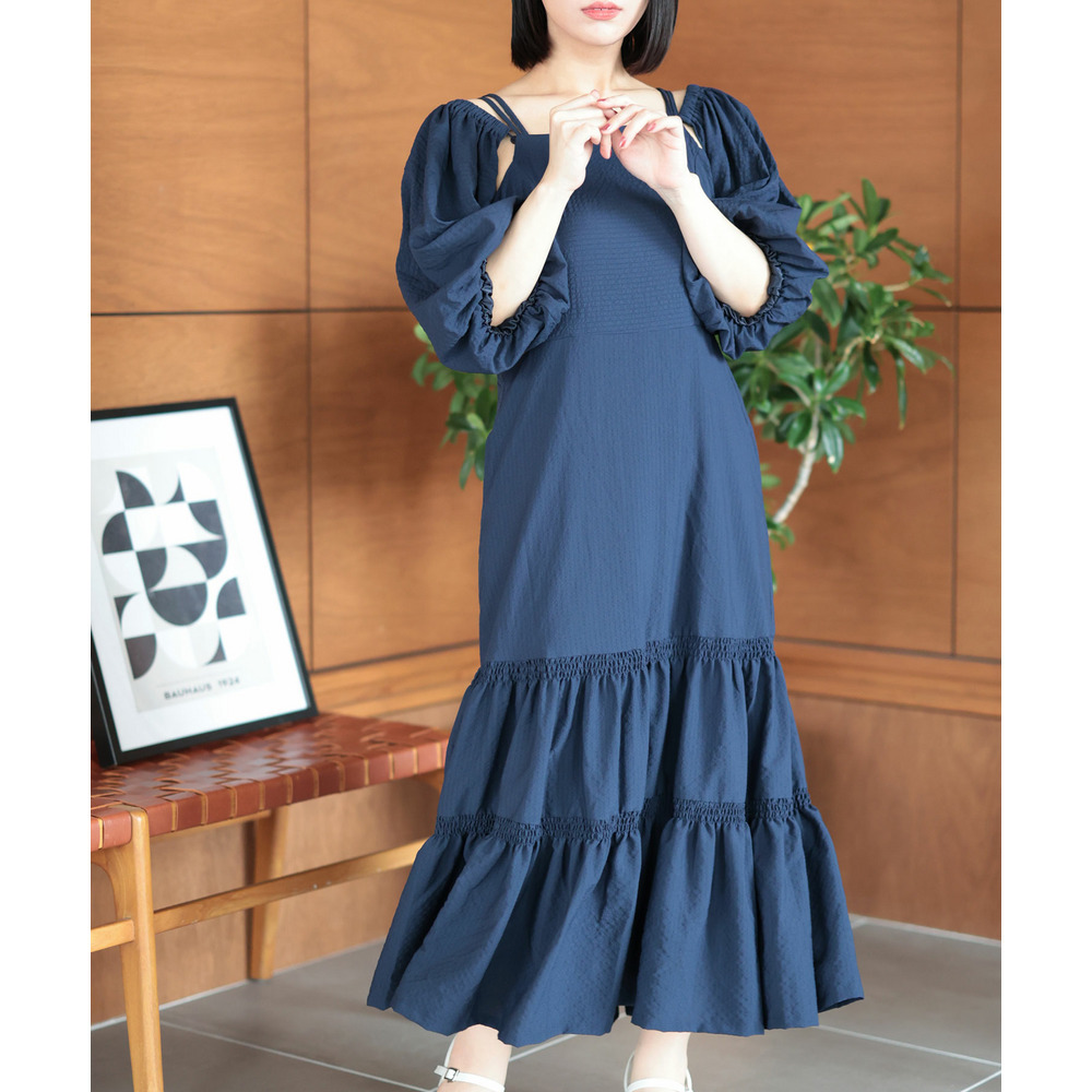 たっぷりと寄せたギャザーと、ふんわり広がるティアードスカートが華やかさと体型カバーを両立。