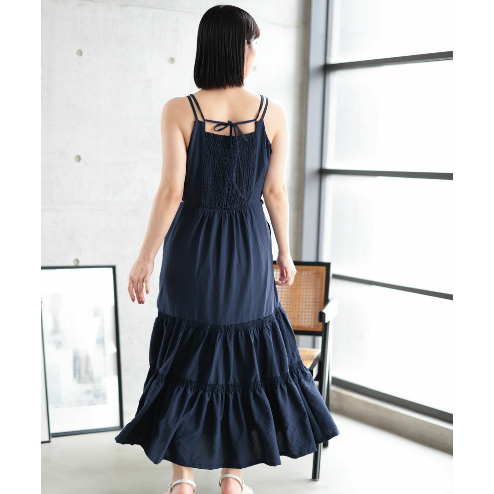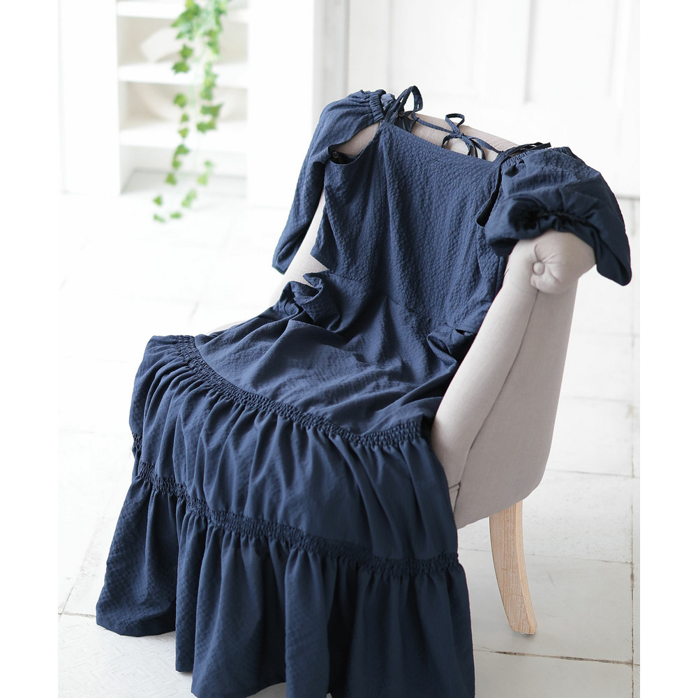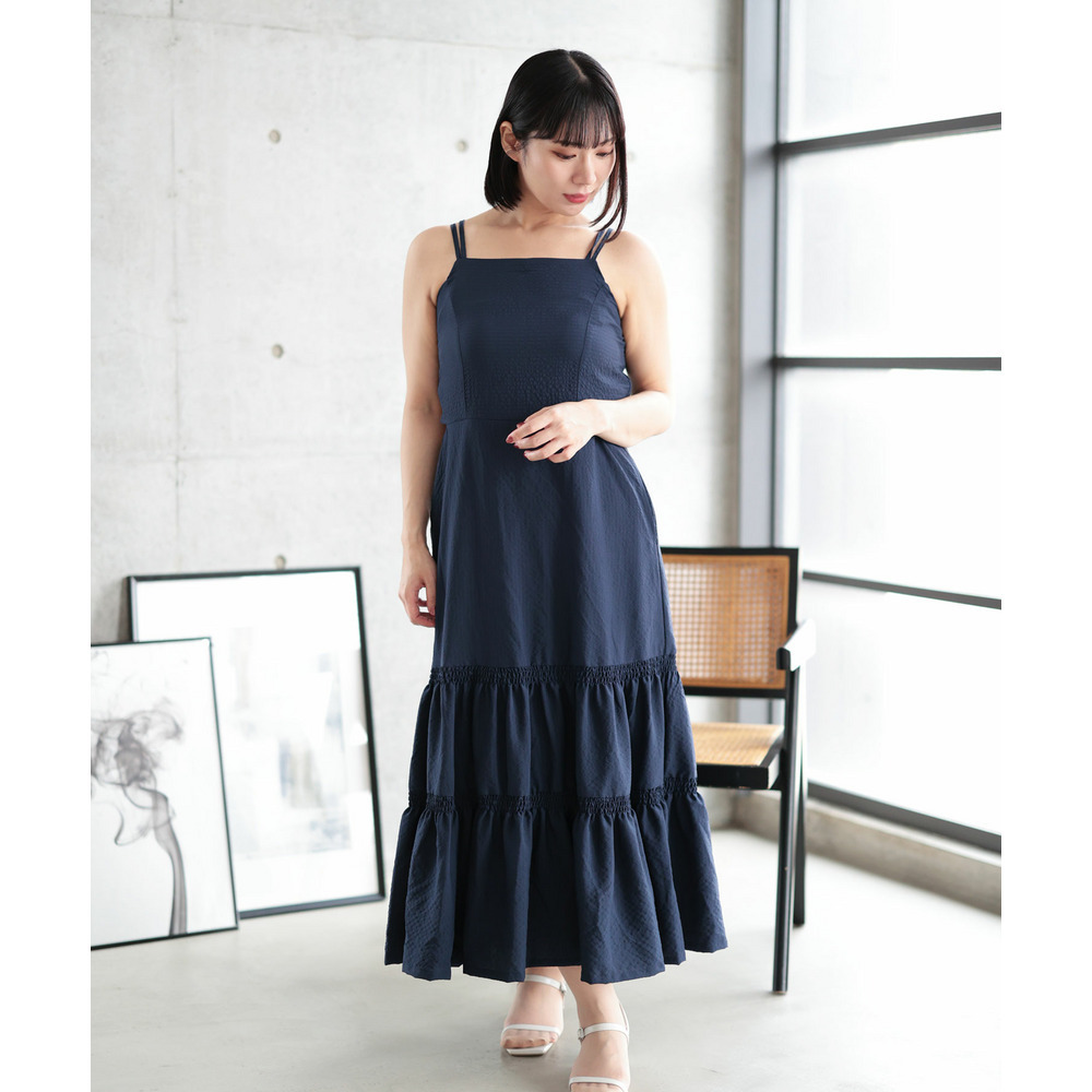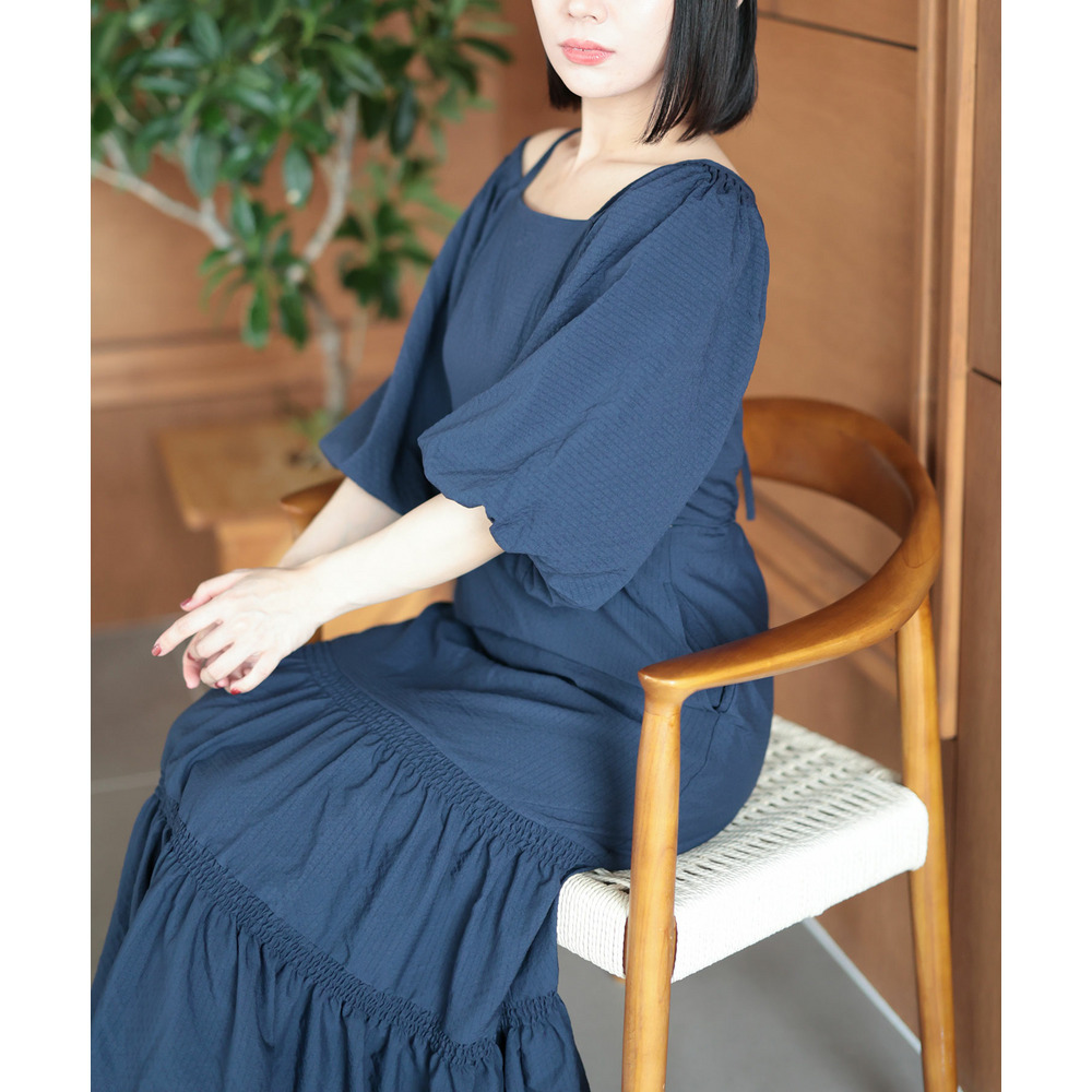 たっぷりと寄せたギャザーと、ふんわり広がるティアードスカートが華やかさと体型カバーを両立。
