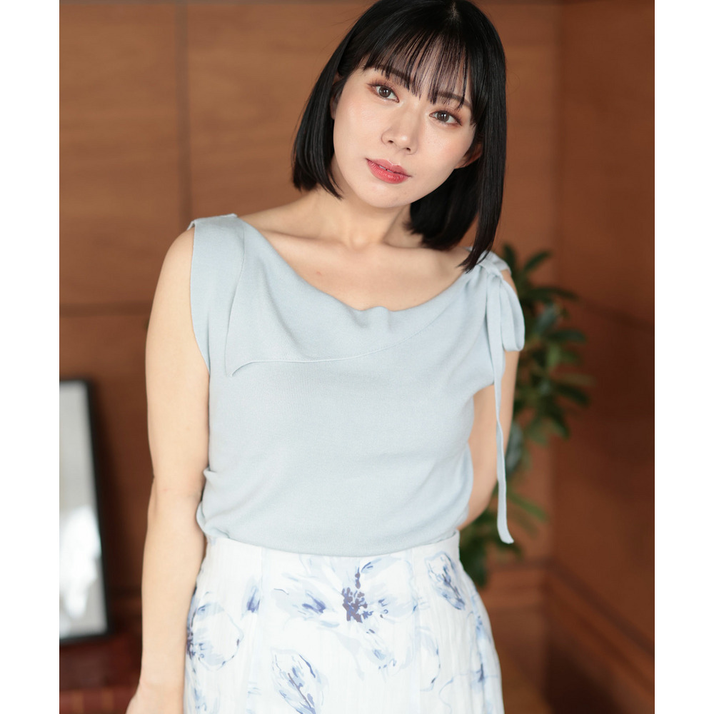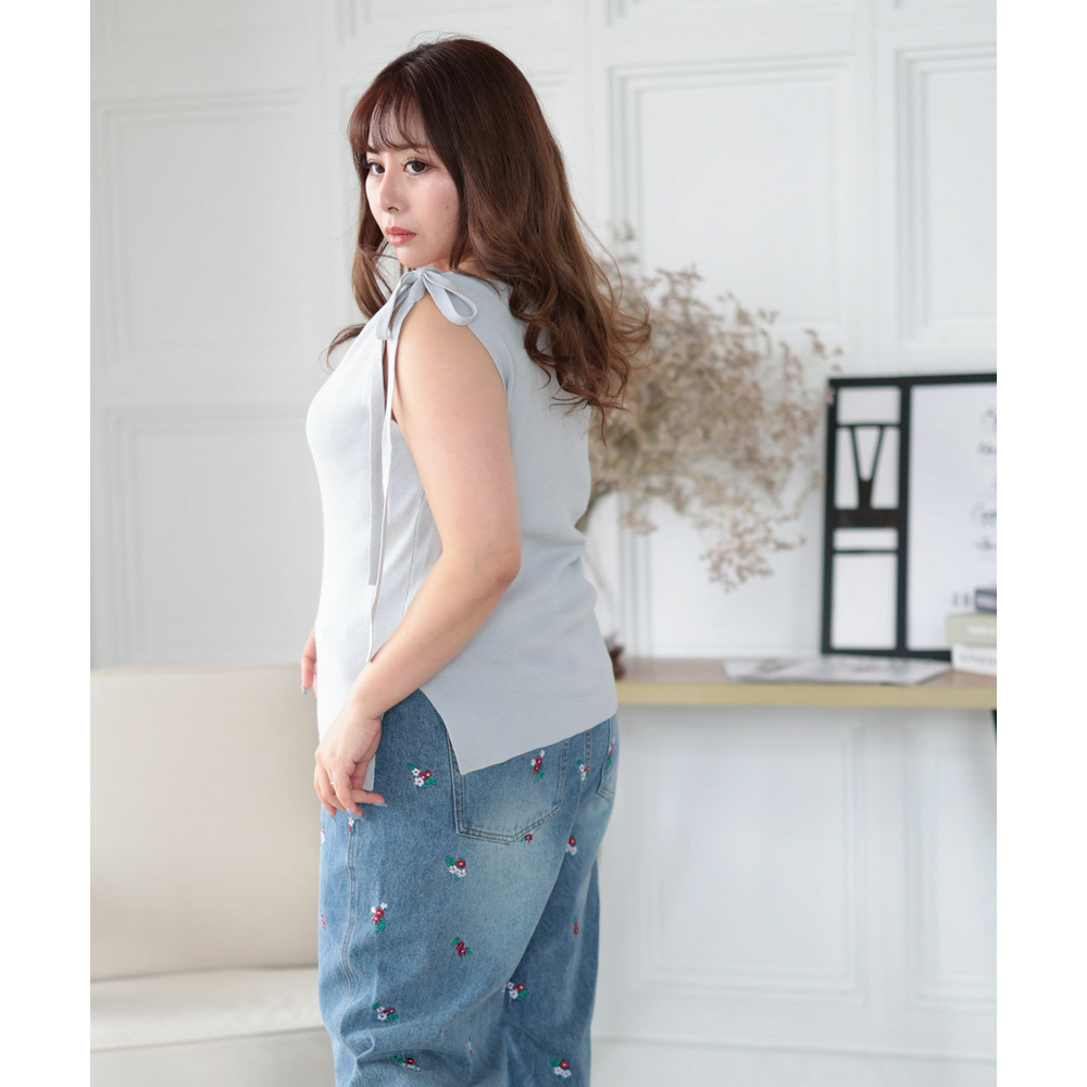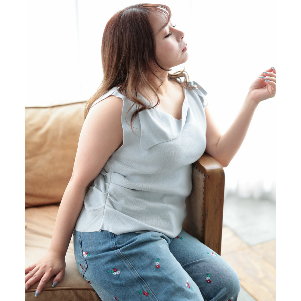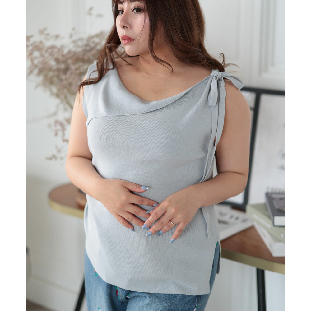 肩リボンアシンメトリーニットトップス 大きいサイズ レディース