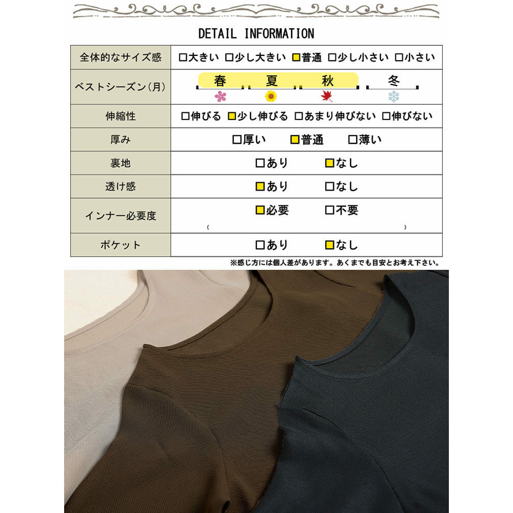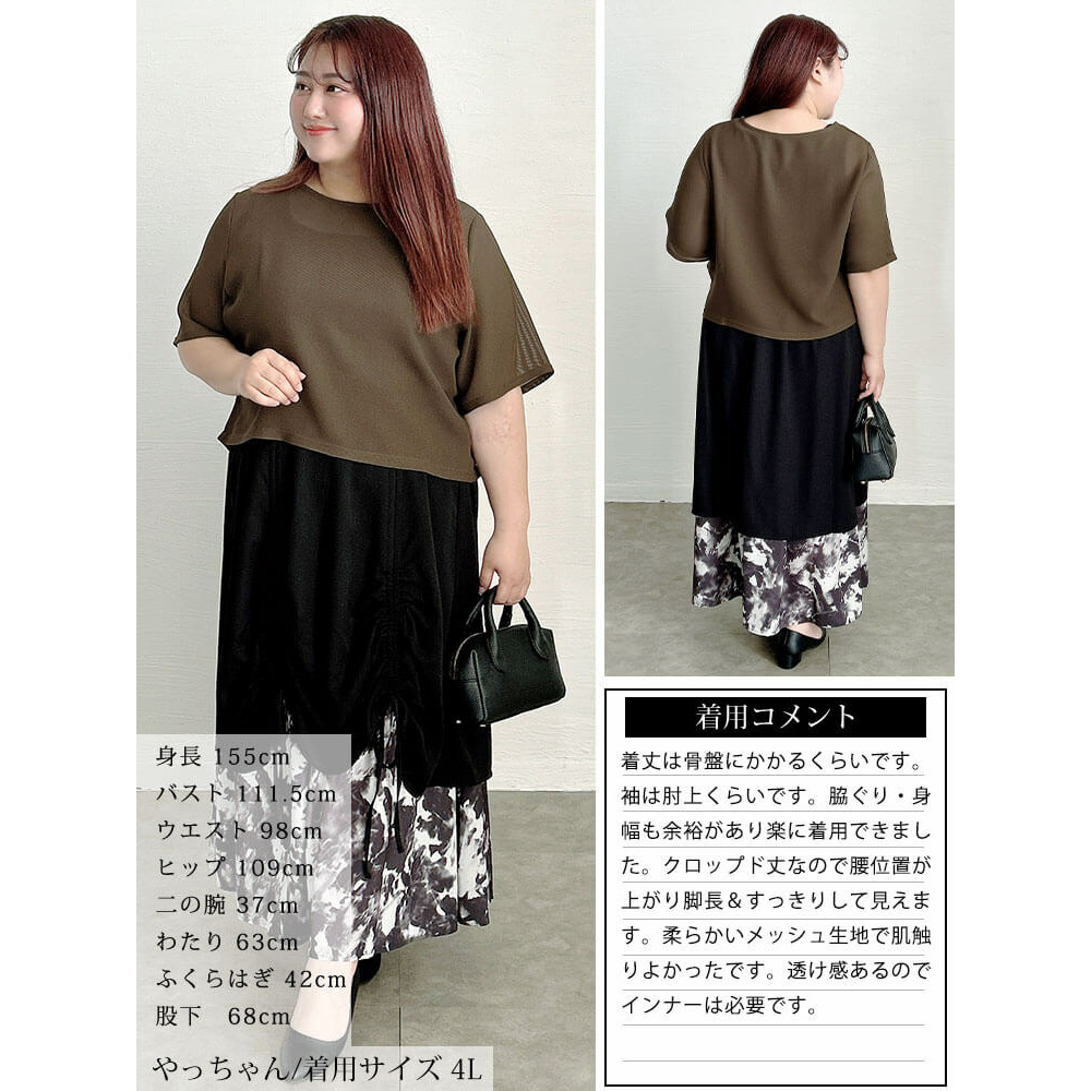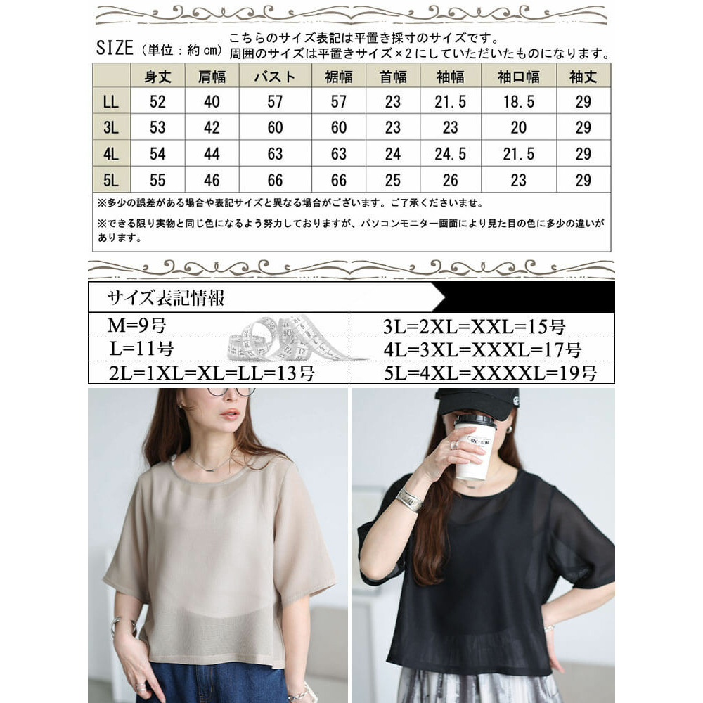 サイズ表記 LL 3L 4L 5L 身丈 52cm 53cm 54cm 55cm 肩幅 40cm 42cm 44cm 46cm バスト 57cm 60cm 63cm 66cm 裾幅 57cm 60cm 63cm 66cm 首幅 23cm 23cm 24cm 25cm 袖幅 21.5cm 23cm 24.5cm 26cm 袖口幅 18.5cm 20cm 21.5cm 23cm 袖丈 29cm 29cm 29cm 29cm