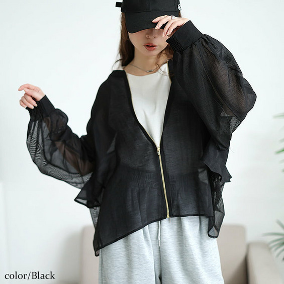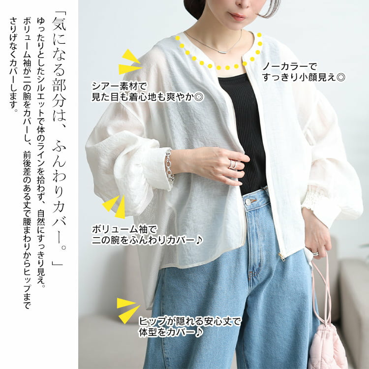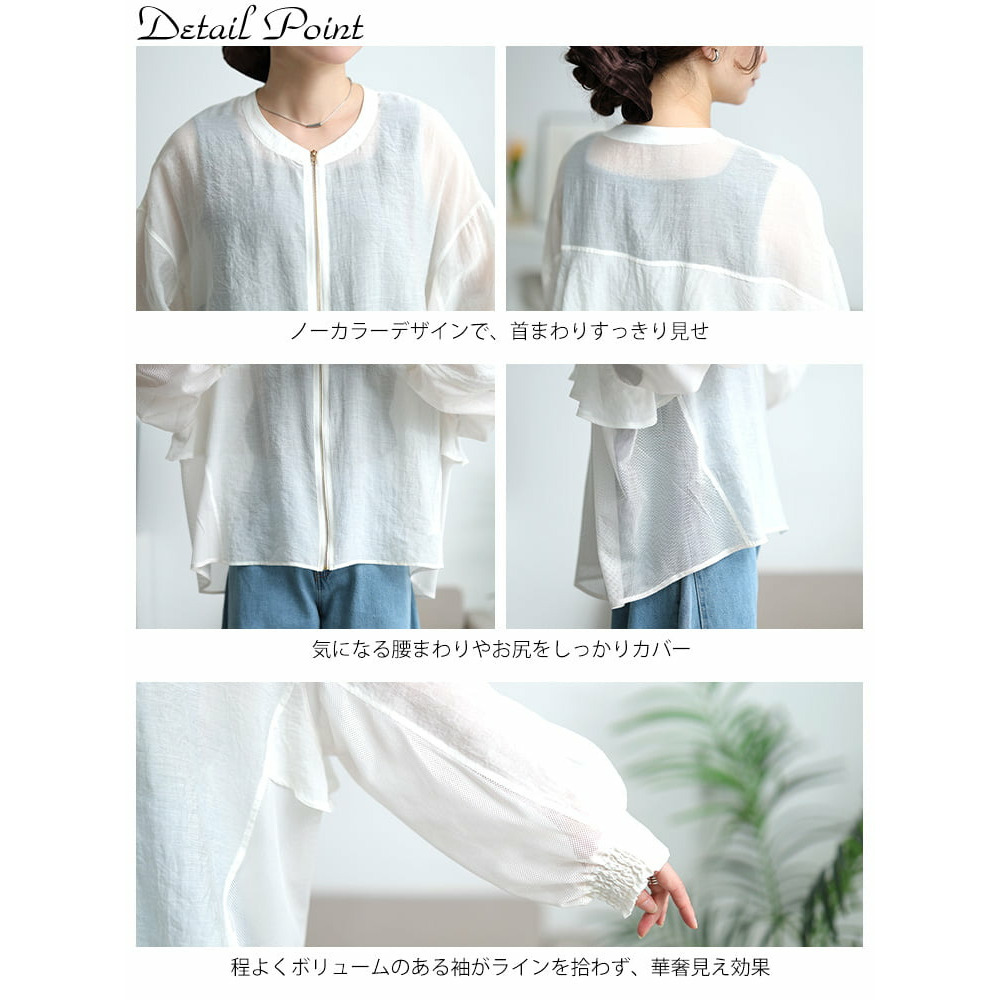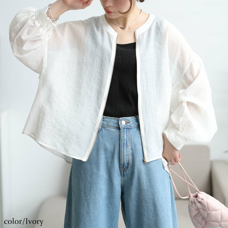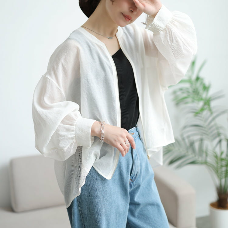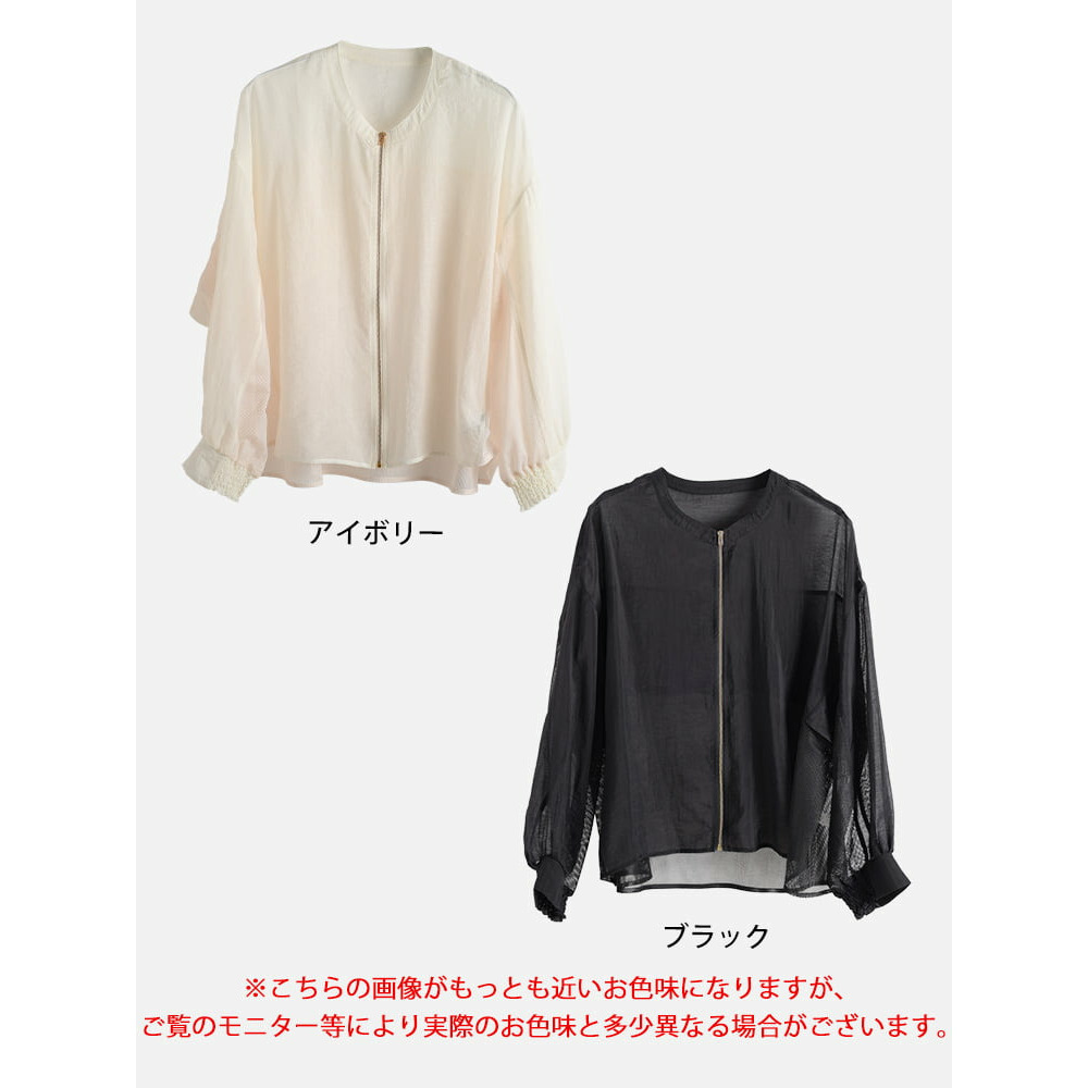 透け感のあるシアー素材とメッシュを組み合わせた、軽やかな着心地のブルゾン。