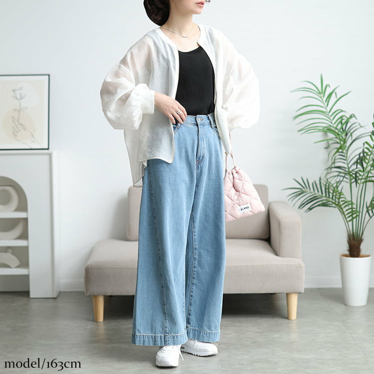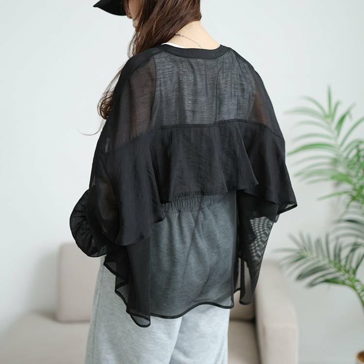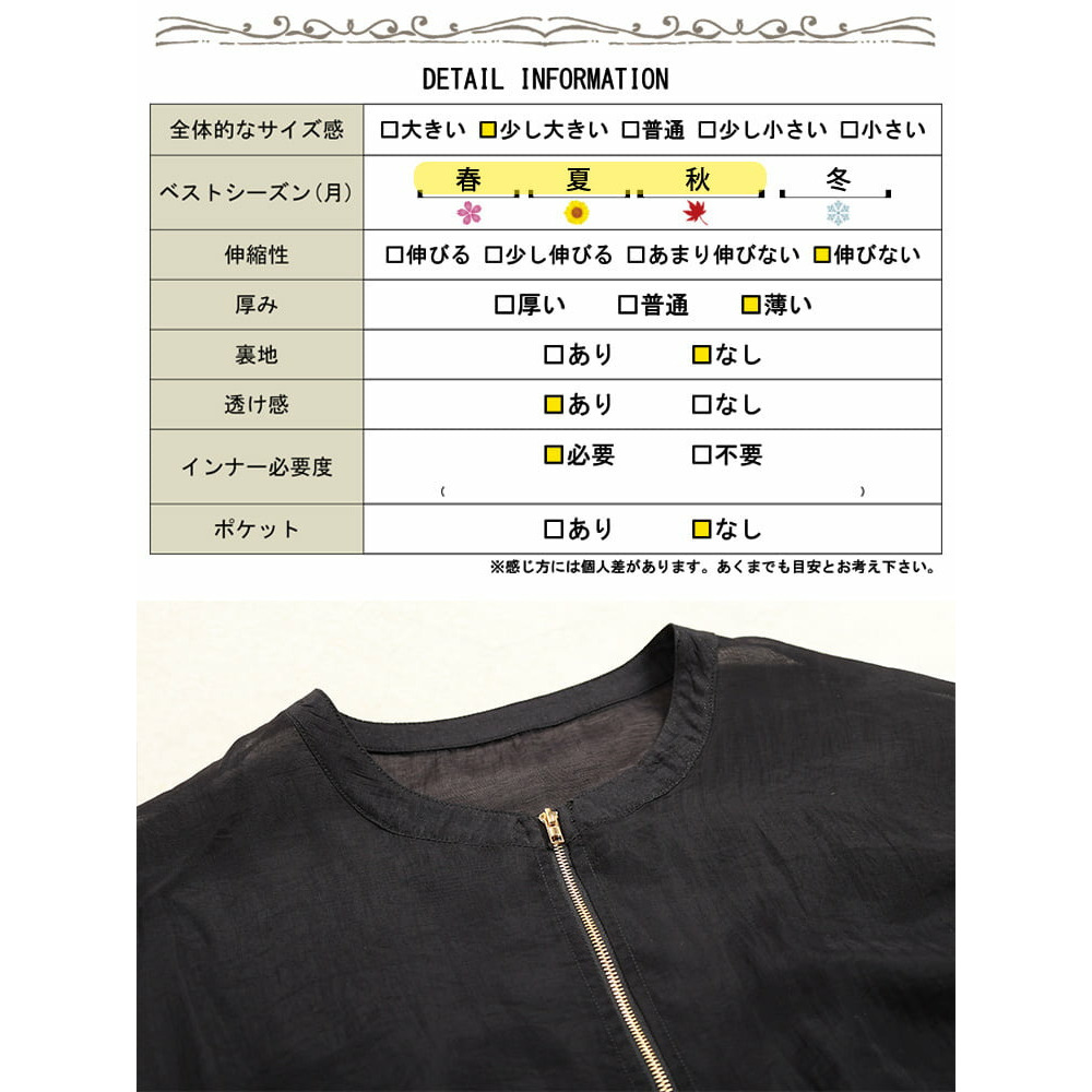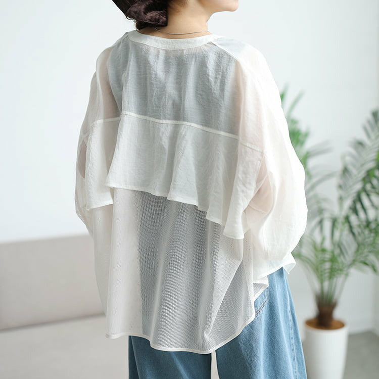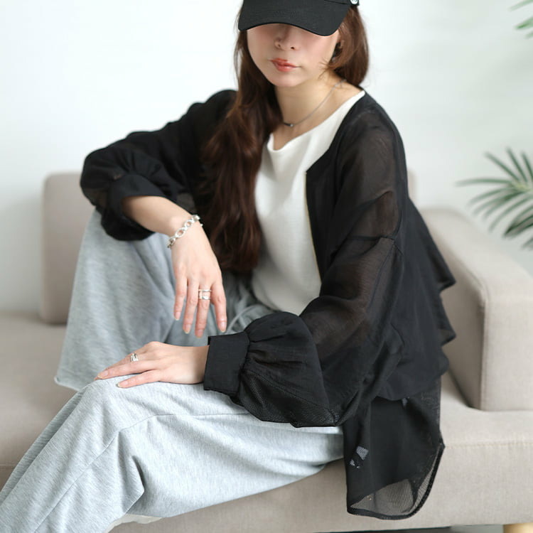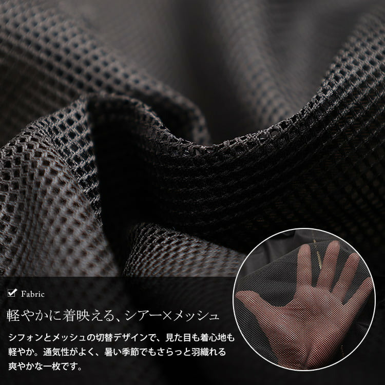 前身頃と袖外側は柔らかなシフォン、背中や袖内側には通気性の良いメッシュを使用し、見た目も着心地も涼やかに仕上げました。