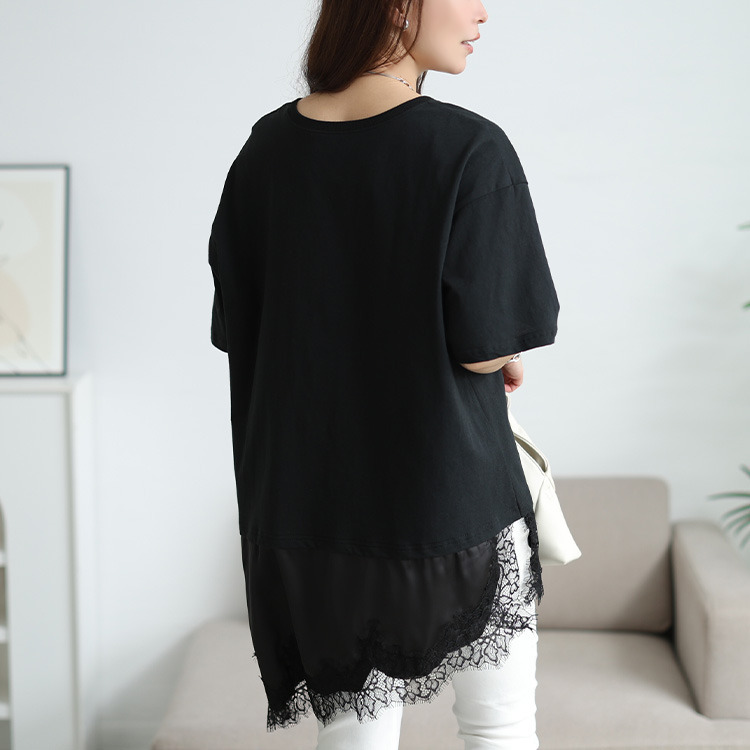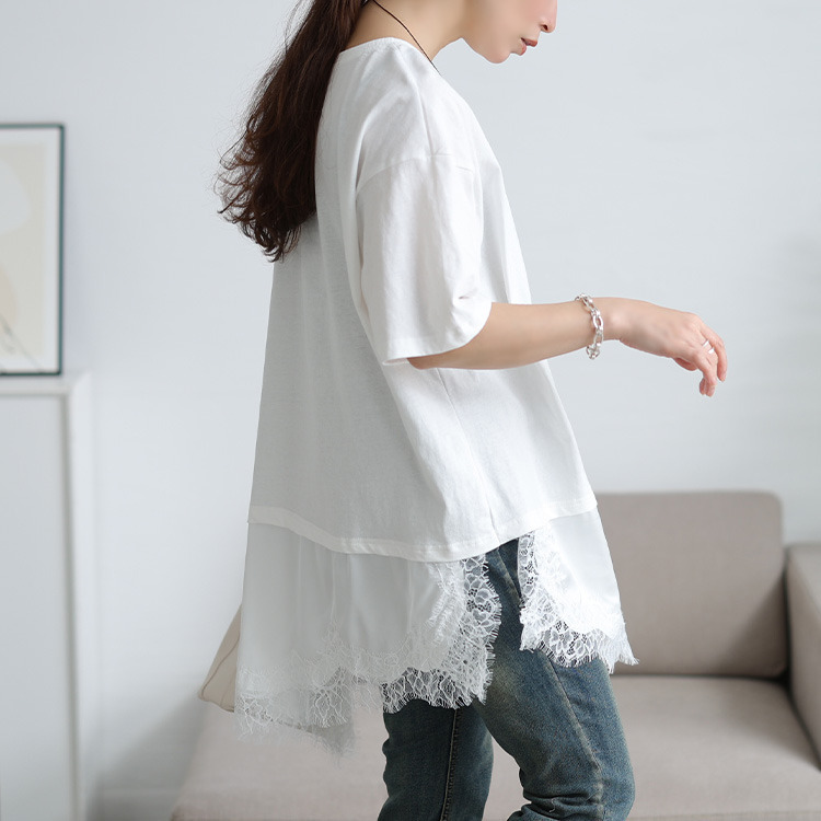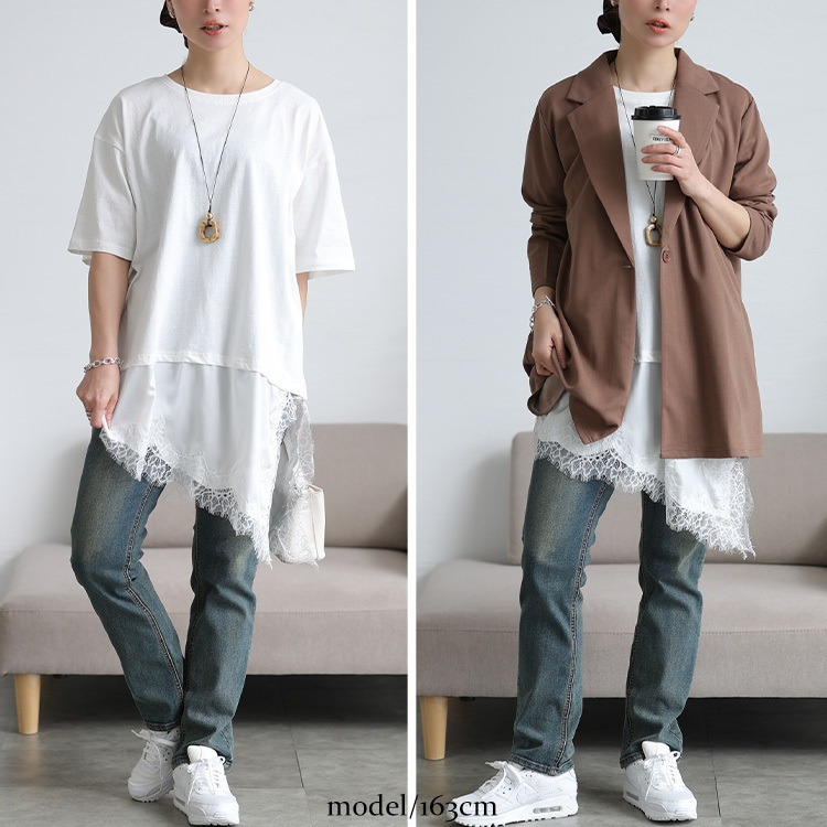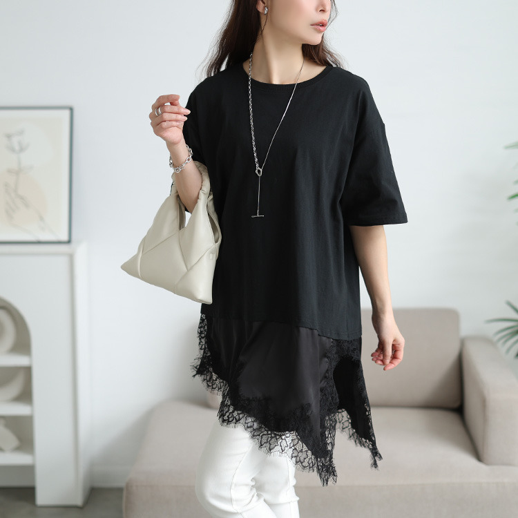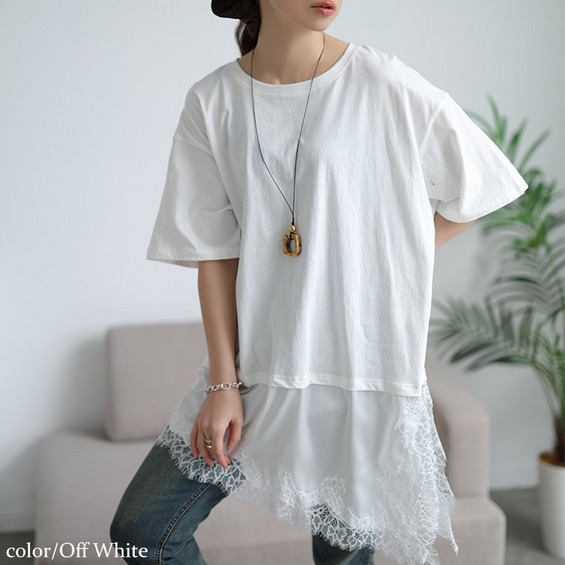 裾にレースをドッキングしたレイヤード風デザインで、一枚で奥行きあるサマ見えスタイルに。カジュアルなカットソーに、繊細なレース生地が合わさることで、綺麗めな印象に仕上がります。アシンメトリーなヘムラインでシルエットに動きをプラスし、こなれ感を演出する一着。