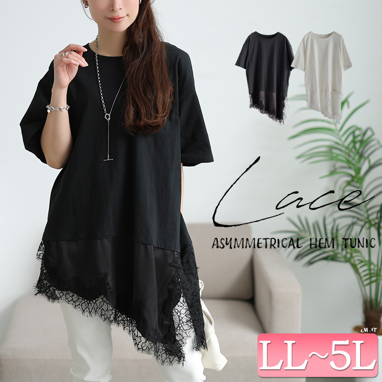 レース&異素材切り替えアシメヘムチュニック 大きいサイズ レディース