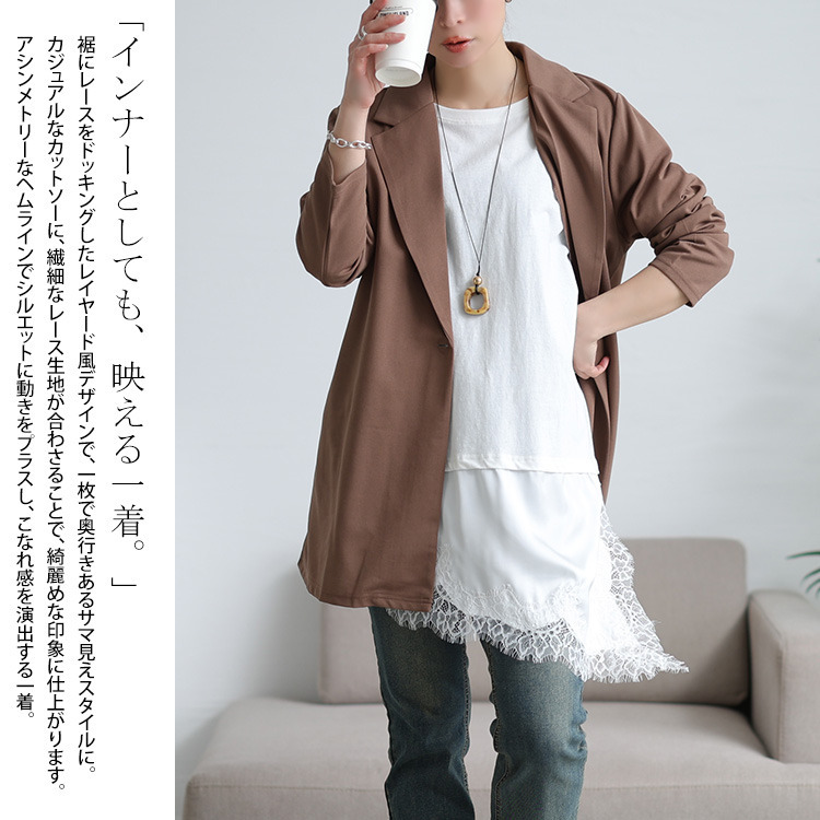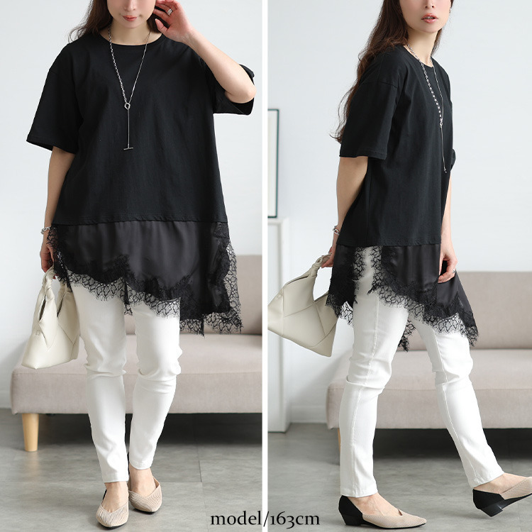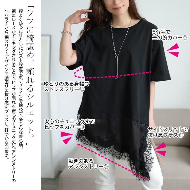 程よくゆったりとしたバスト設定でボディラインを拾わず、楽ちんな着心地。裾にレースがドッキングされることで、ヒップが隠れる安心のチュニック丈に。アシンメトリーのヘムラインと、裾スリットデザインで腰回りに抜け感をプラスし、軽やかな印象に。