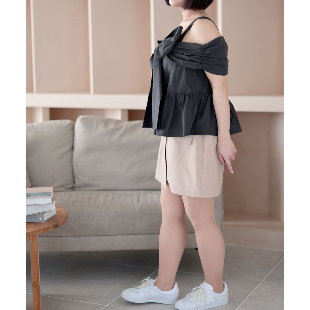 リボンに加えてウエスト位置から広がるペプラムシルエット。
