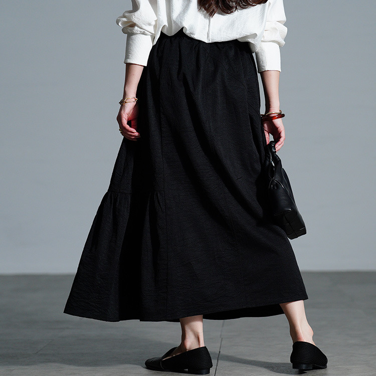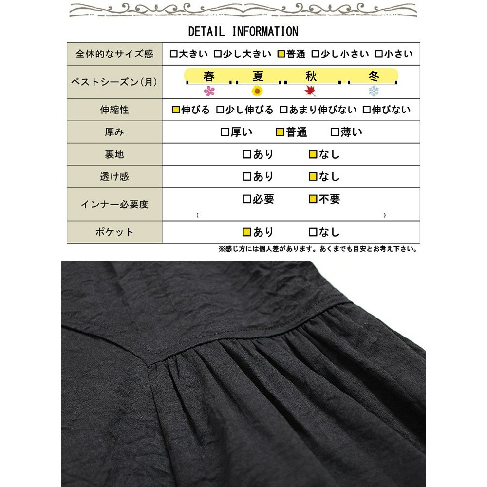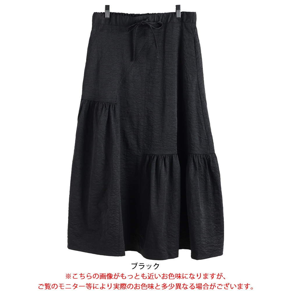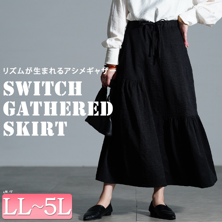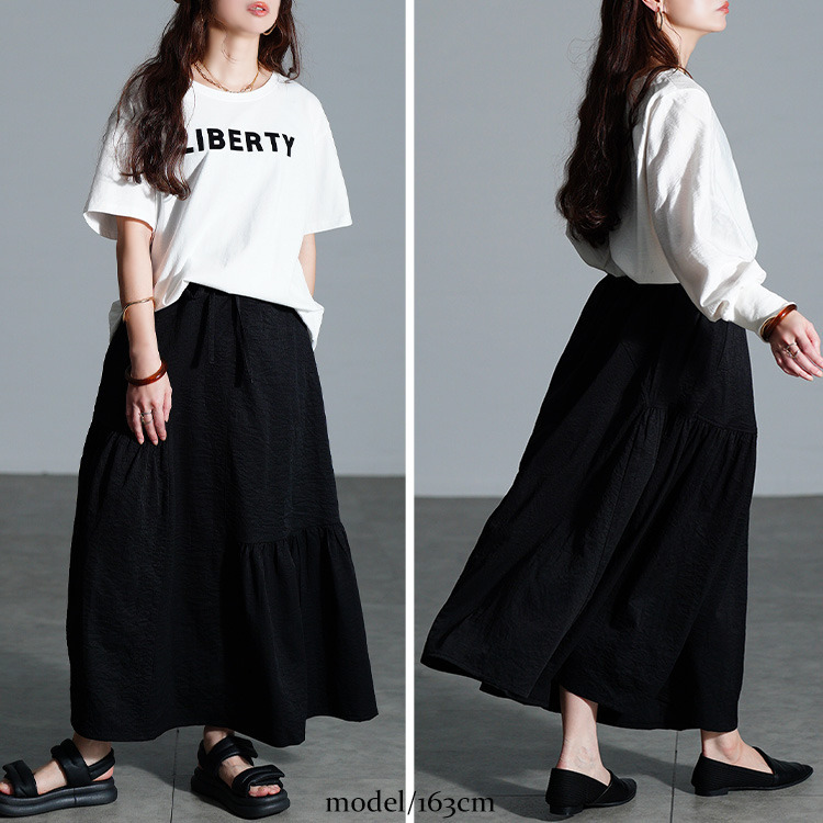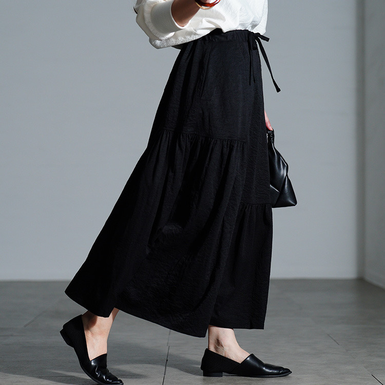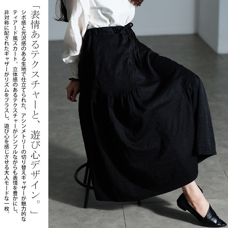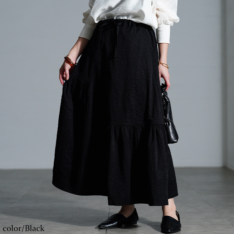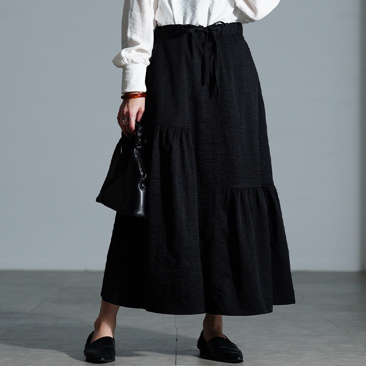 左右に配されたティアード風のギャザーデザインで、広がり過ぎないふんわりとしたフレアシルエットで下半身を丸ごと体型カバーしながら、女性らしい印象に。ウエスト部分は、後ろゴム&ドロスト仕様だからお好みのフィット感に調節でき、ストレスフリーな穿き心地。