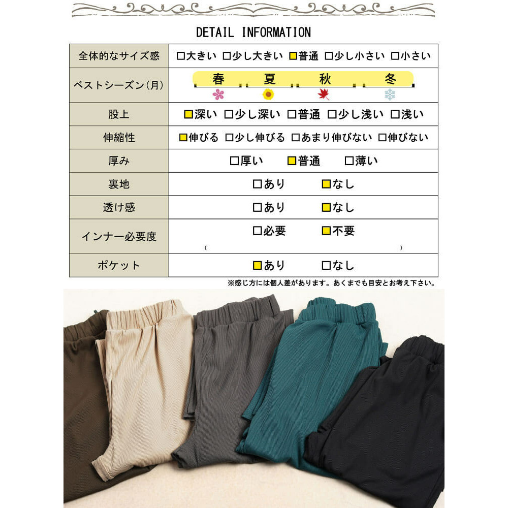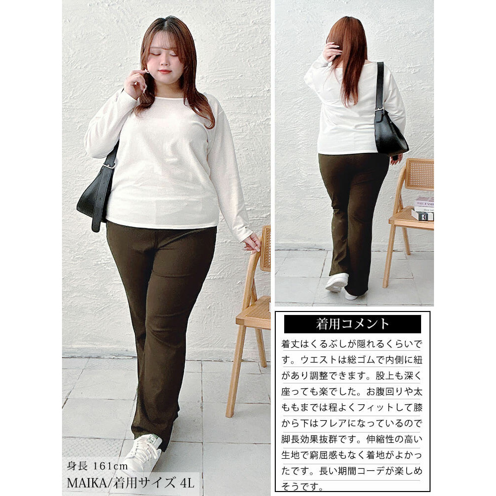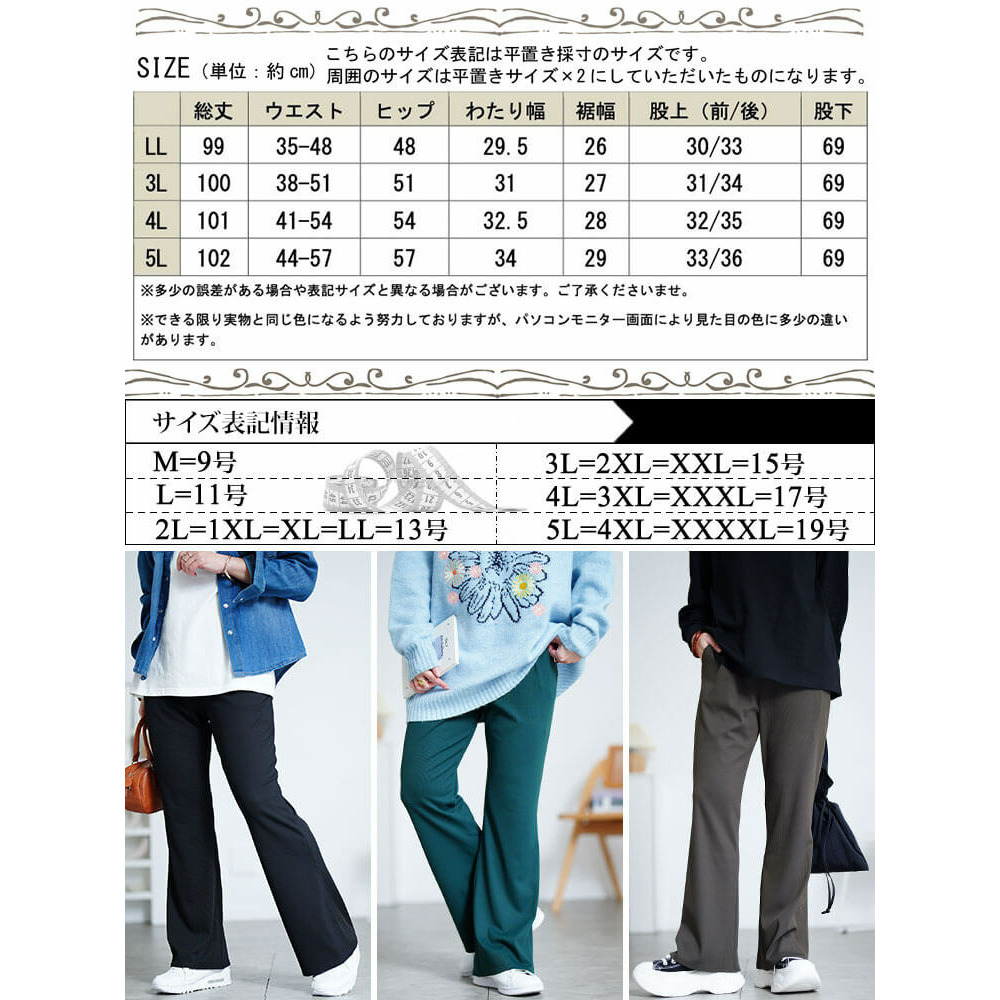 サイズ表記 LL 3L 4L 5L 総丈 99cm 100cm 101cm 102cm ウエスト 35-48cm 38-51cm 41-54cm 44-57cm ヒップ 48cm 51cm 54cm 57cm わたり幅 29.5cm 31cm 32.5cm 34cm 裾幅 26cm 27cm 28cm 29cm 股上(前/後) 30/33cm 31/34cm 32/35cm 33/36cm 股下 69cm 69cm 69cm 69cm