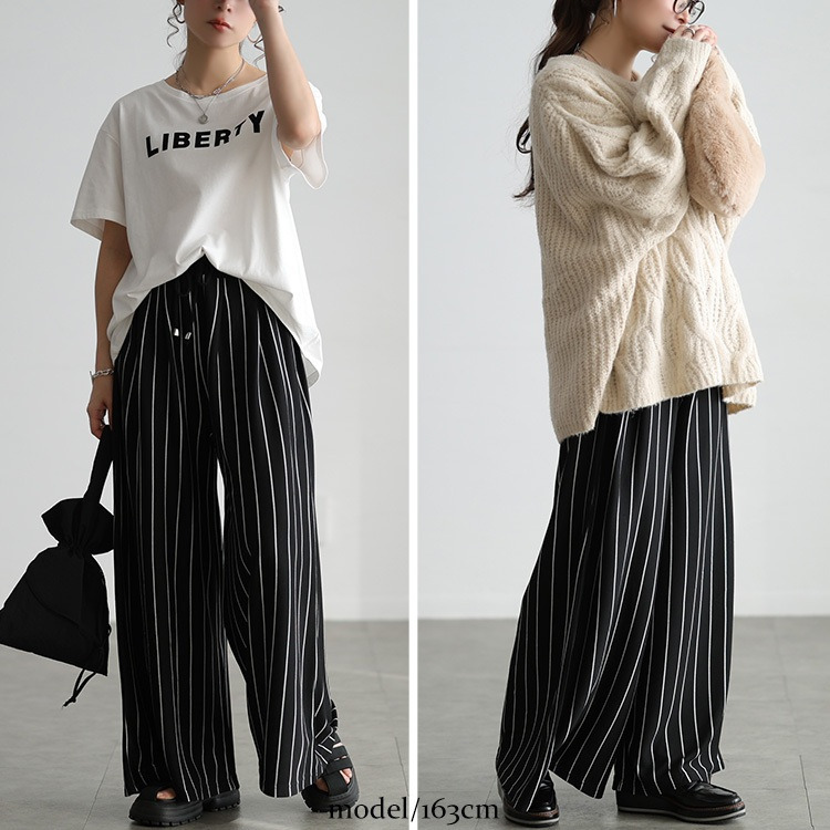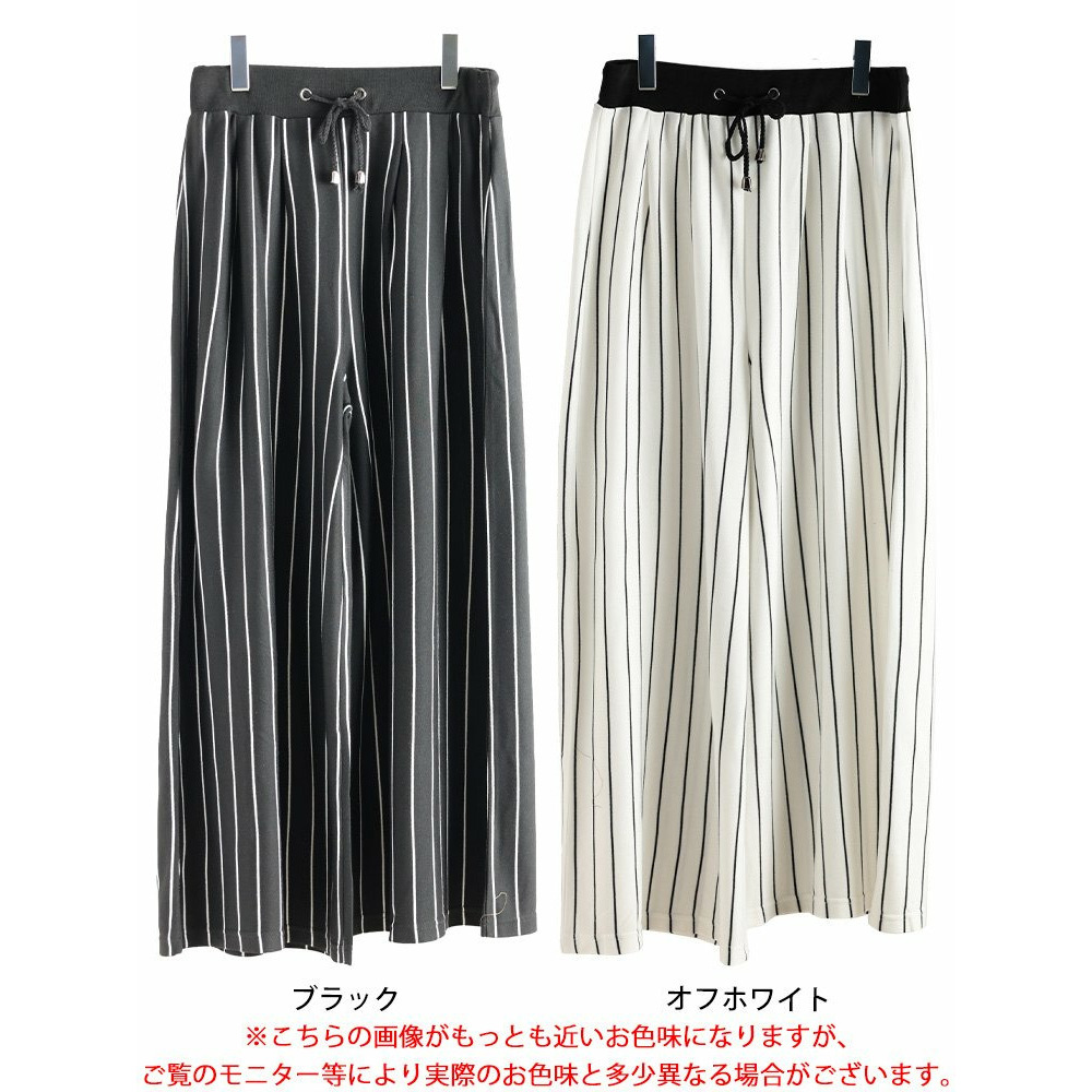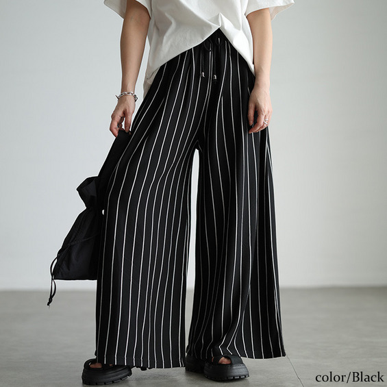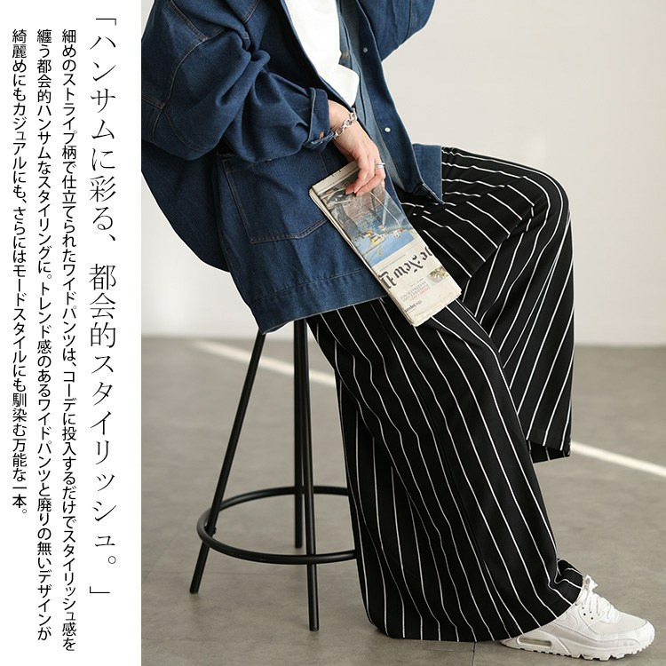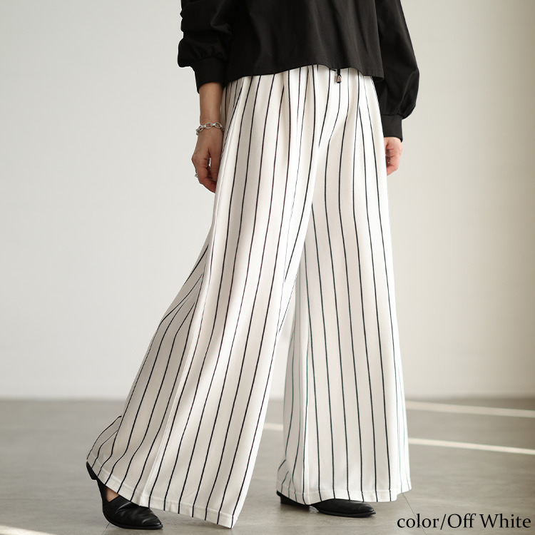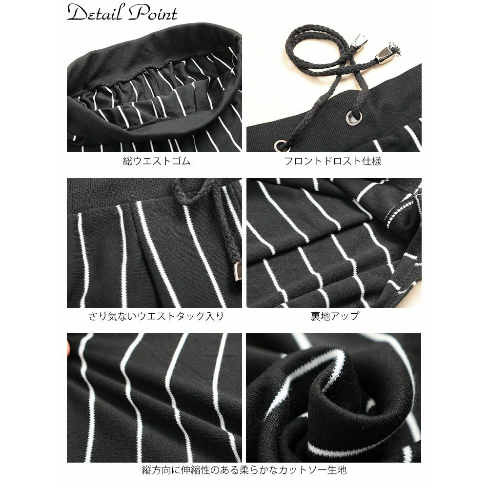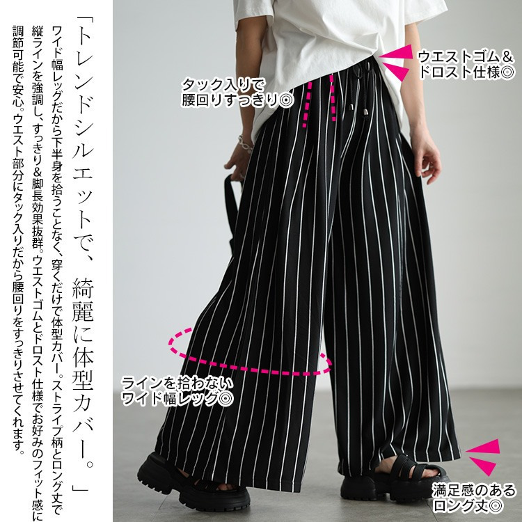 ワイド幅レッグだから下半身を拾うことなく、穿くだけで体型カバー。ストライプ柄とロング丈で縦ラインを強調し、すっきり&脚長効果抜群。ウエストゴムとドロスト仕様でお好みのフィット感に調節可能で安心。ウエスト部分にタック入りだから腰回りをすっきりさせてくれます。