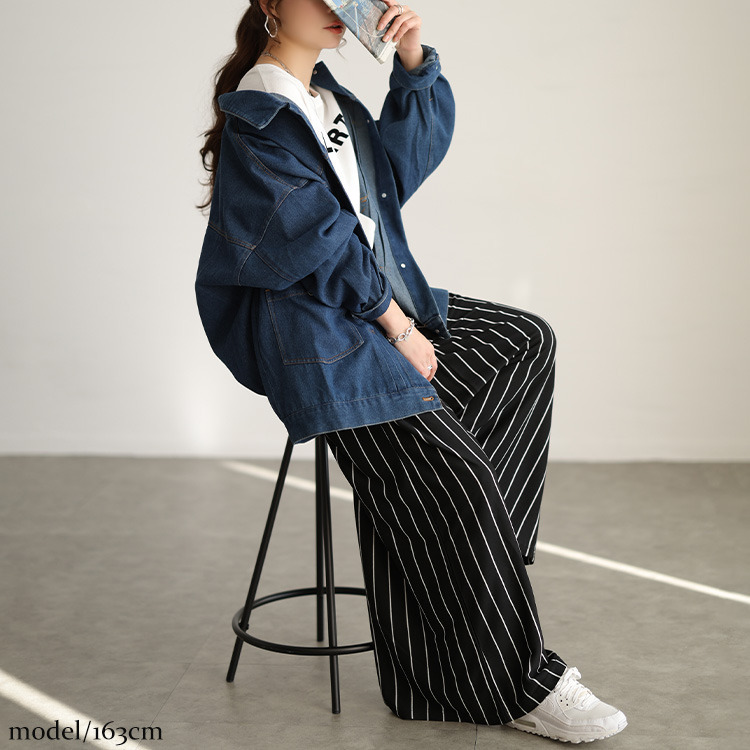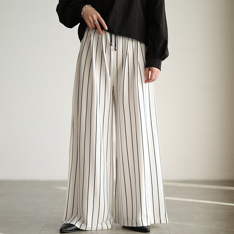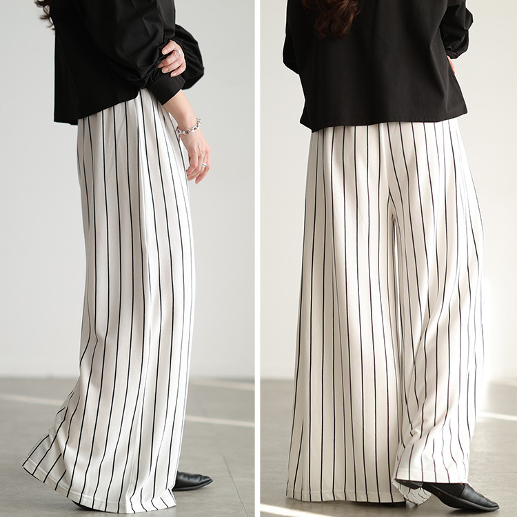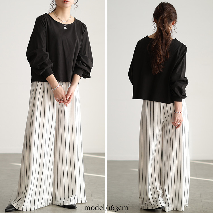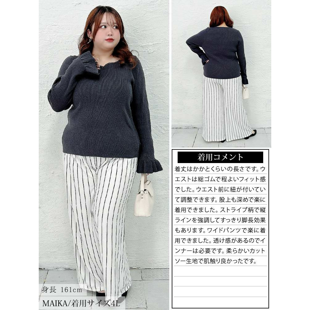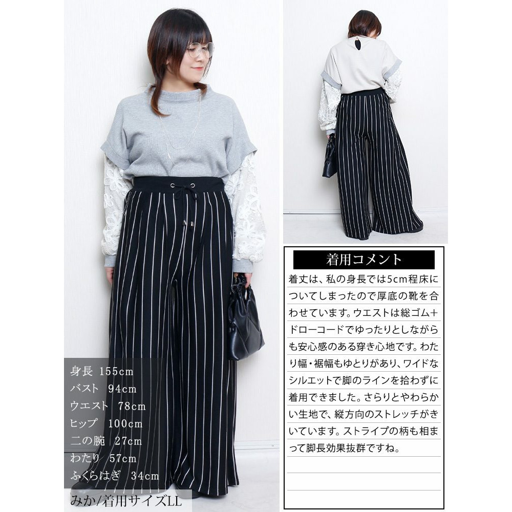 ワイド幅レッグだから下半身を拾うことなく、穿くだけで体型カバー。ストライプ柄とロング丈で縦ラインを強調し、すっきり&脚長効果抜群。ウエストゴムとドロスト仕様でお好みのフィット感に調節可能で安心。ウエスト部分にタック入りだから腰回りをすっきりさせてくれます。