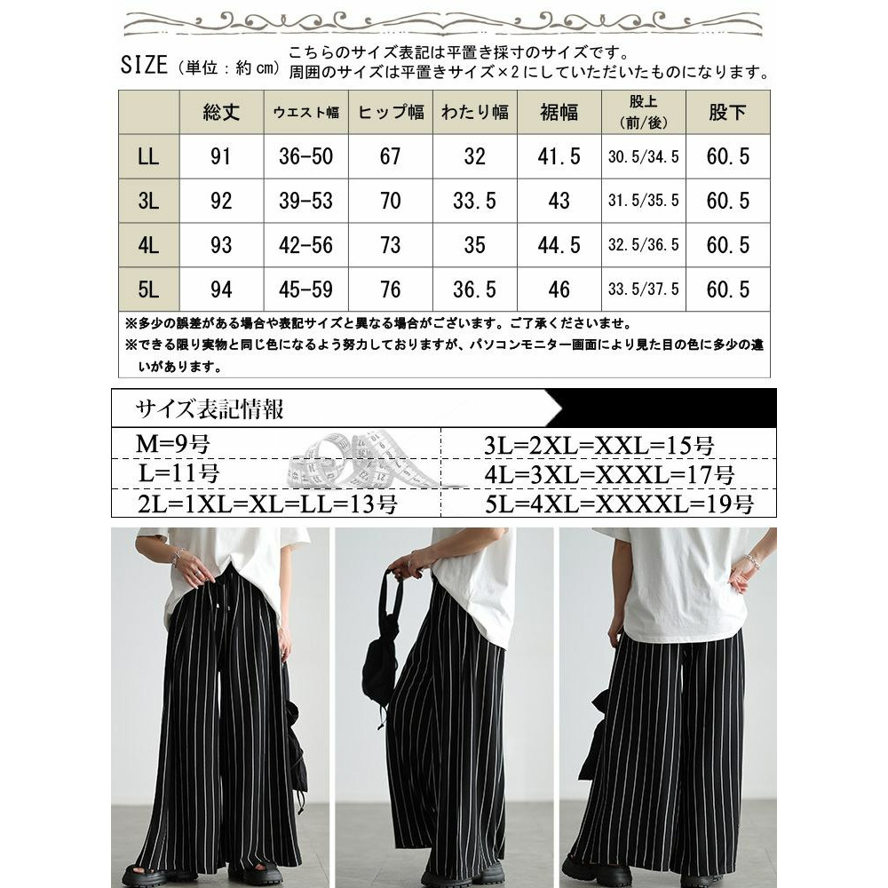 サイズ表記 LL 3L 4L 5L 総丈 91cm 92cm 93cm 94cm ウエスト幅 36-50cm 39-53cm 42-56cm 45-59cm ヒップ幅 67cm 70cm 73cm 76cm わたり幅 32cm 33.5cm 35cm 36.5cm 裾幅 41.5cm 43cm 44.5cm 46cm 股上(前/後) 30.5/34.5cm 31.5/35.5cm 32.5/36.5cm 33.5/37.5cm 股下 60.5cm 60.5cm 60.5cm 60.5cm