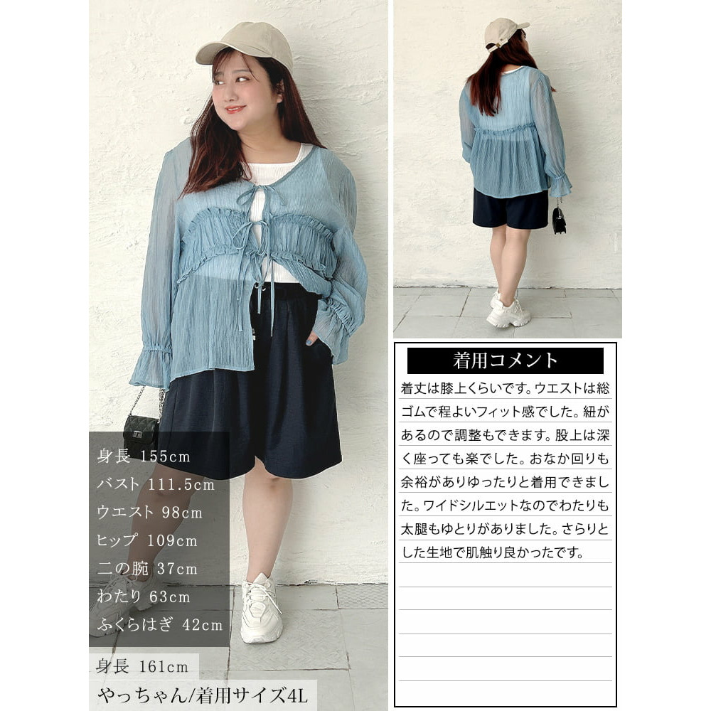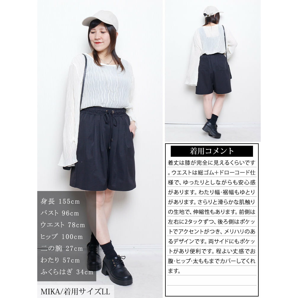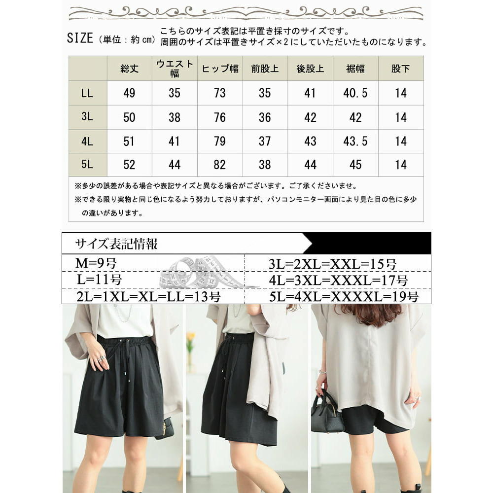 サイズ表記 LL 3L 4L 5L 総丈 49cm 50cm 51cm 52cm ウエスト幅 35cm 38cm 41cm 44cm ヒップ幅 73cm 76cm 79cm 82cm 前股上 35cm 36cm 37cm 38cm 後股上 41cm 42cm 43cm 44cm 裾幅 40.5cm 42cm 43.5cm 45cm 股下 14cm 14cm 14cm 14cm