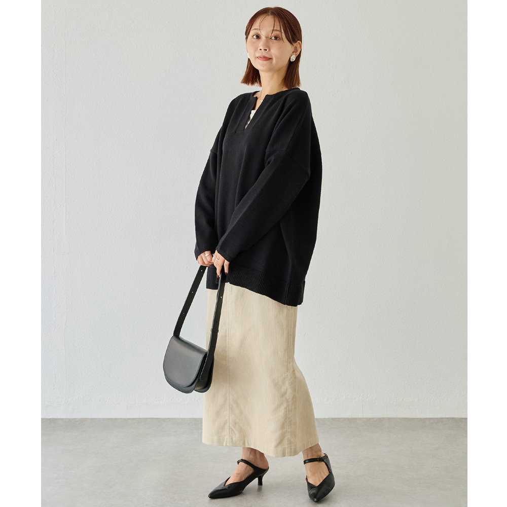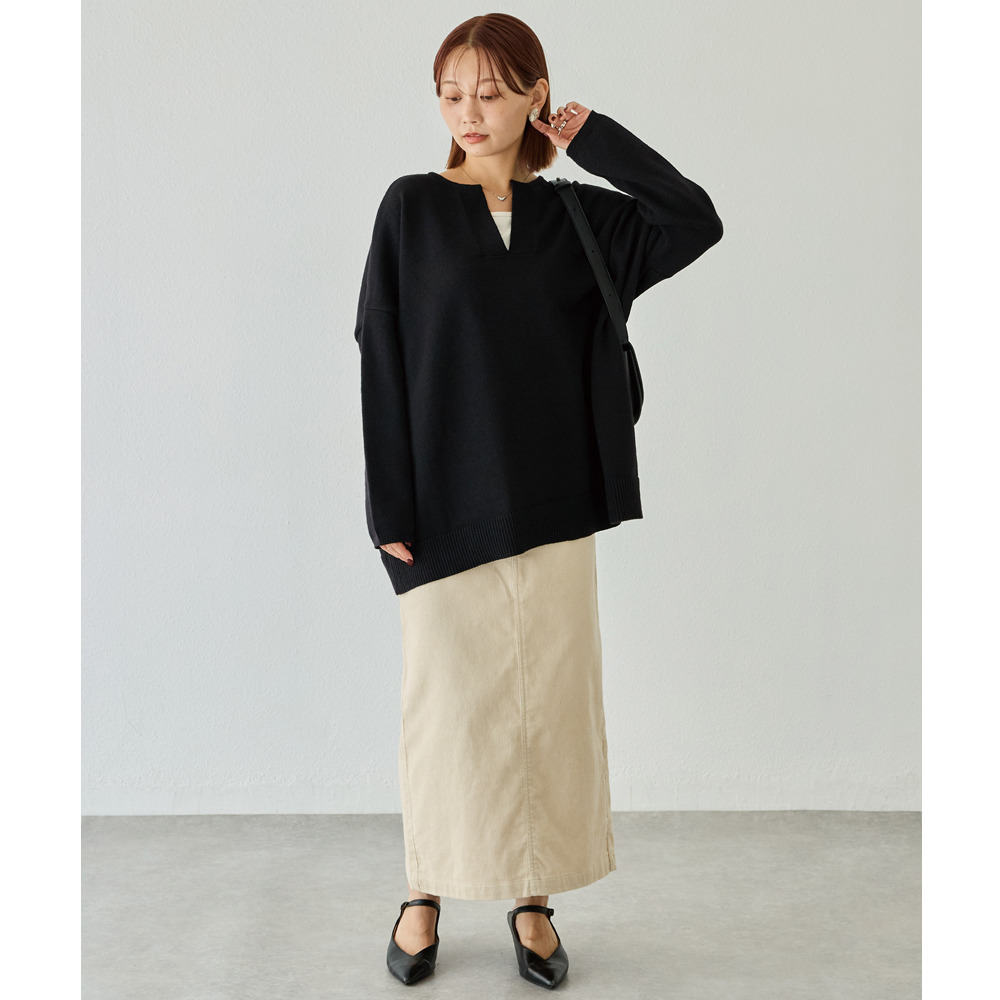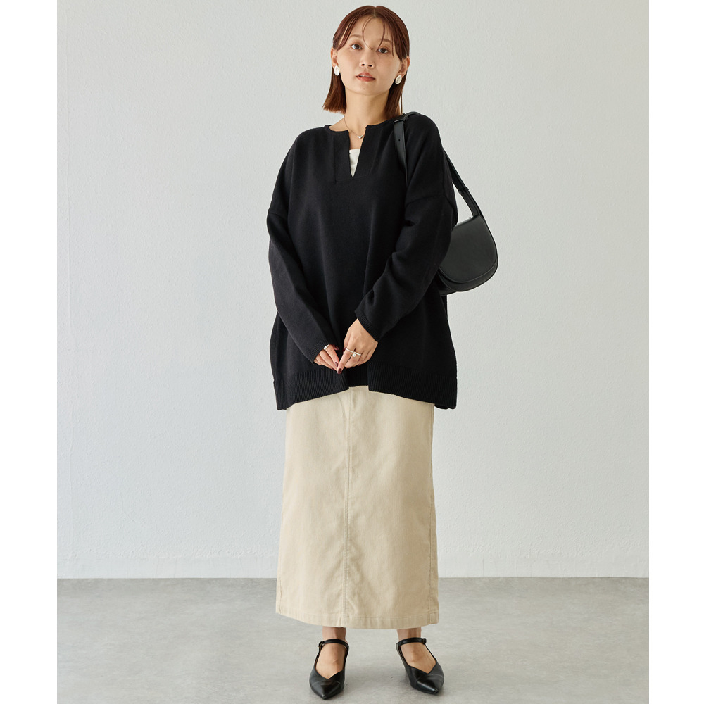 抜け感のあるスキッパーネックが顔周りをすっきりと見せ、ラフになりすぎず女性らしさを演出してくれます。