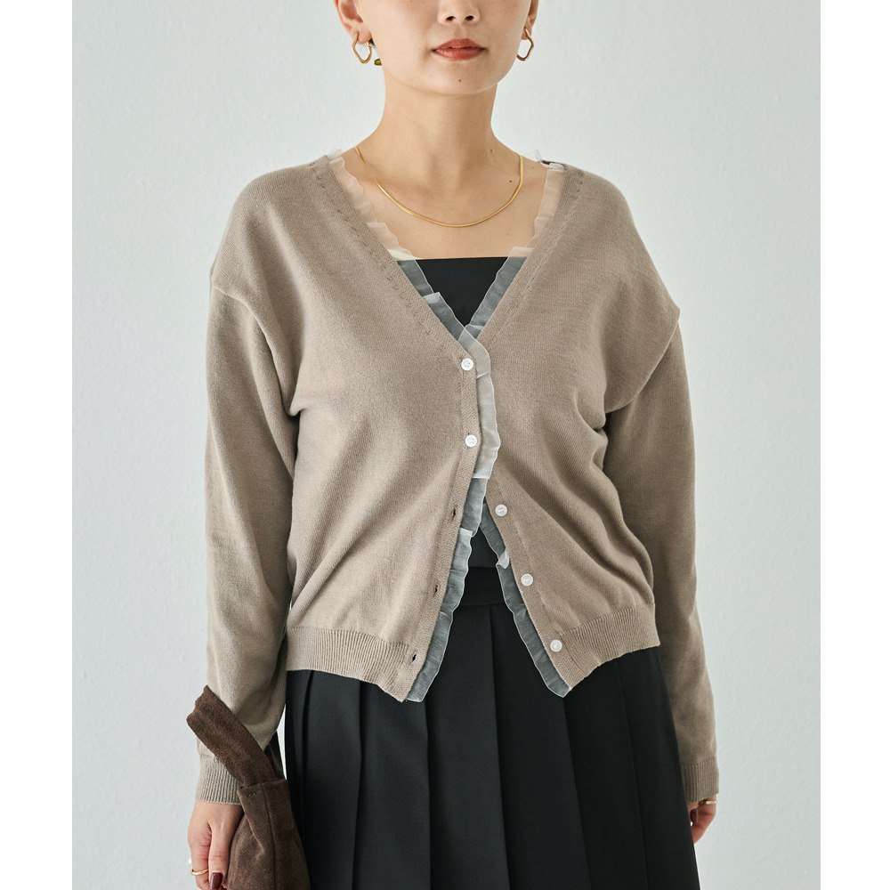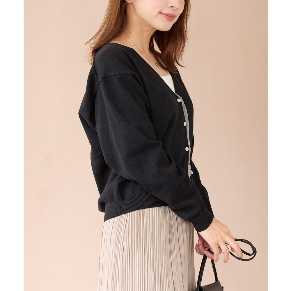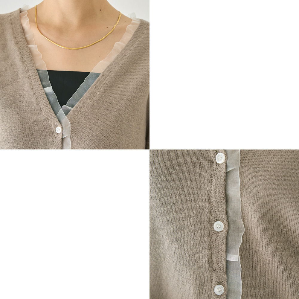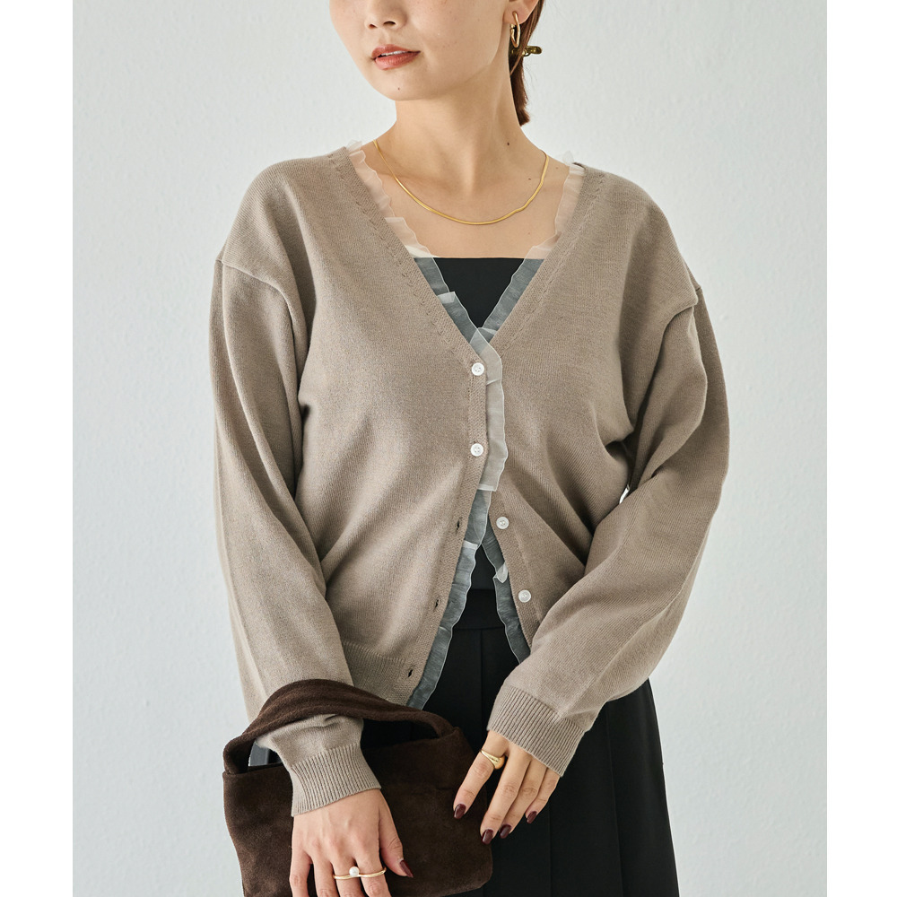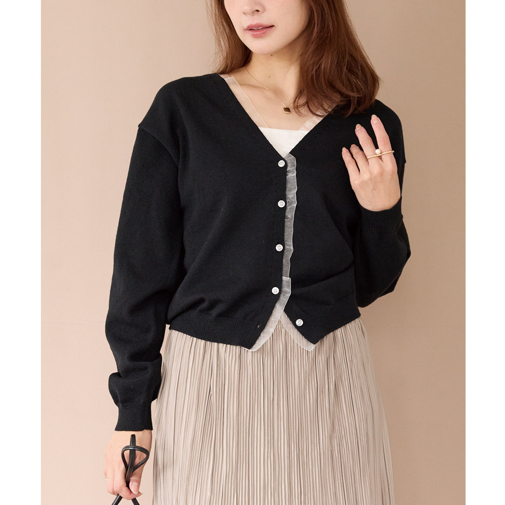 前立てと襟ぐりにあしらわれたオーガンジーの配色デザインが目を惹くニットカーディガン。