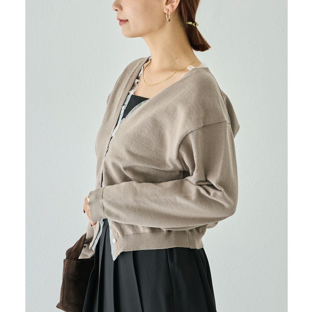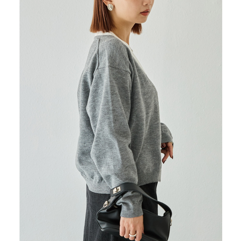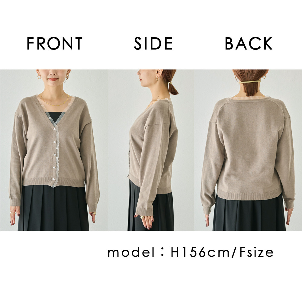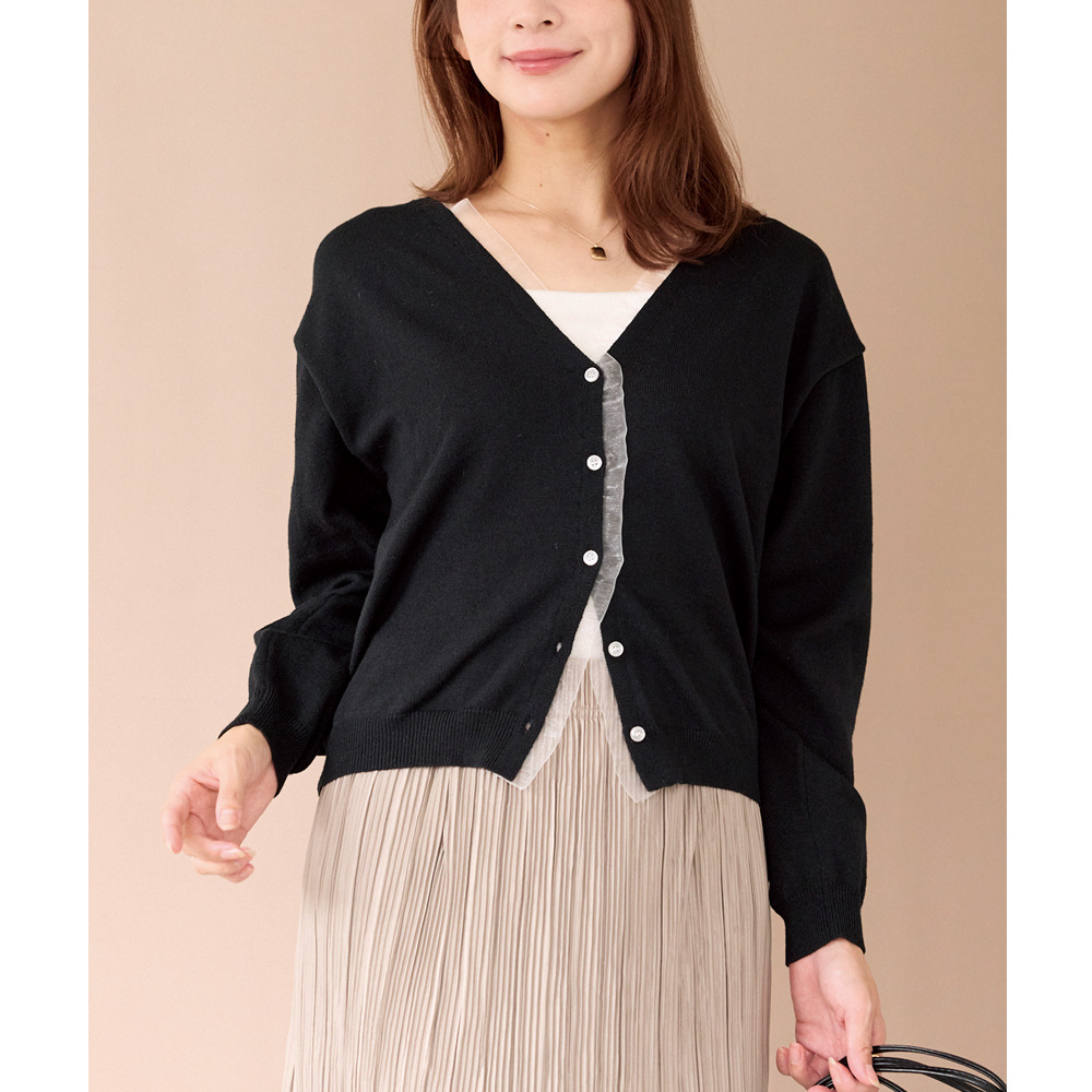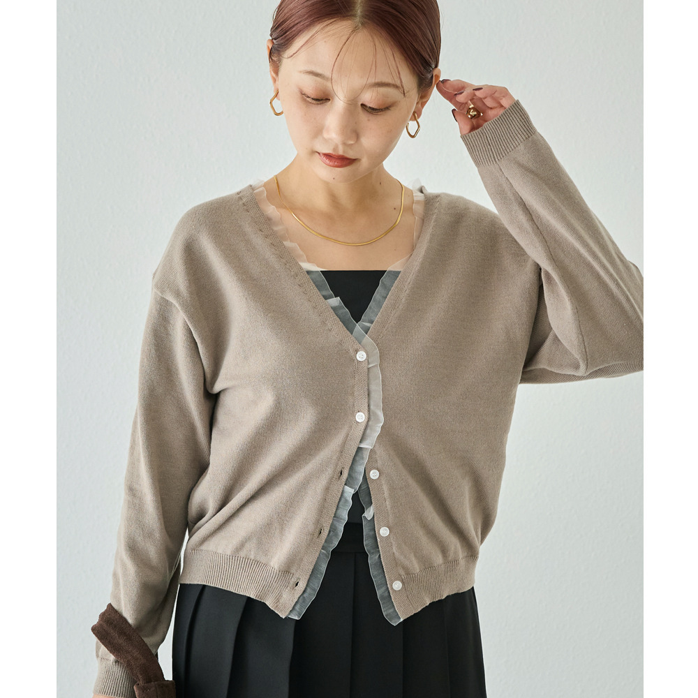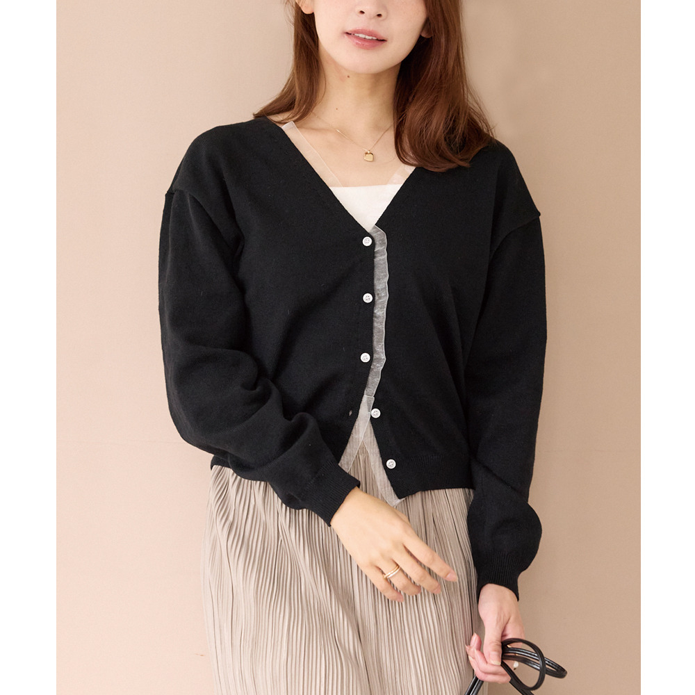 前立てと襟ぐりにあしらわれたオーガンジーの配色デザインが目を惹くニットカーディガン。
