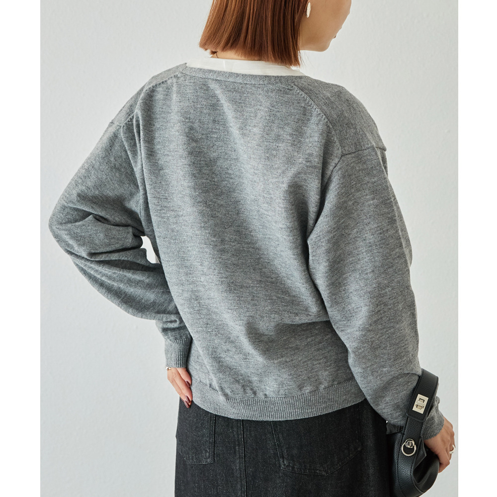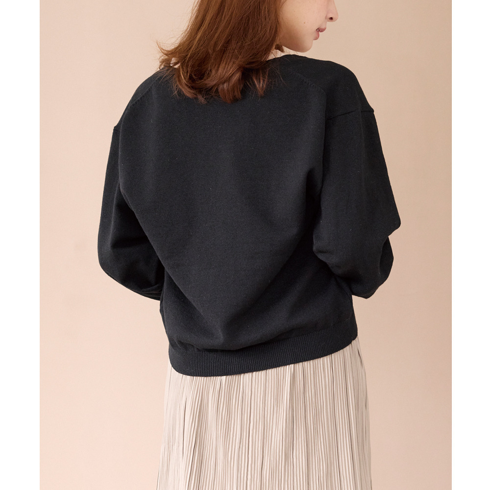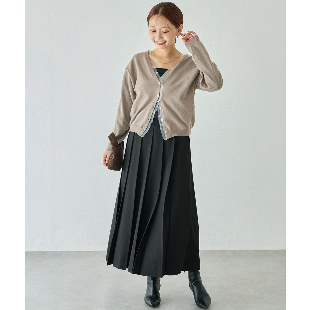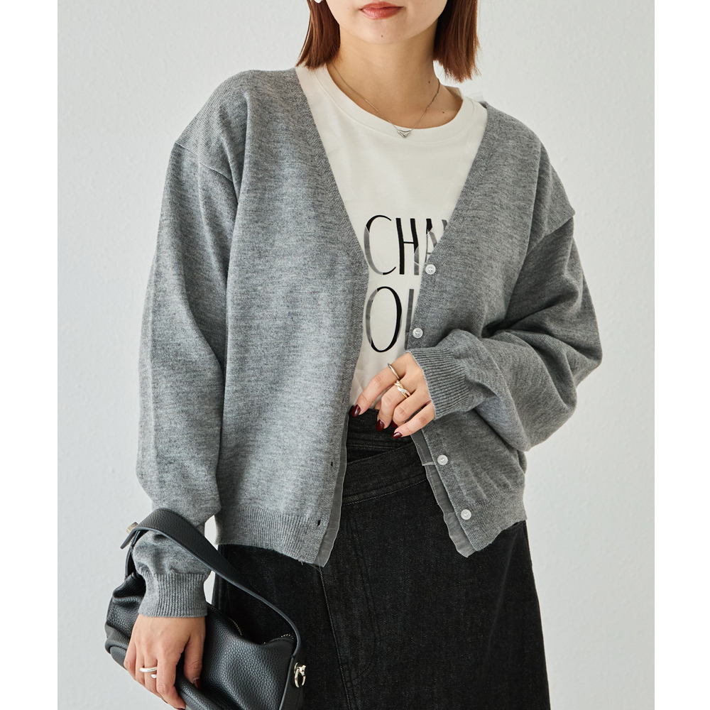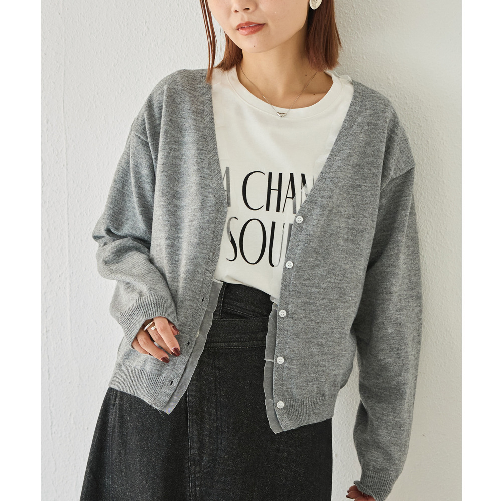 前立てと襟ぐりにあしらわれたオーガンジーの配色デザインが目を惹くニットカーディガン。