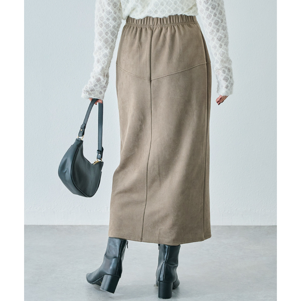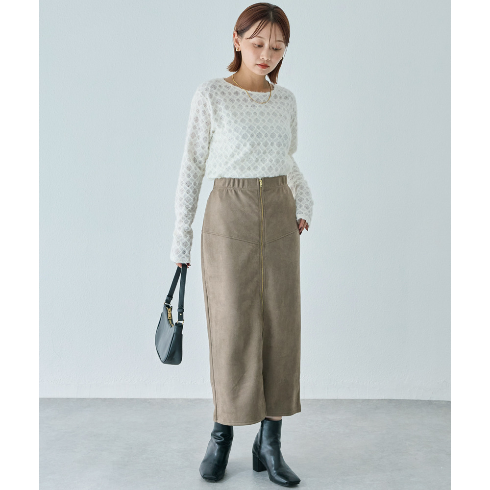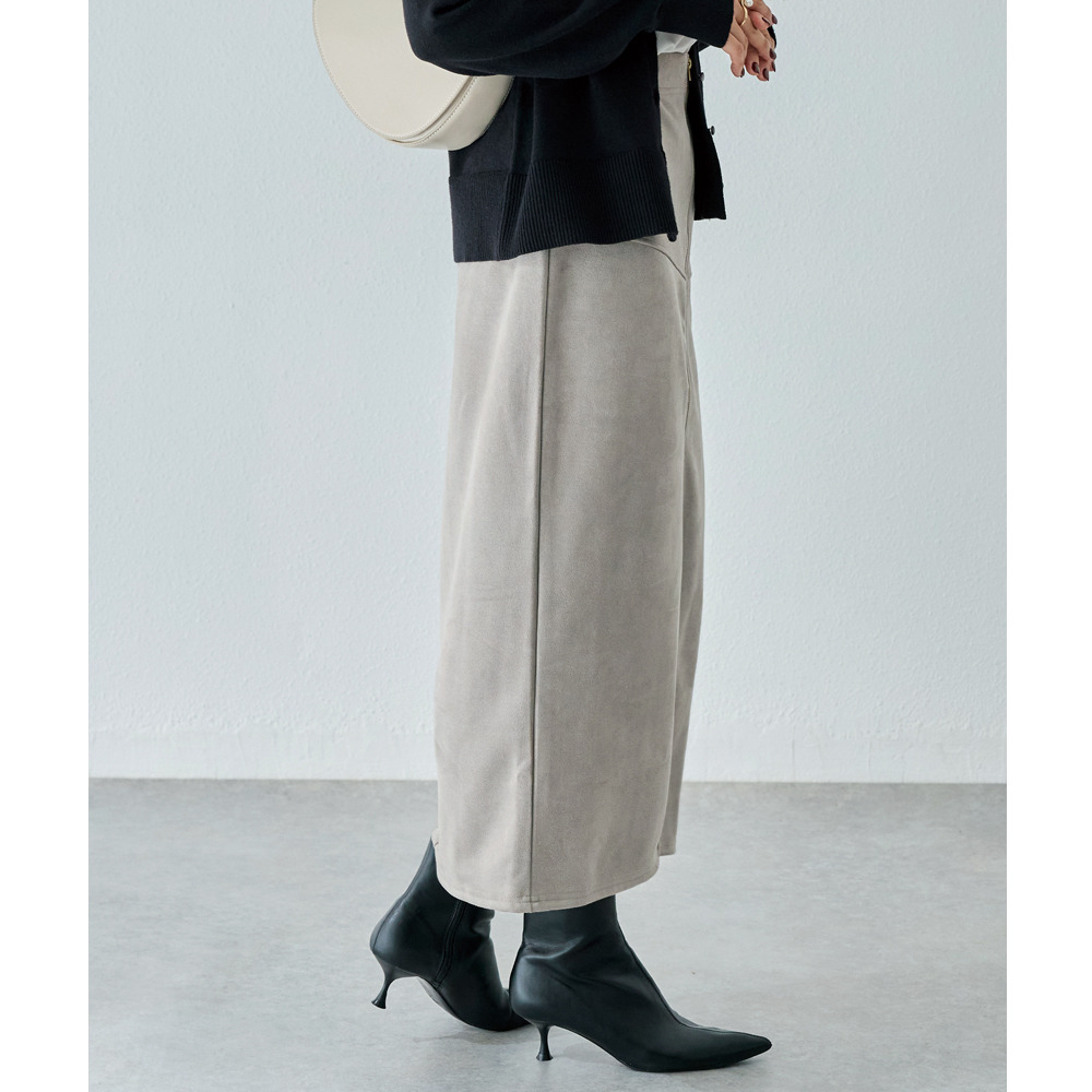 上品なカットスエード素材を使用し、フロントに大きなファスナーをあしらったデザインスカート。女性らしいタイトシルエットに仕上げました。