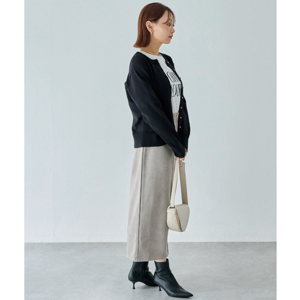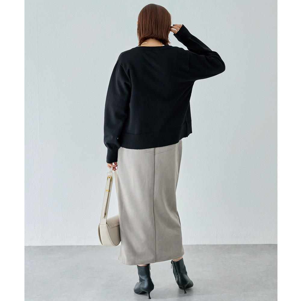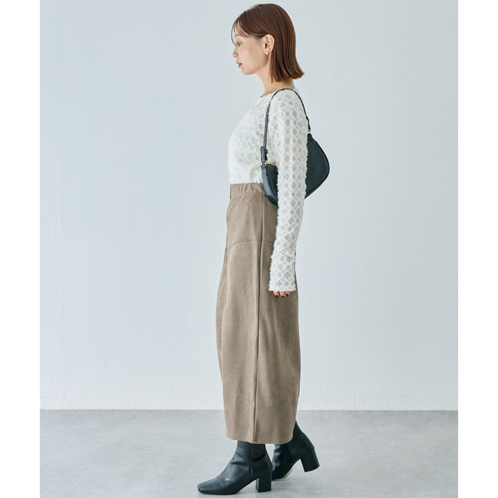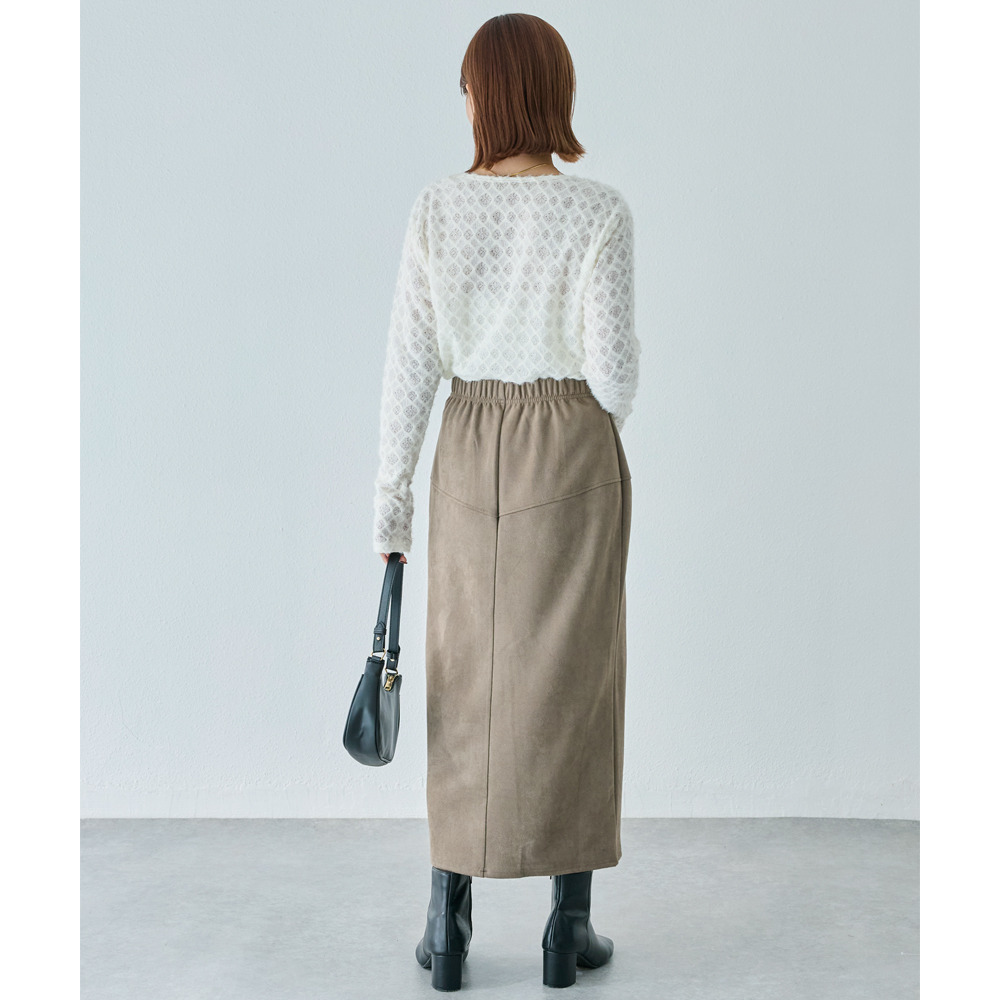 上品なカットスエード素材を使用し、フロントに大きなファスナーをあしらったデザインスカート。女性らしいタイトシルエットに仕上げました。