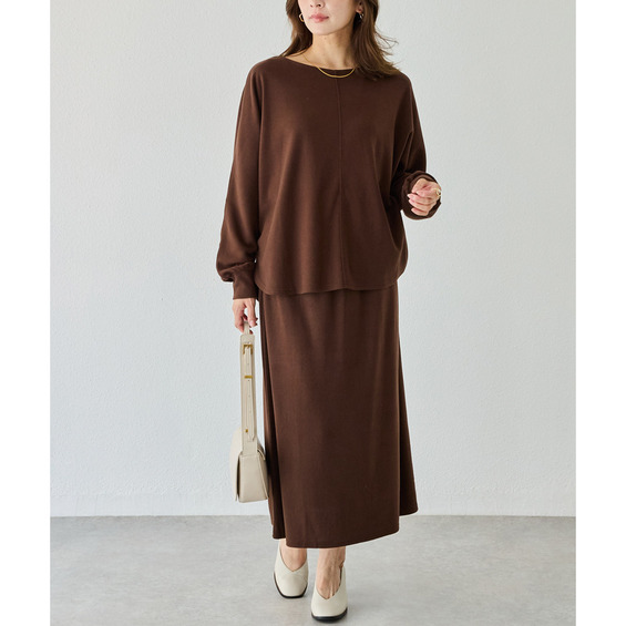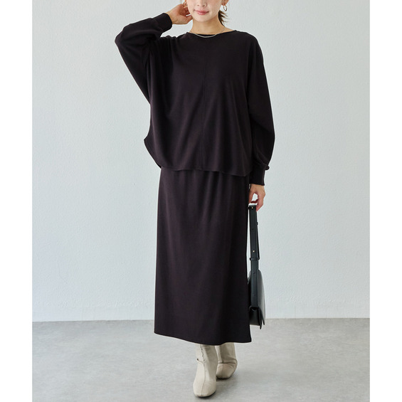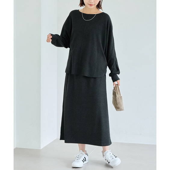程よく落ち感のあるドルマントップスとスカートのセットアップで、簡単にこなれたスタイリングが完成。