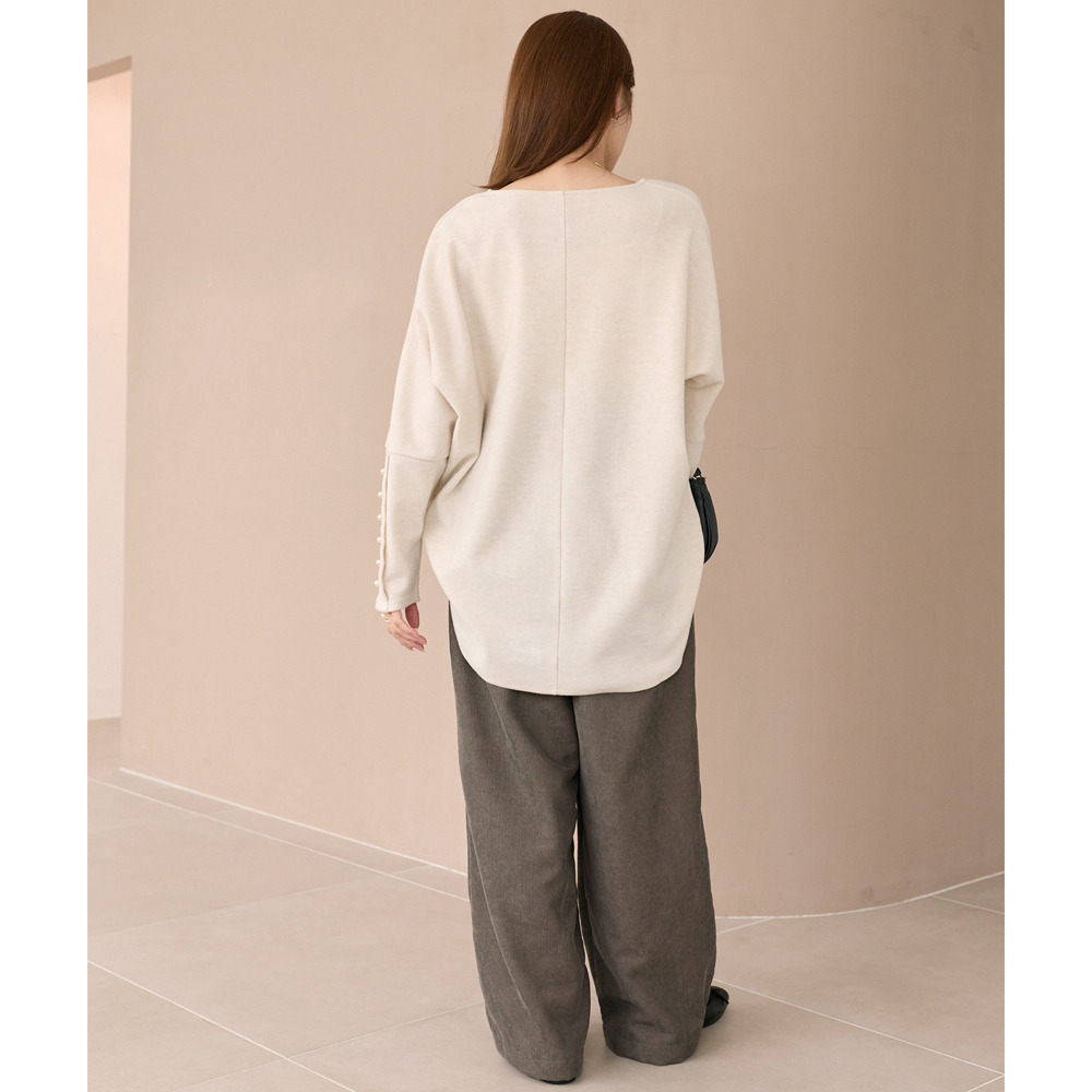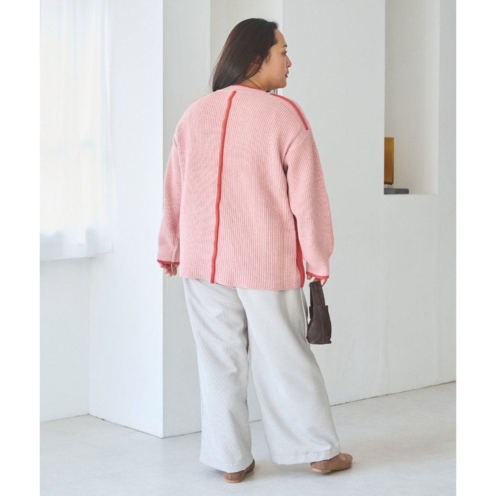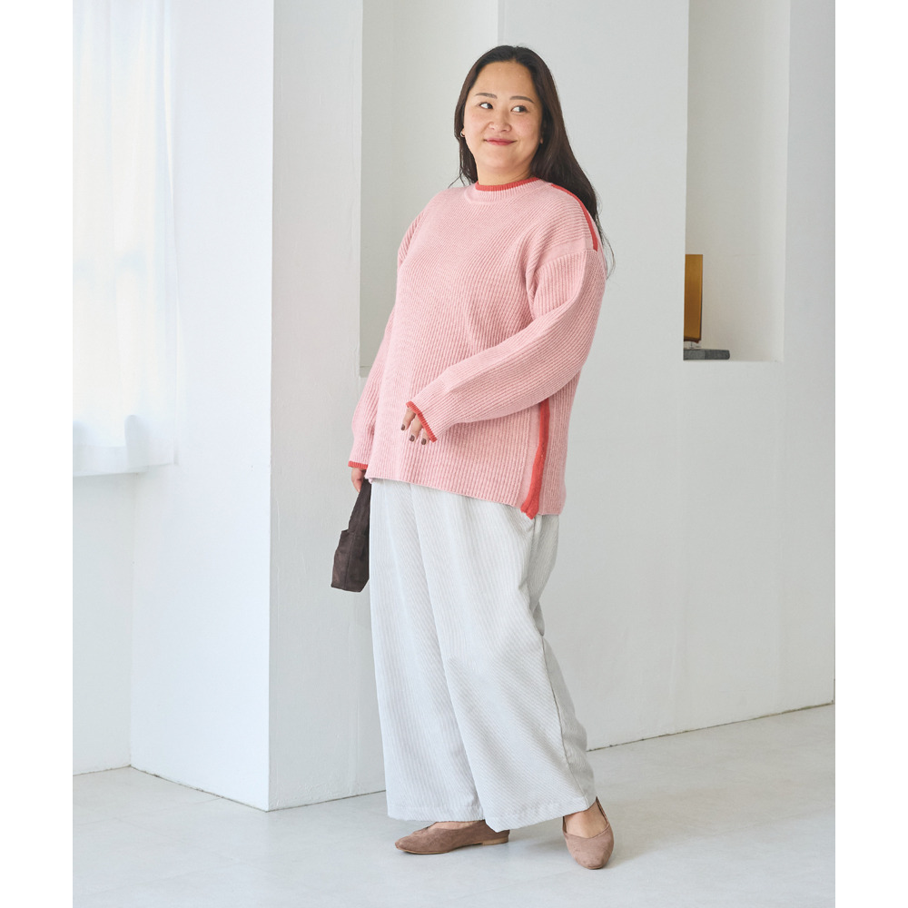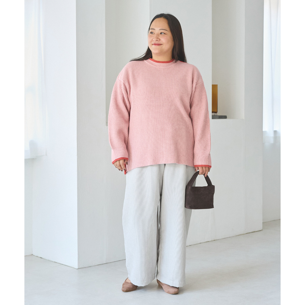 細かいリブが上品な印象を与え、カジュアルすぎず大人の余裕を感じる仕上がりに。