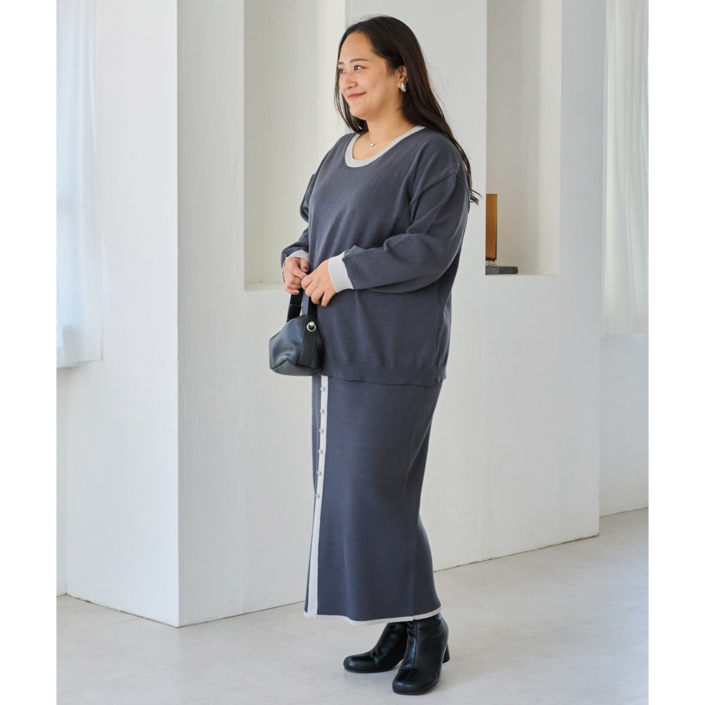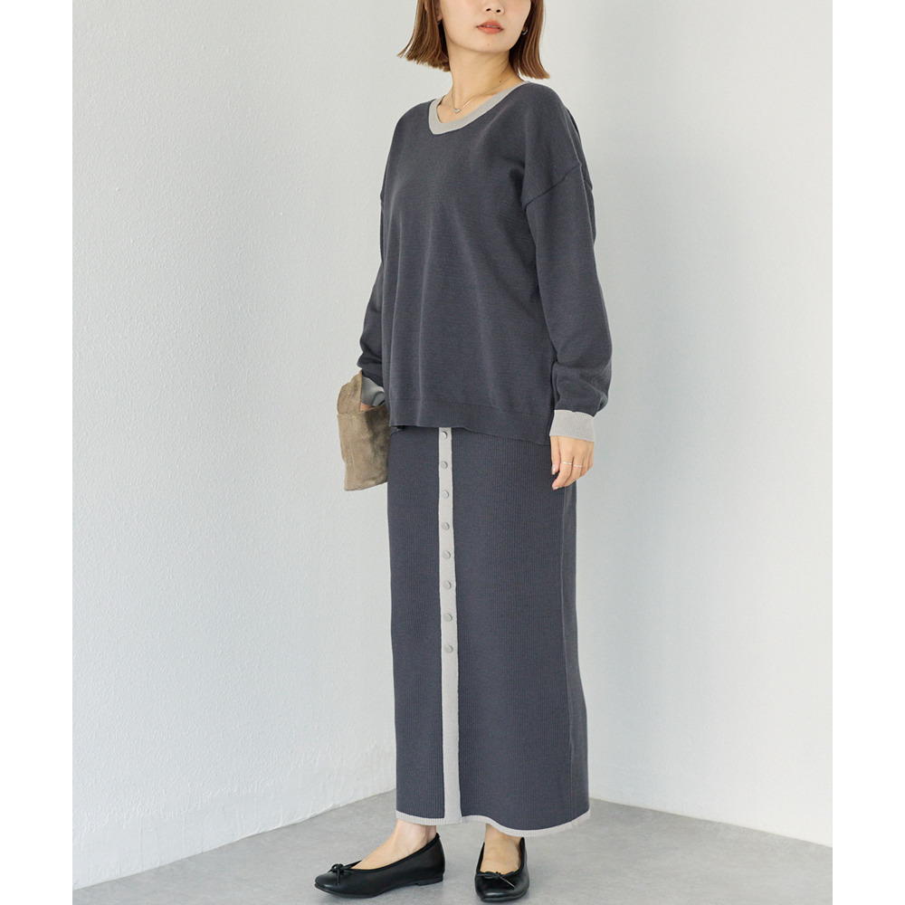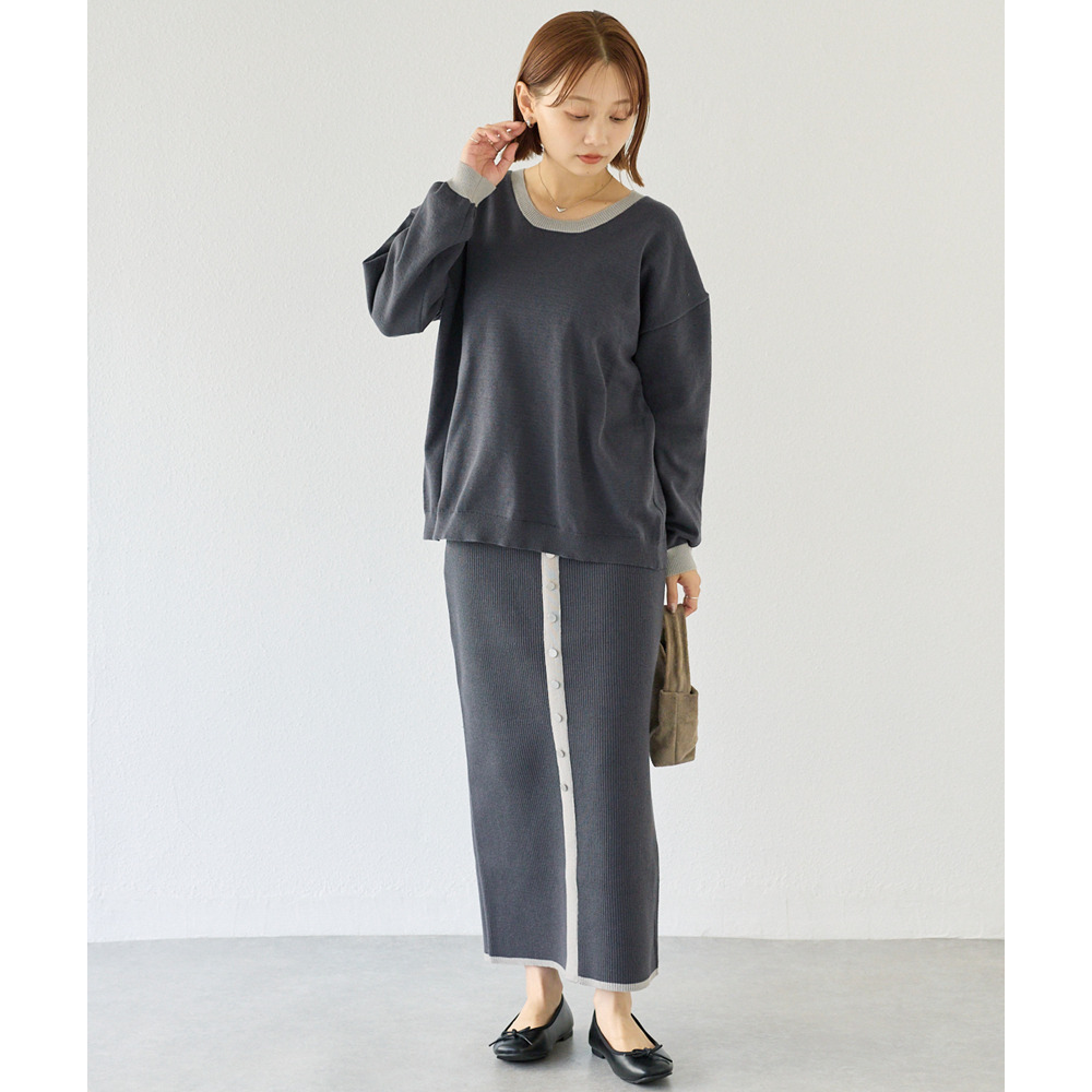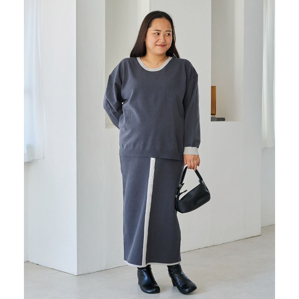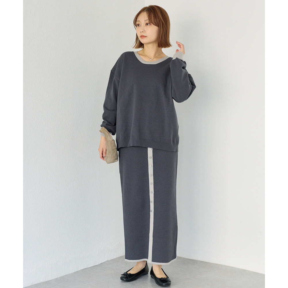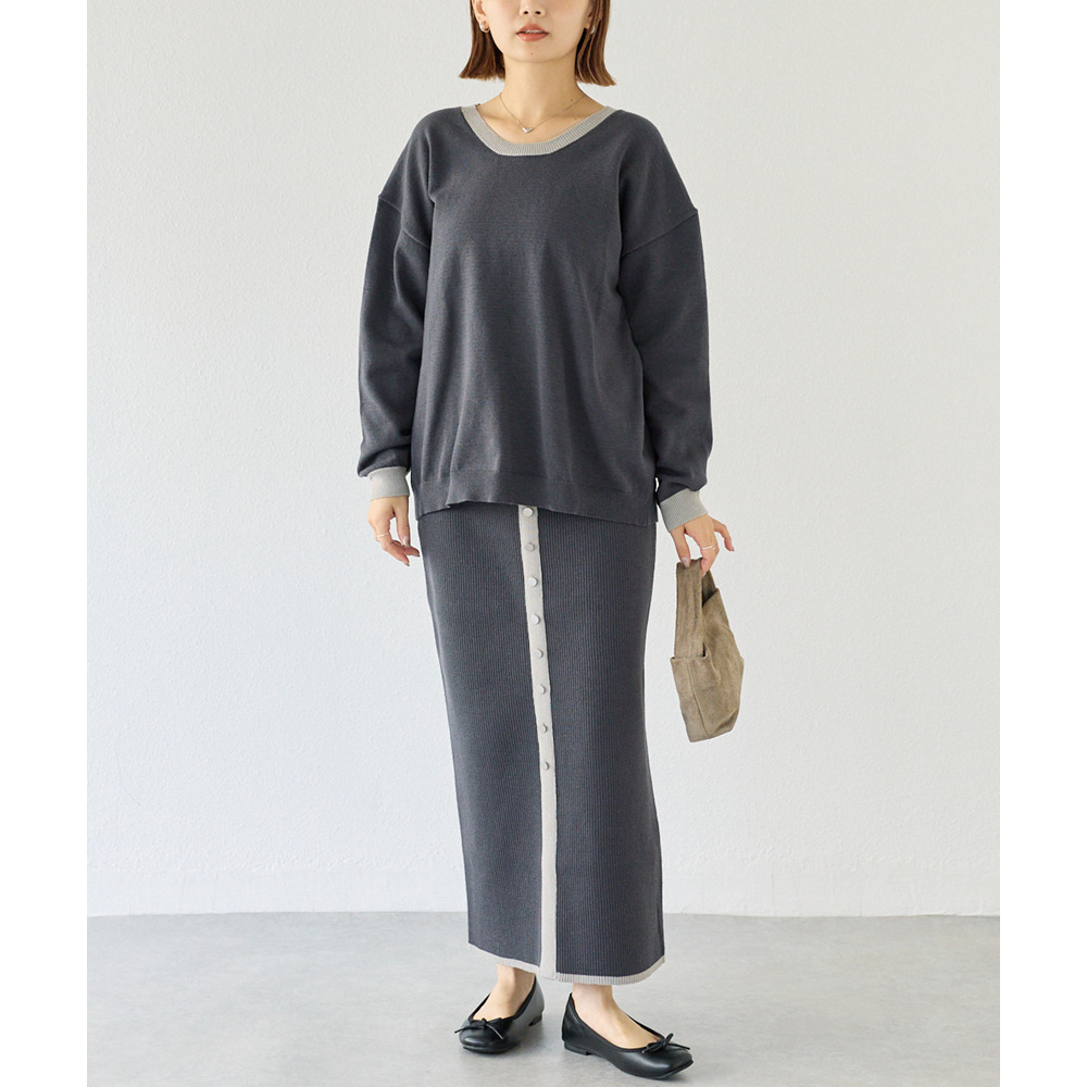 スカートは、リブ編みならではの表情が楽しめる、すっきりとしたナローシルエット。フロントの飾りボタンが上品で洗練された印象をプラスします。