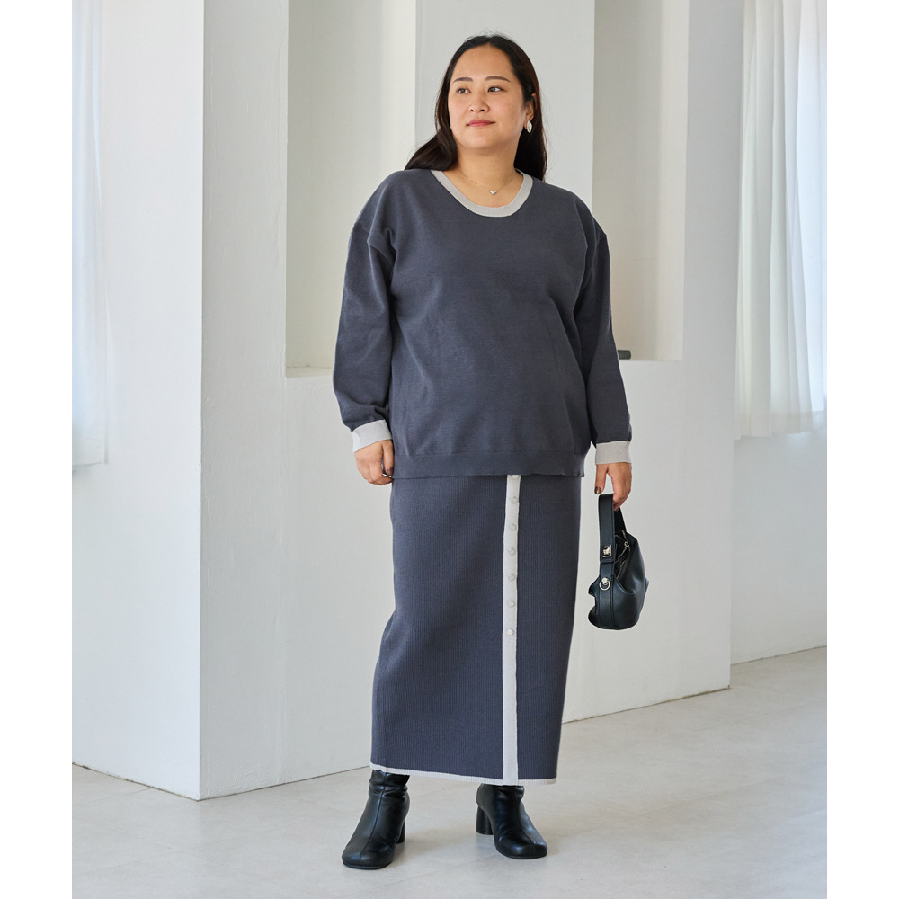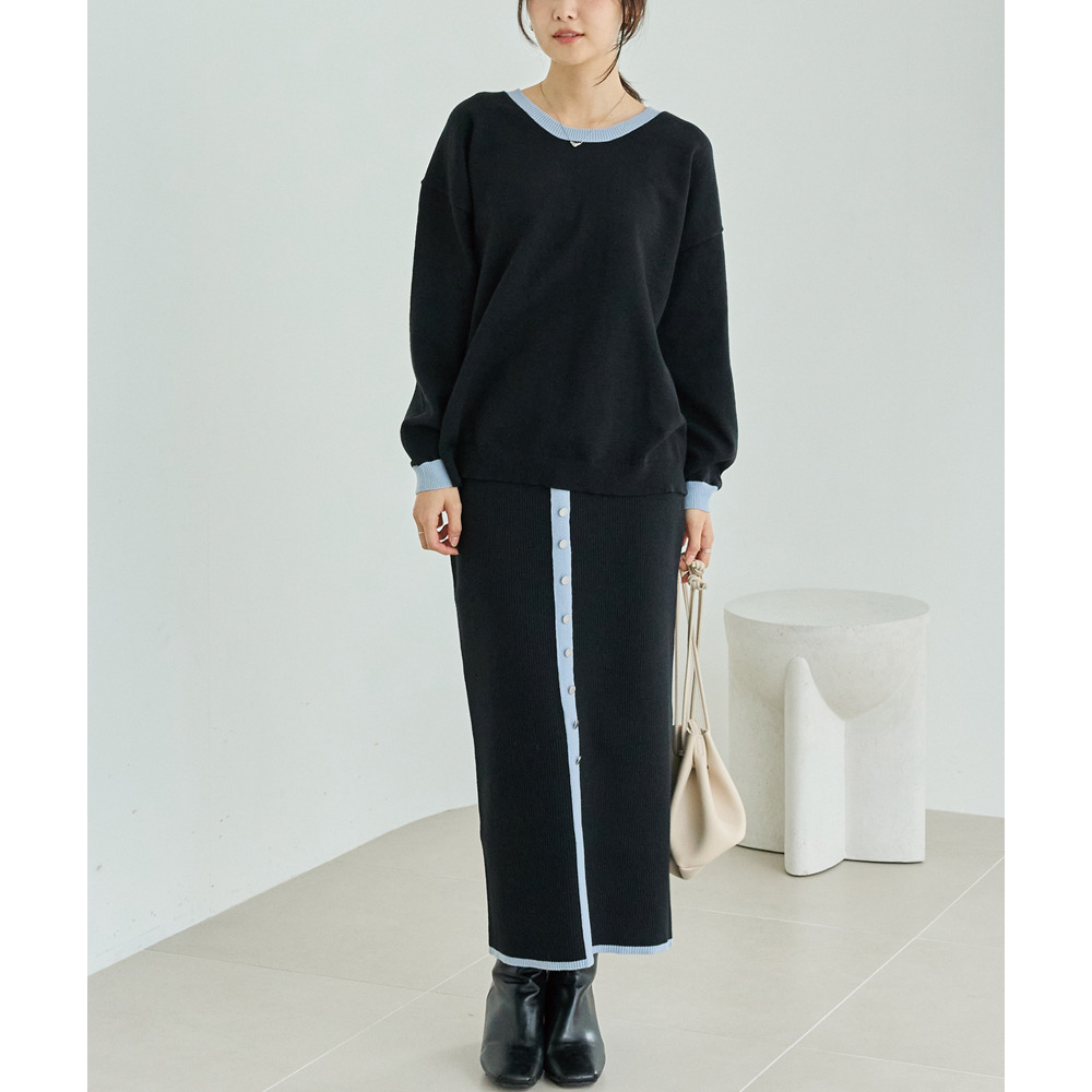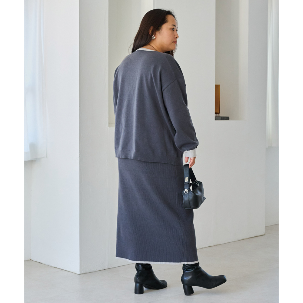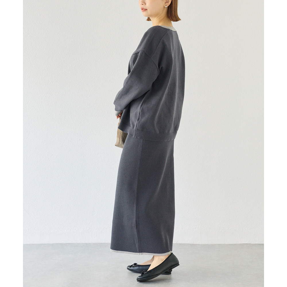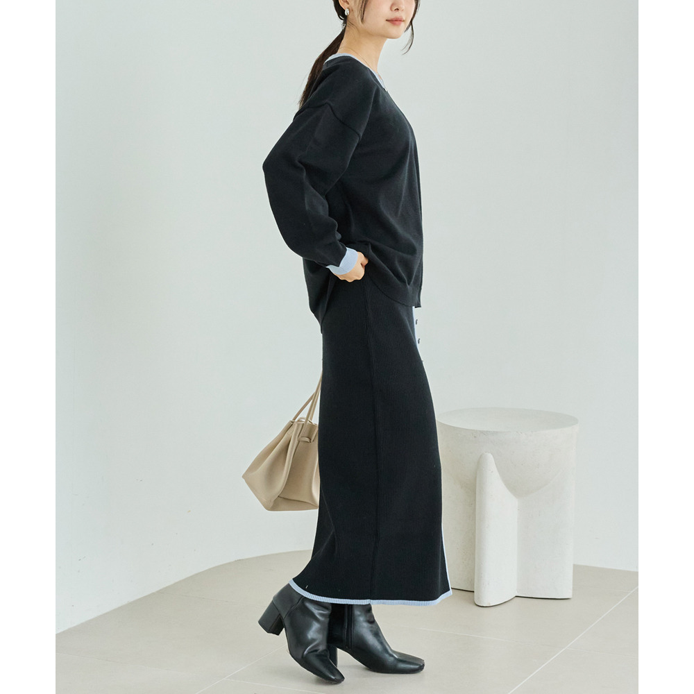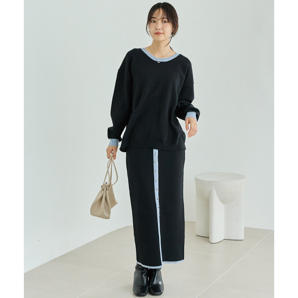 スカートは、リブ編みならではの表情が楽しめる、すっきりとしたナローシルエット。フロントの飾りボタンが上品で洗練された印象をプラスします。