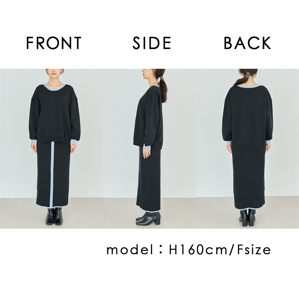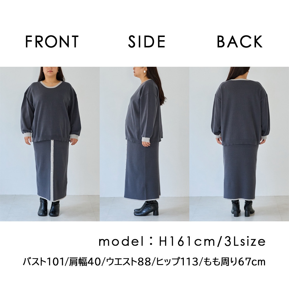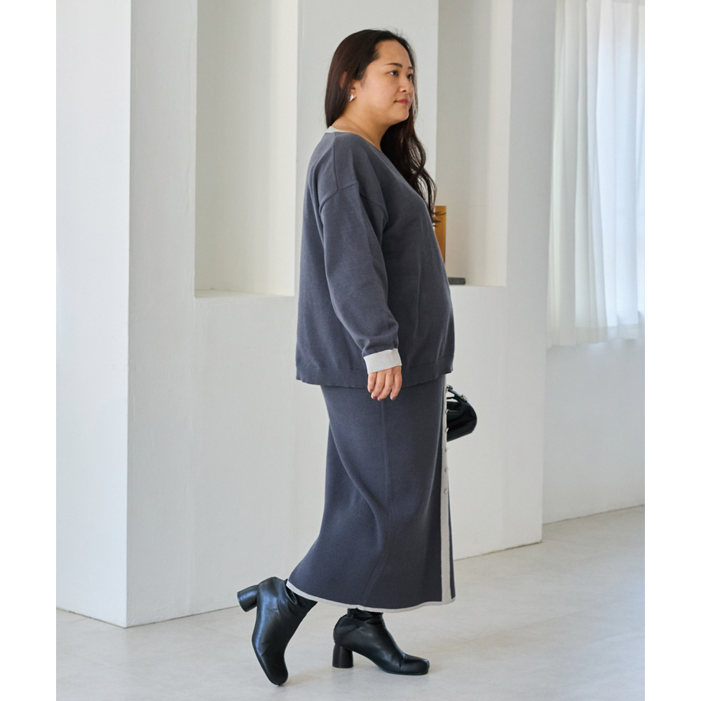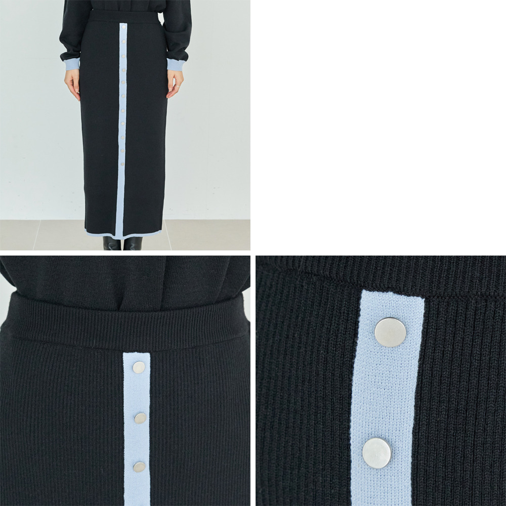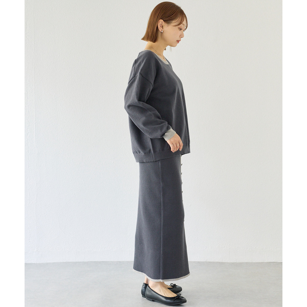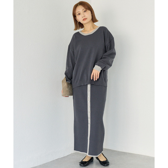 スカートは、リブ編みならではの表情が楽しめる、すっきりとしたナローシルエット。フロントの飾りボタンが上品で洗練された印象をプラスします。